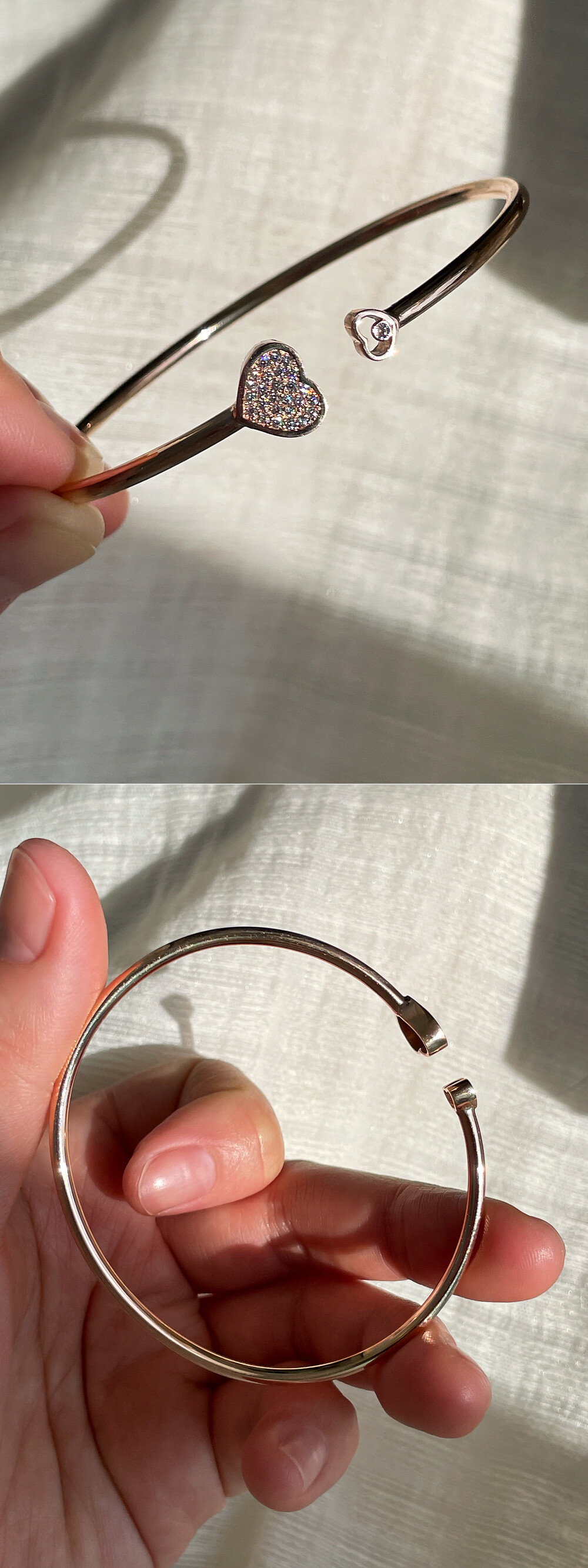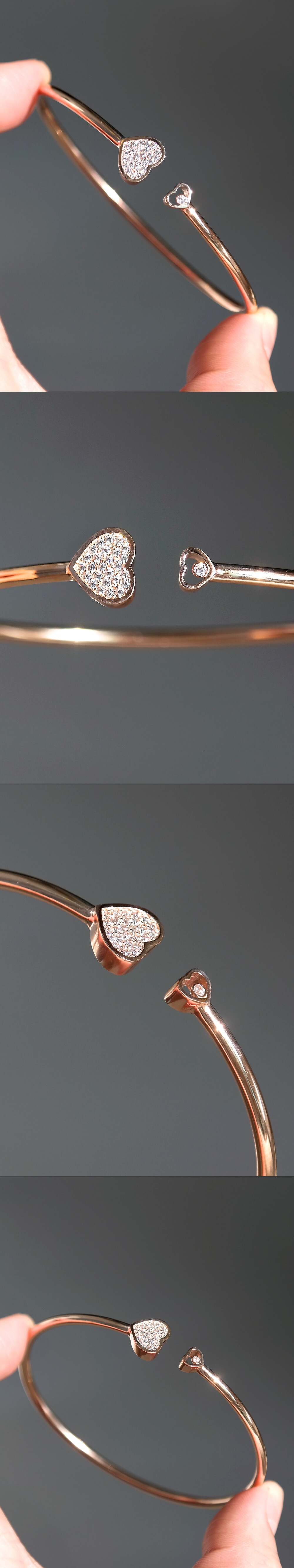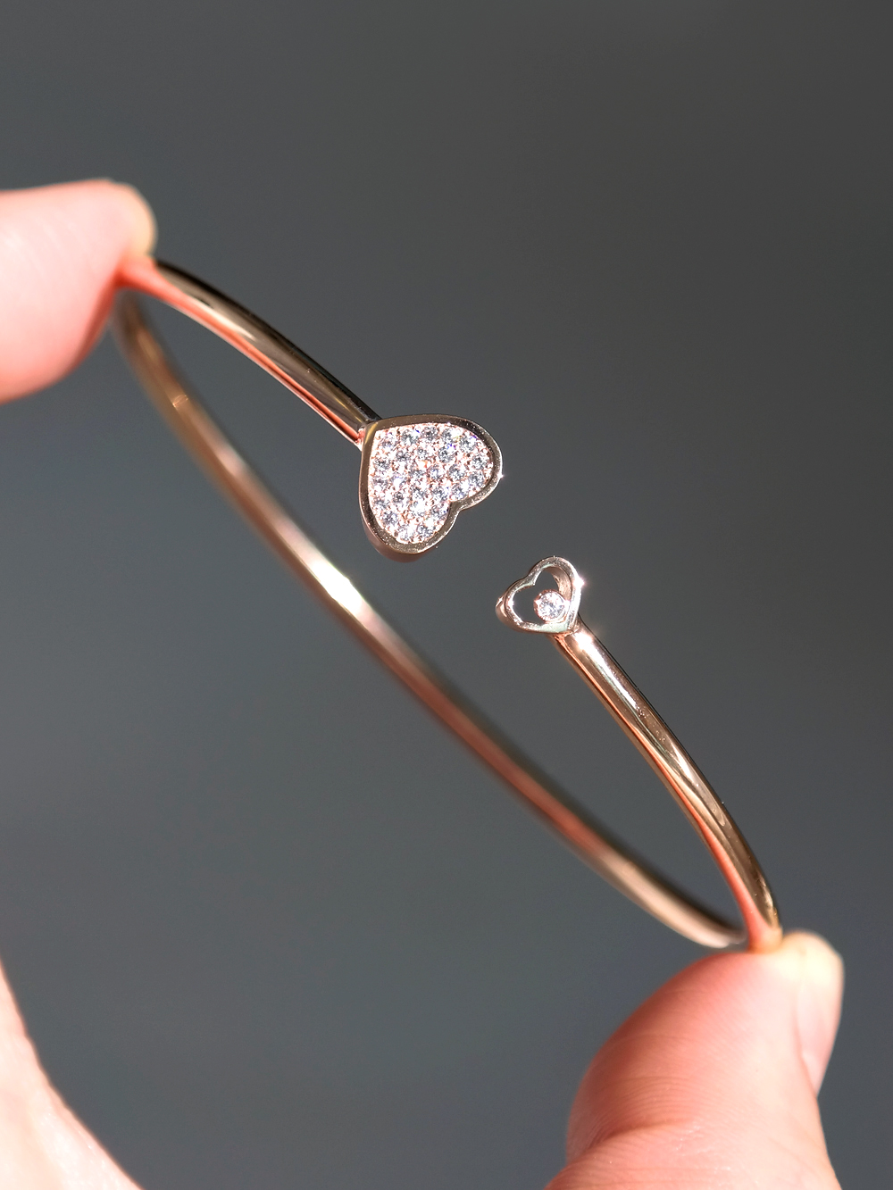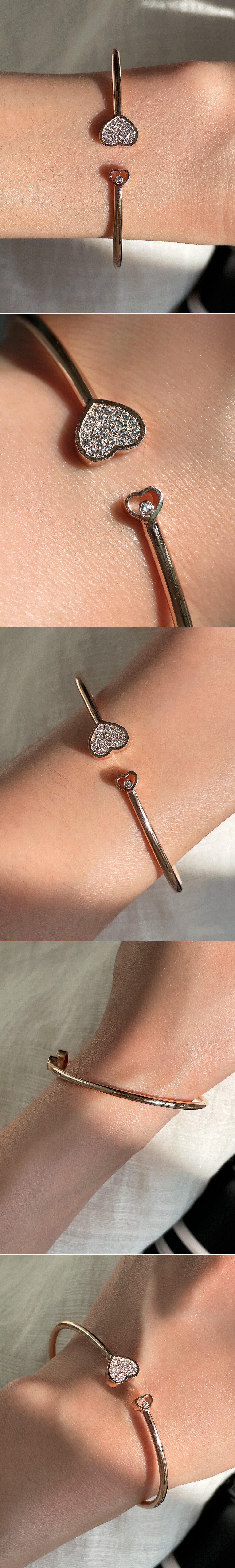 부드러운 하트 모티프에 섬세한 파베 세팅을 더해 사랑스러움과 고급스러움을 동시에 담아낸 오픈 뱅글 팔찌입니다. 한쪽에는 촘촘히 세팅된 하트 쉐입을, 다른 한쪽에는 미니멀한 하트 포인트를 배치해 과하지 않은 비대칭 디자인으로 세련된 균형감을 완성했습니다. 슬림한 뱅글 라인이 손목을 우아하게 감싸며 데일리 룩부터 특별한 날까지 자연스럽게 어우러집니다. 은은한 반짝임으로 오래도록 사랑받을 아이템으로 추천드립니다.
