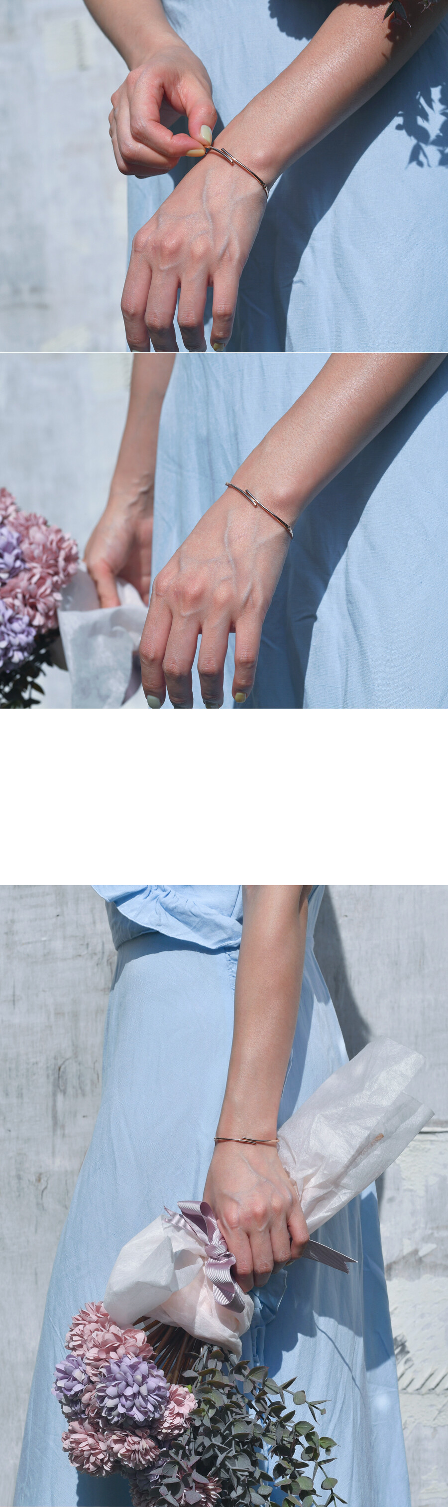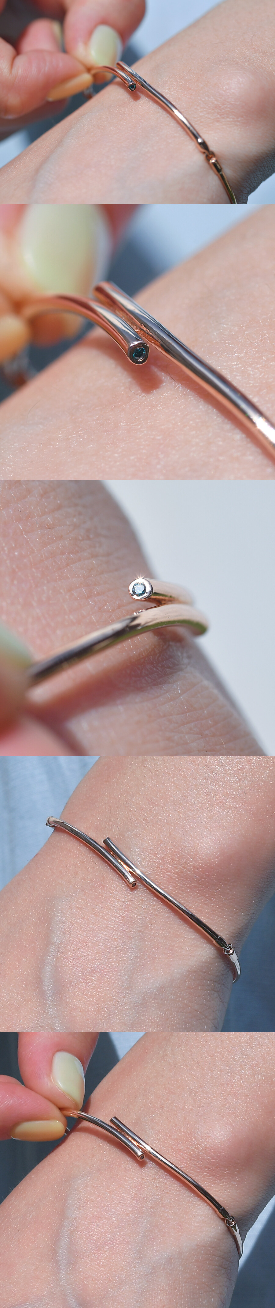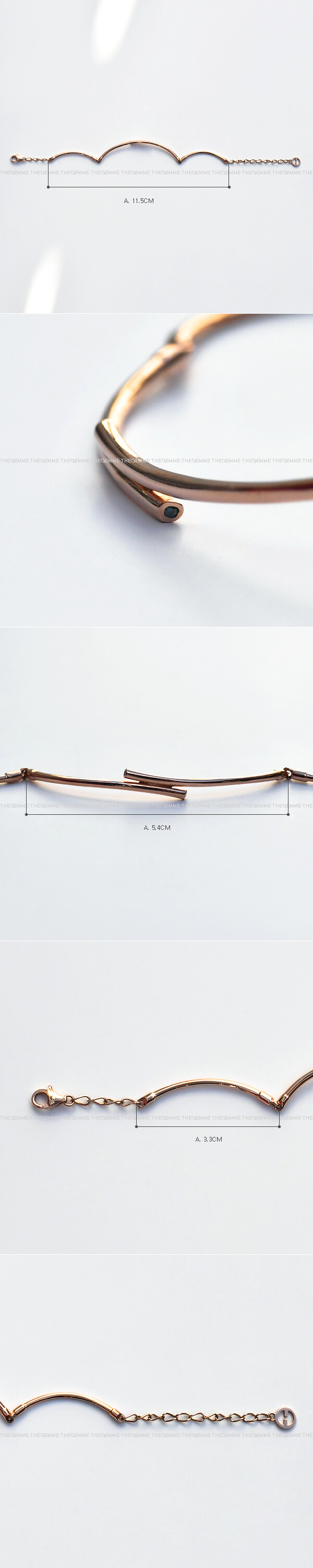 유니크한 스틱 디자인의 팔찌입니다. 파이프 라인의 튜브 모양을 갖춘 스틱과 체인이 연결된 형태이구요, 시크릿 디자인으로 팔찌 중앙의 포인트 부분을 자세히 보시면 멜리 사이즈의 블루 다이아몬드가 감쪽같이 숨어있답니다. 단조로우면서 특이한 디자인으로 데일리 및 포인트 팔찌로 추천해 드릴게요 :)