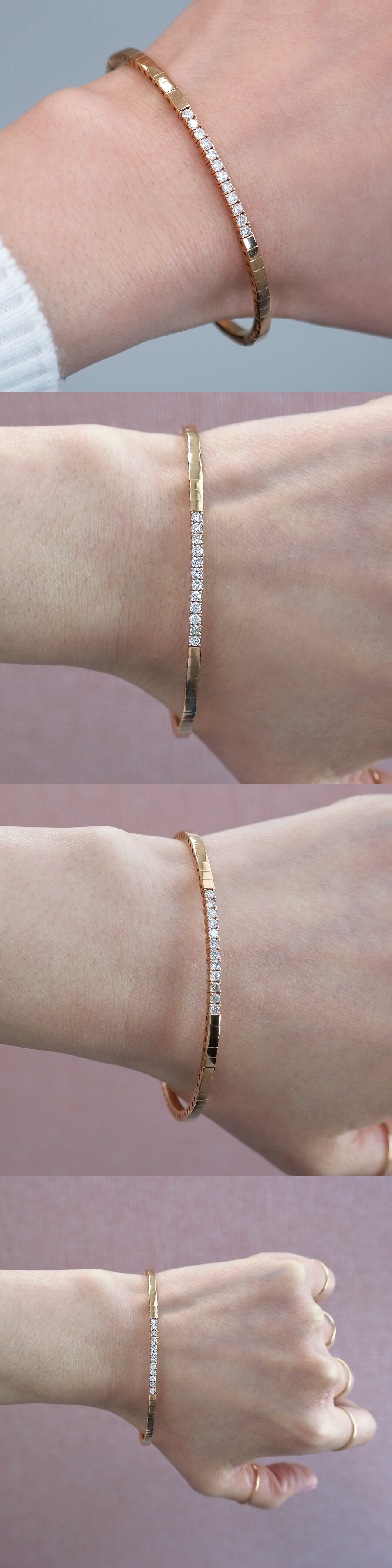 유니크하면서 깔끔한 뱅글 스타일의 테니스 팔찌입니다. 뱅글의 중간 부분에 포인트 스타일로 큐빅이 세팅되었구요, 나머지 부분은 민자 디자인입니다. 뱅글 부분이 독특하게 움직이는 유연한 스타일로 착용감도 아주 좋아요. (동영상을 첨부하였으니 동영상도 꼭 확인해 주세요.) 기본 네발 프롱으로 깔끔하게 제작된 스타일이라 프롱이나 마감 디테일도 군더더기 없이 아주 깔끔하답니다. 전체적으로 퀄리티가 너무 좋은 아이라 매일매일 착용하실 데일리 및 포인트 뱅글로 추천해 드릴게요. 🩷