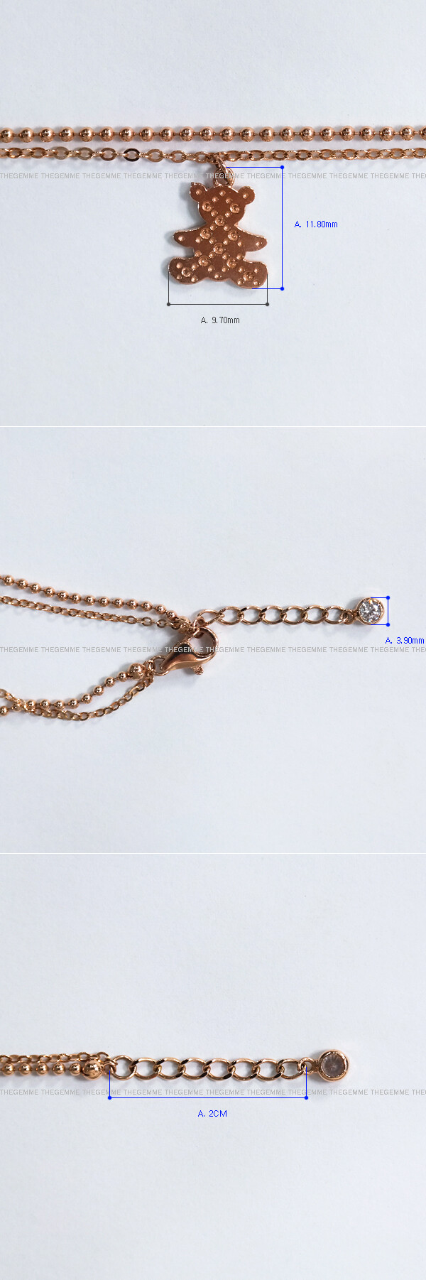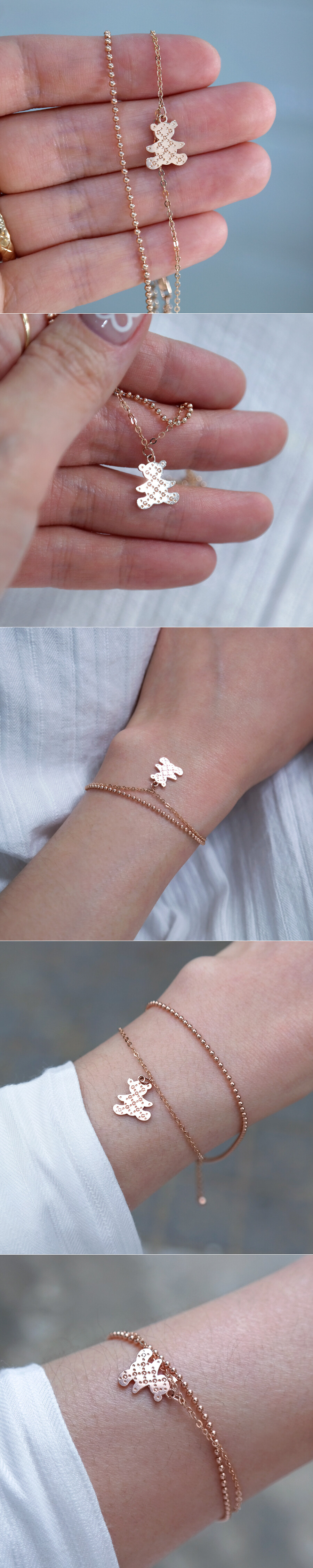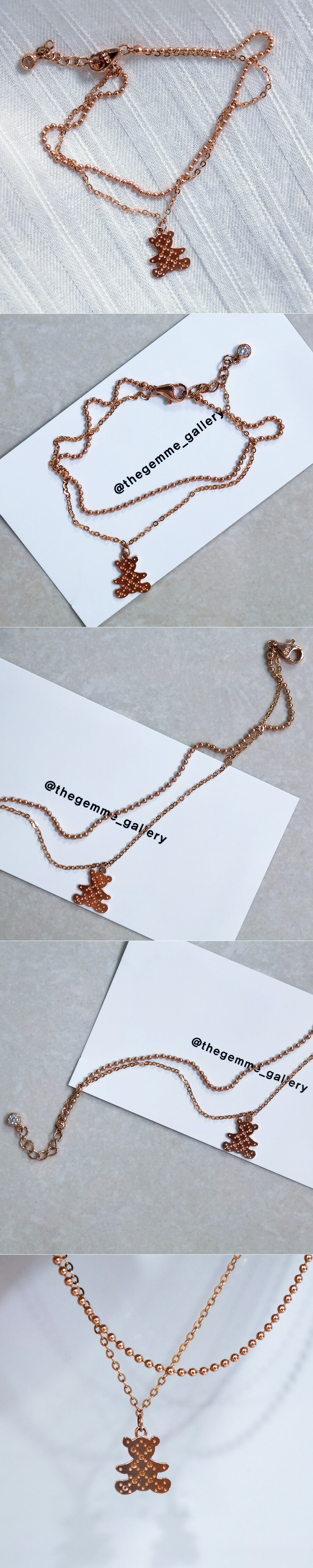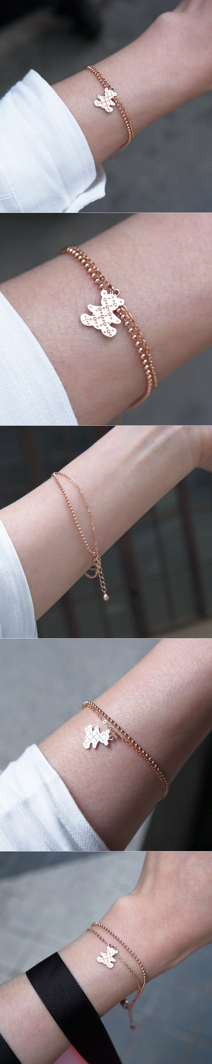 귀여운 곰돌이 팬던트가 달린 두줄 디자인의 팔찌입니다. 체인은 약 1.5mm의 볼 체인과 약 1.3mm의 모줄 체인으로 레이어드 되었어요. 볼드한 느낌으로 착용하실 포인트 팔찌로 추천해 드릴게요 :)