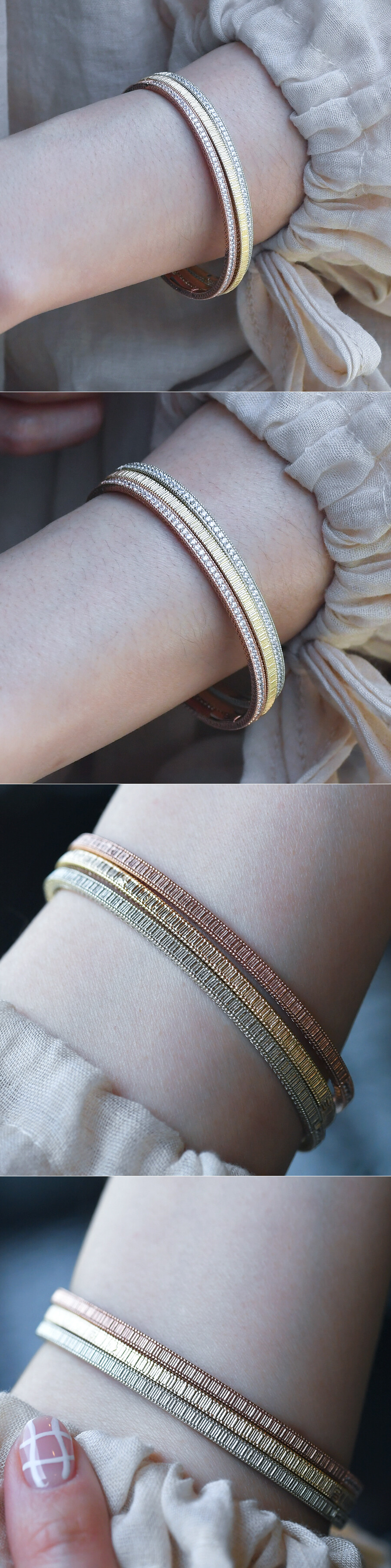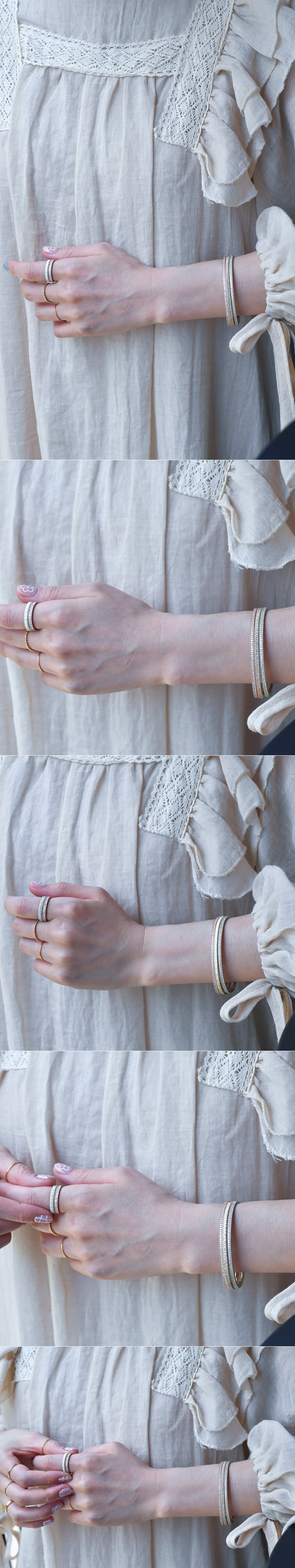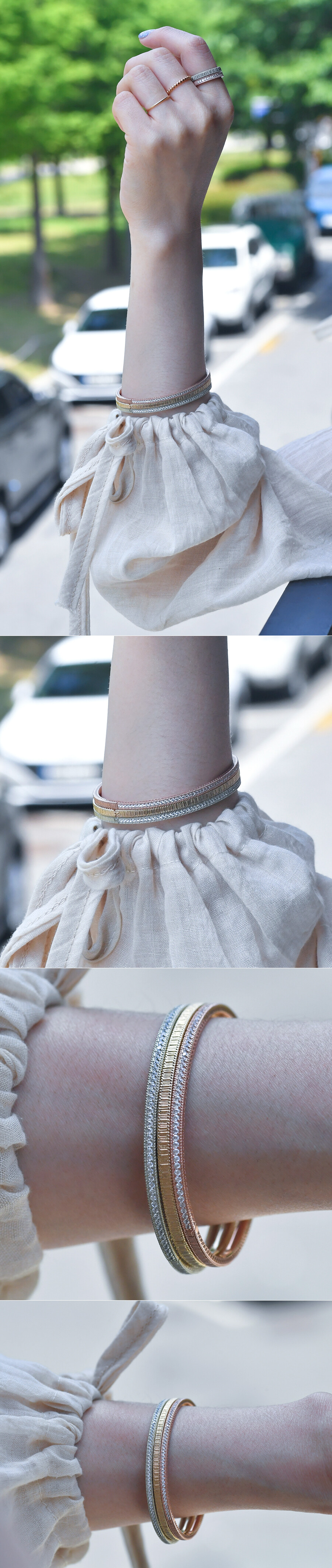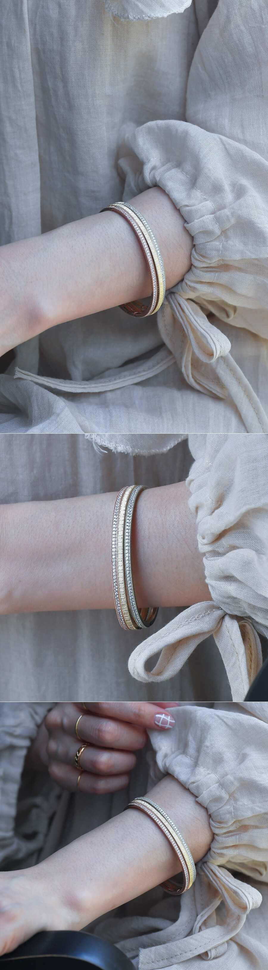 고급스럽고 유니크한 디자인의 뱅글 팔찌입니다. 심플하면서도 세련된 느낌을 주는 빗살 문양의 외관으로 은은한 금속의 광택을 보여주는 아이에요. 정교한 문양이 들어간 반지의 측면 디자인도 보면 볼수록 매력적으로 눈에 들어온답니다. 민자 디자인과 큐빅 디자인 두 가지 타입으로 나뉘며 큐빅 디자인의 경우 ; 하프 스타일로 뱅글의 절반인 윗부분은 큐빅 디자인, 나머지 절반의 하단 부분은 민자 디자인입니다 :) 전체적으로 마감 디테일도 군더더기 없이 아주 깔끔해서 퀄리티가 너무 좋은 아이에요. * 2중 잠금 장식 스타일로 딸깍, 딸깍하고 안에서 두 번 잠기는 디자인입니다. 잠금 장식 부분 디테일 동영상을 첨부하였으니 동영상도 꼭 확인해 주세요. ♥ * 기본 설정가는 (큐빅 디자인) 으로 되어있습니다. 각각 가격이 다르므로 자세한 가격은 옵션에서 디자인 및 함량 & 사이즈를 선택하셔서 확인해 주세요.