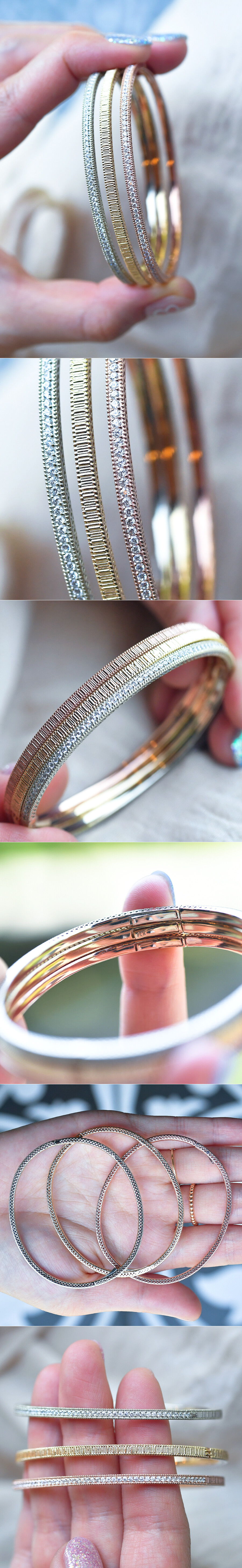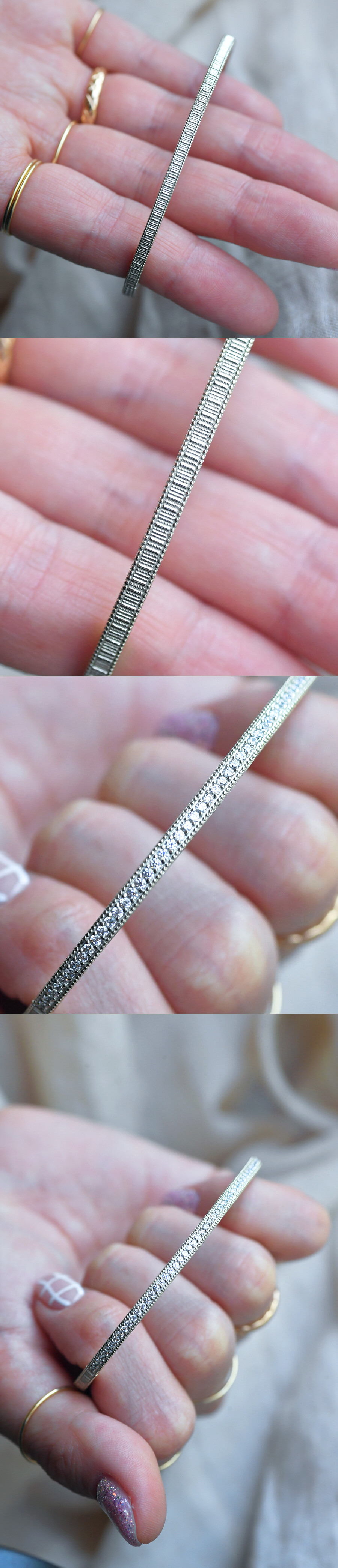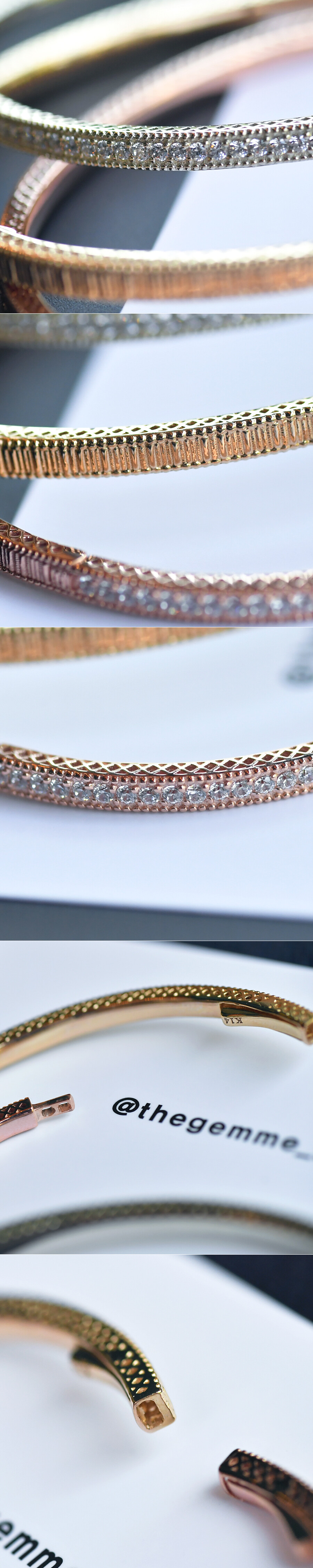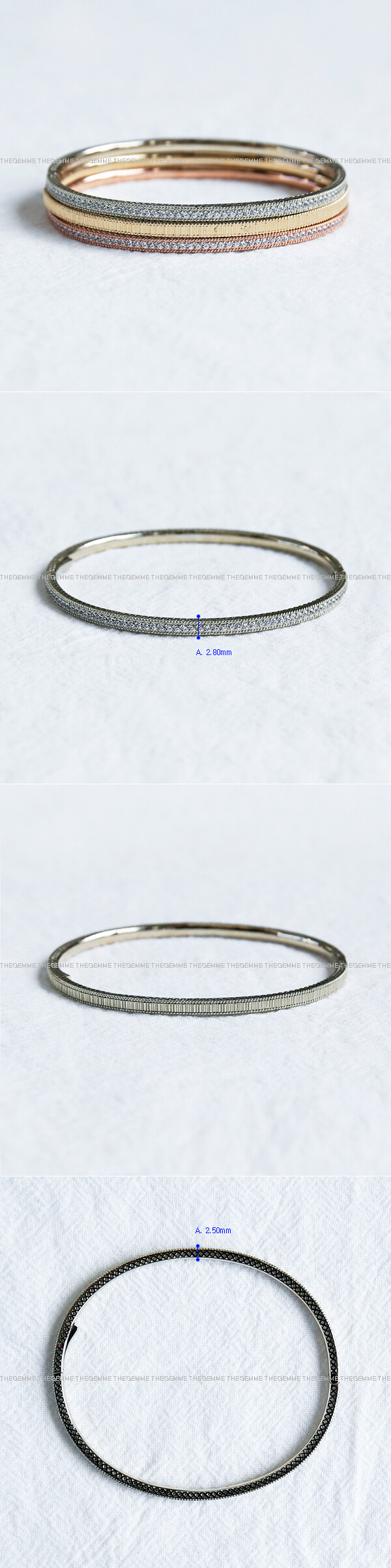 고급스럽고 유니크한 디자인의 뱅글 팔찌입니다. 심플하면서도 세련된 느낌을 주는 빗살 문양의 외관으로 은은한 금속의 광택을 보여주는 아이에요. 정교한 문양이 들어간 반지의 측면 디자인도 보면 볼수록 매력적으로 눈에 들어온답니다. 민자 디자인과 큐빅 디자인 두 가지 타입으로 나뉘며 큐빅 디자인의 경우 ; 하프 스타일로 뱅글의 절반인 윗부분은 큐빅 디자인, 나머지 절반의 하단 부분은 민자 디자인입니다 :) 전체적으로 마감 디테일도 군더더기 없이 아주 깔끔해서 퀄리티가 너무 좋은 아이에요. * 2중 잠금 장식 스타일로 딸깍, 딸깍하고 안에서 두 번 잠기는 디자인입니다. 잠금 장식 부분 디테일 동영상을 첨부하였으니 동영상도 꼭 확인해 주세요. ♥ * 기본 설정가는 (큐빅 디자인) 으로 되어있습니다. 각각 가격이 다르므로 자세한 가격은 옵션에서 디자인 및 함량 & 사이즈를 선택하셔서 확인해 주세요.