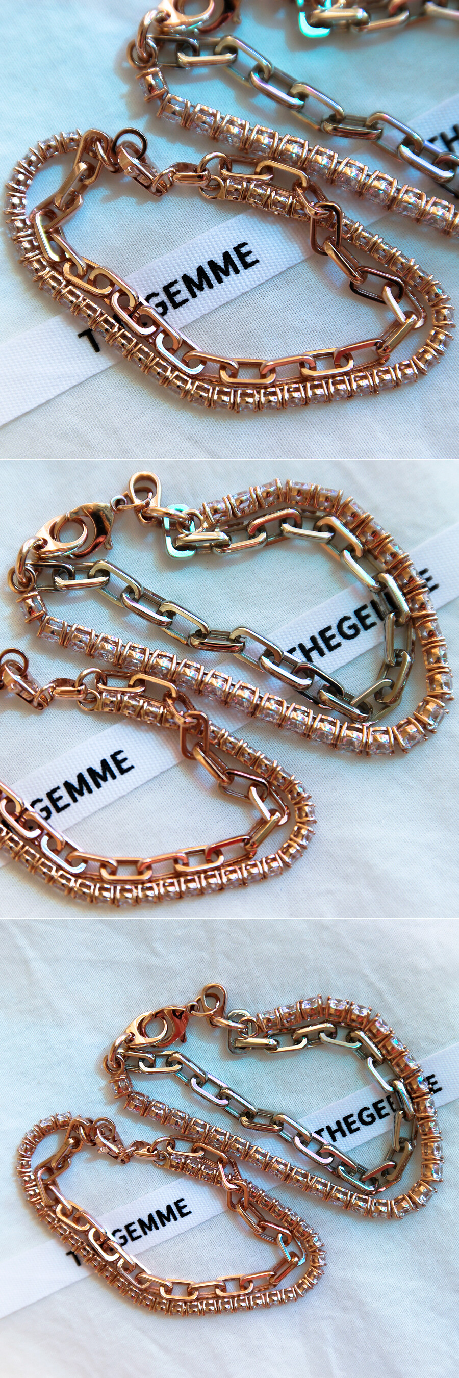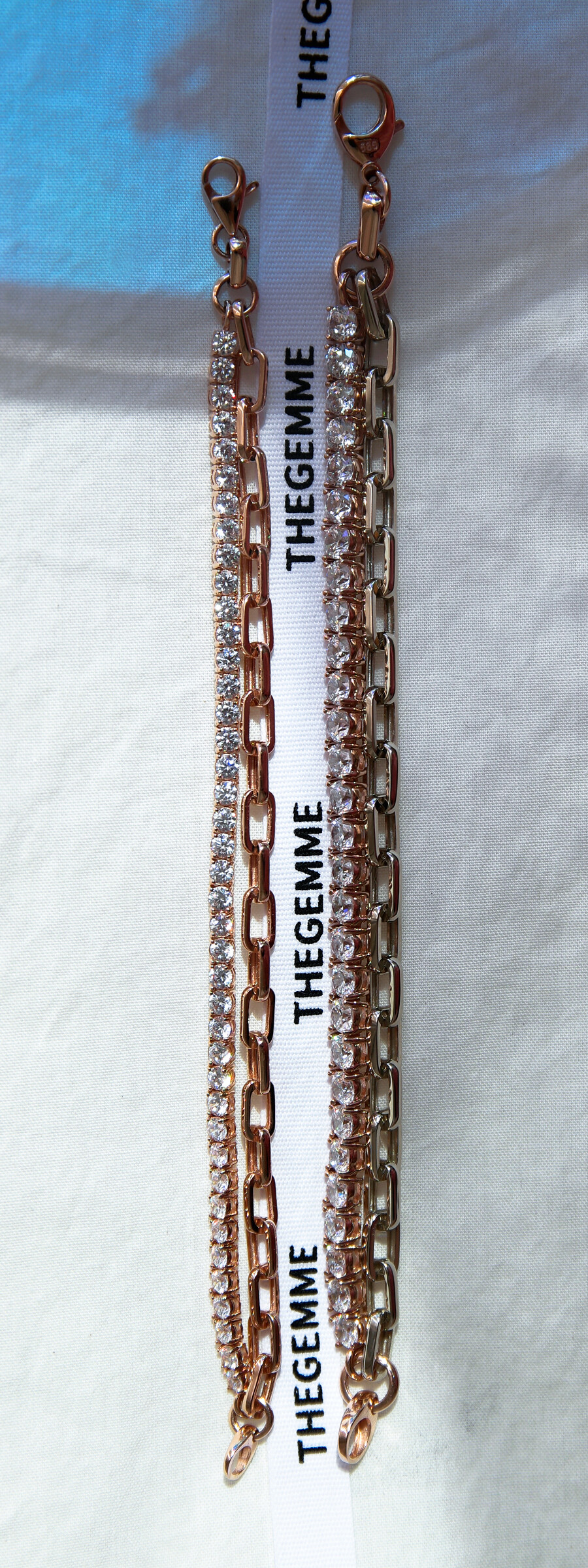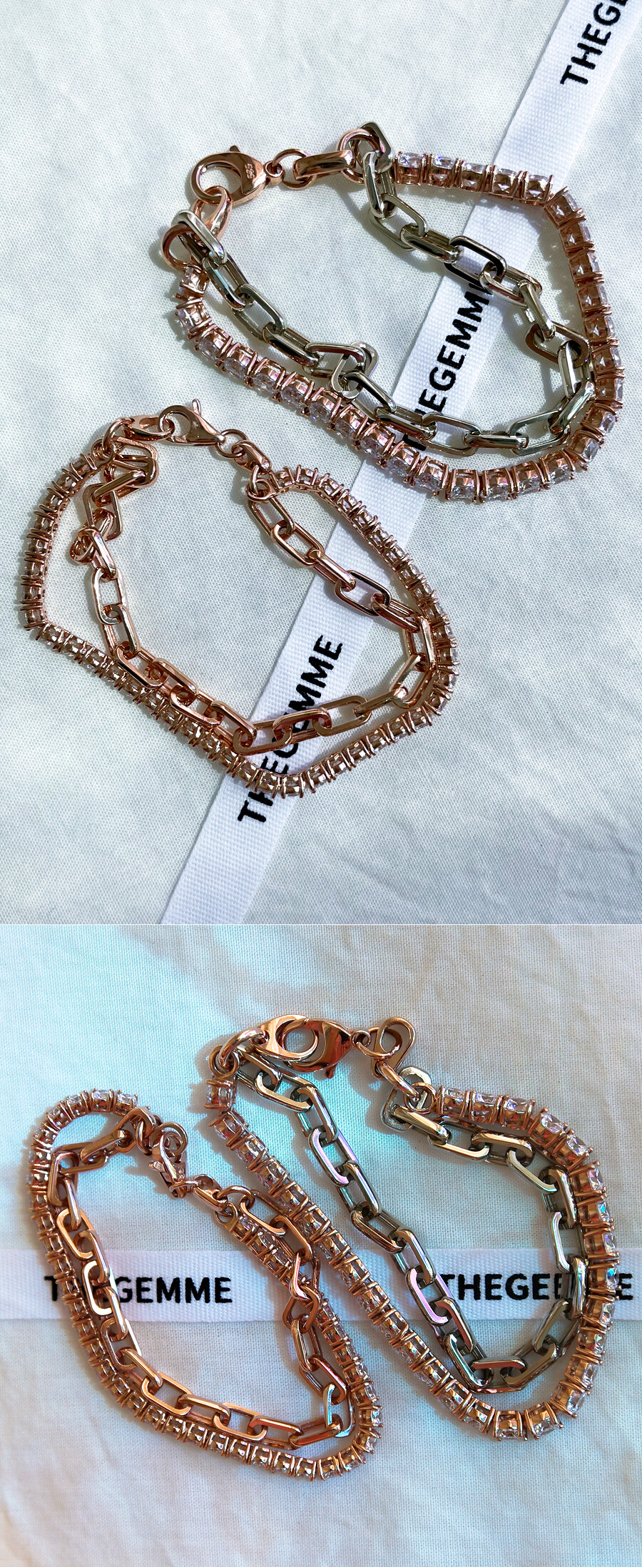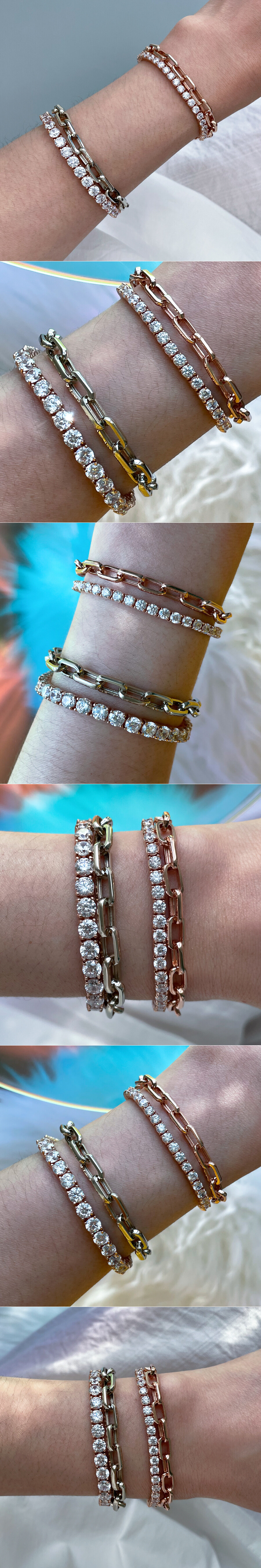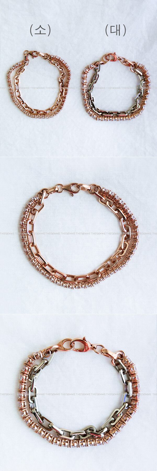 유니크하면서 아주 볼드한 두줄 스타일의 테니스 팔찌입니다. 테니스 팔찌에 두꺼운 크기의 링크 체인이 함께 레이어드 된 디자인이구요, 사이즈는 (Q2mm/소) 사이즈와 (Q3mm/대) 사이즈로 나뉩니다. 기본 골드 색상은 투톤 디자인이구요, 테니스 라인과 체인 부분 각각 다르게 선택하셔서 주문 가능하십니다. (포인트 골드 색상은 체인 부분으로 [ 포인트 골드색상 - 체인부분 ] 옵션에서 따로 선택해 주세요.) 전체적으로 중량감이 많이 나가는 아이라 존재감 확실하면서 안정감도 있어서 데일리 및 포인트 팔찌로 착용하시기 좋습니다. 특히, 큼직큼직한 거 좋아하시는 분들에게는 요 아이 적극 추천해 드릴게요! ♥ * 기본 설정가는 "(Q2mm/소) 사이즈" 로 되어있습니다. 디자인과 사이즈에 따라 가격이 다르므로 자세한 가격은 옵션에서 디자인 및 함량 & 사이즈를 선택하셔서 확인해 주세요.