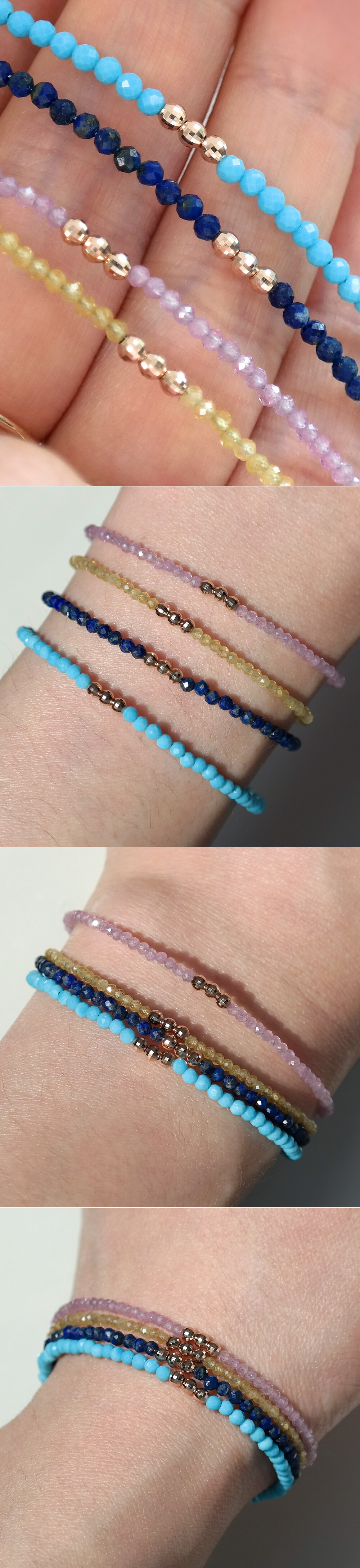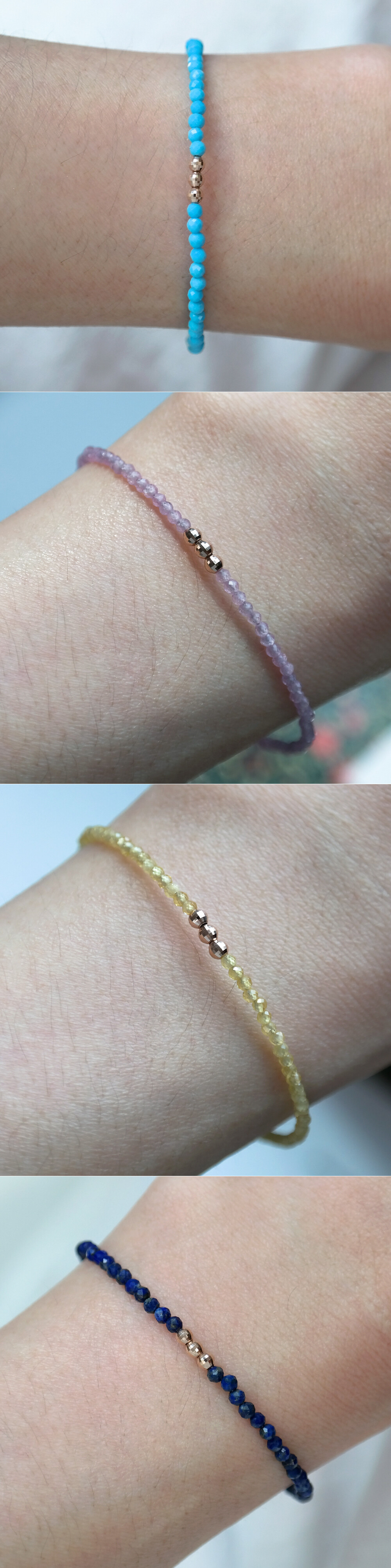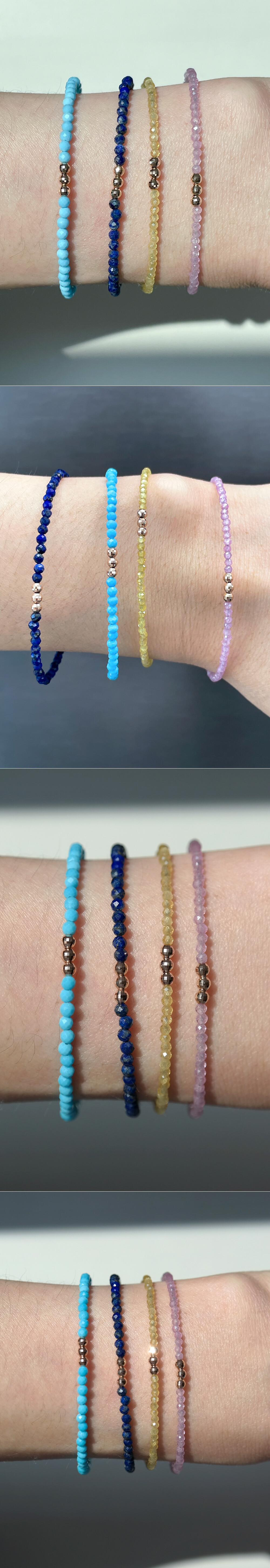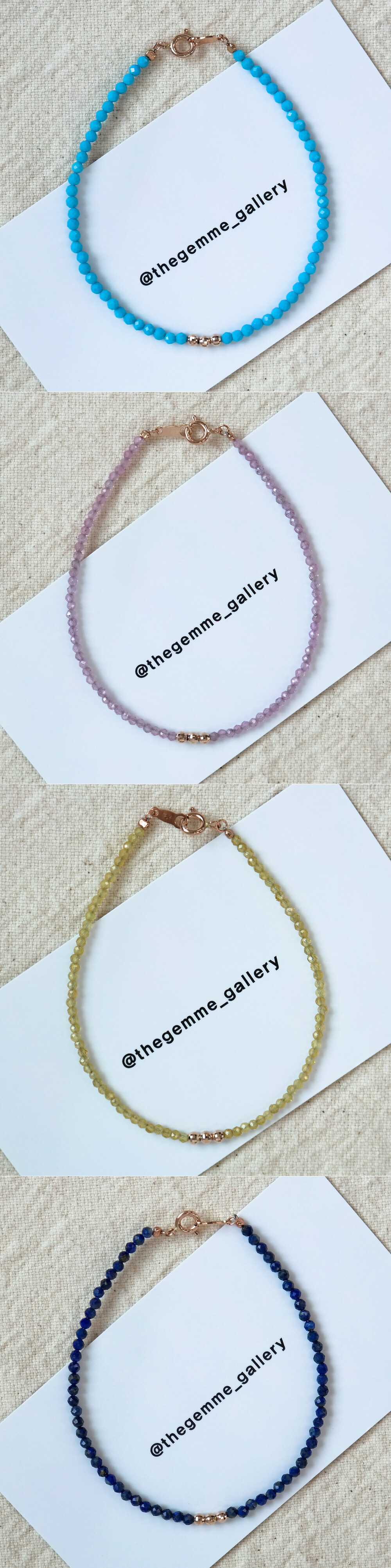 블리블리하고 화사한 느낌으로 착용하시기 좋은 원석 팔찌입니다, !!!!! ❤️ 론델컷으로 컷팅된 원석에 14K 컷팅 볼이 포인트로 들어간 비즈 팔찌에요. 원석은 하울라이트, 사파이어 (옐로우 & 핑크), 래피스래줄라이 원석입니다. 약 2~3mm 사이즈의 원석이구요, 원석에 따라서 아주 약간씩은 사이즈가 상이하니 자세한 사이즈는 상세 사이즈 이미지에서 확인해 주세요. ☺️ 원석 종류에 따라서 가격도 조금씩 차이가 있어요~ 자세한 가격은 옵션에서 확인! 😛 :) 와이어로 꿰어놓은 팔찌라 얇아도 탱탱한 라인을 유지합니다. (내부에 연결된 와이어를 제외한 모든 금속은 14K로 제작되었습니다.) 반짝반짝한 비즈 느낌으로 하나만 착용하셔도 예쁘고, 다른 팔찌들과 레이어드하셔도 너무 예쁘답니다. 데일리 및 포인트 팔찌로 추천해 드려요! 👍🏼