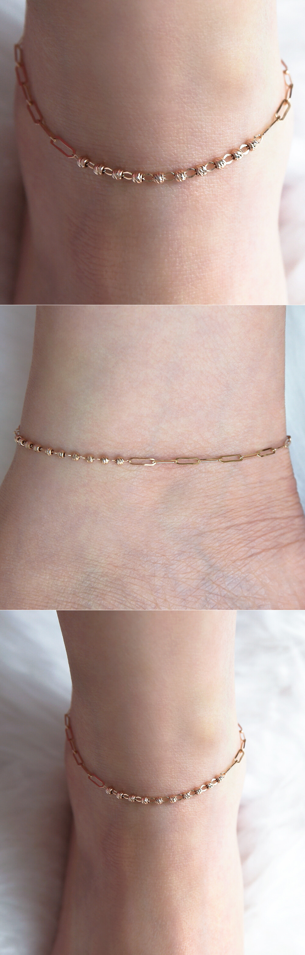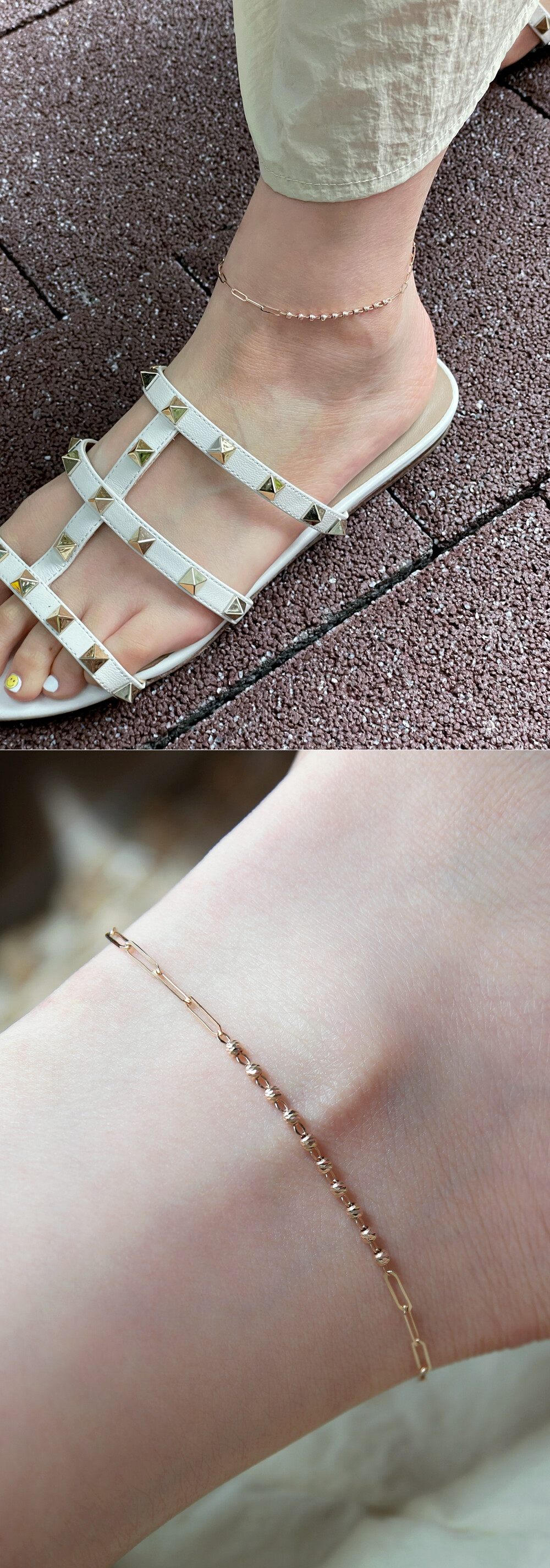 컷팅된 볼 포인트가 들어간 클립 체인 발찌입니다. 움직일때마다 반짝반짝~블링블링! ✨ 세련된 느낌으로 다양한 코디를 연출하시고 싶으신 분들에게 데일리 및 포인트 발찌로 추천해드릴게요! * 잠금장식 부분에는 미니 하트 참이 달렸있어요 :) 💚