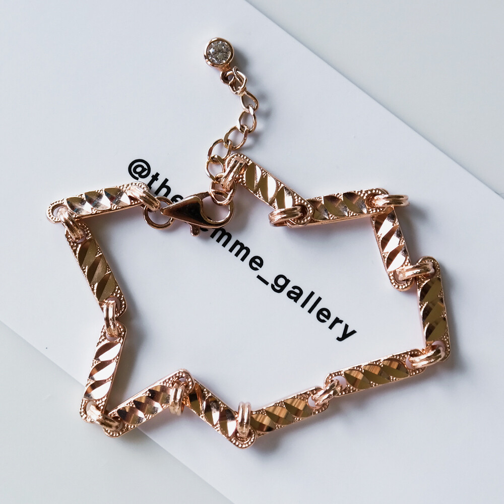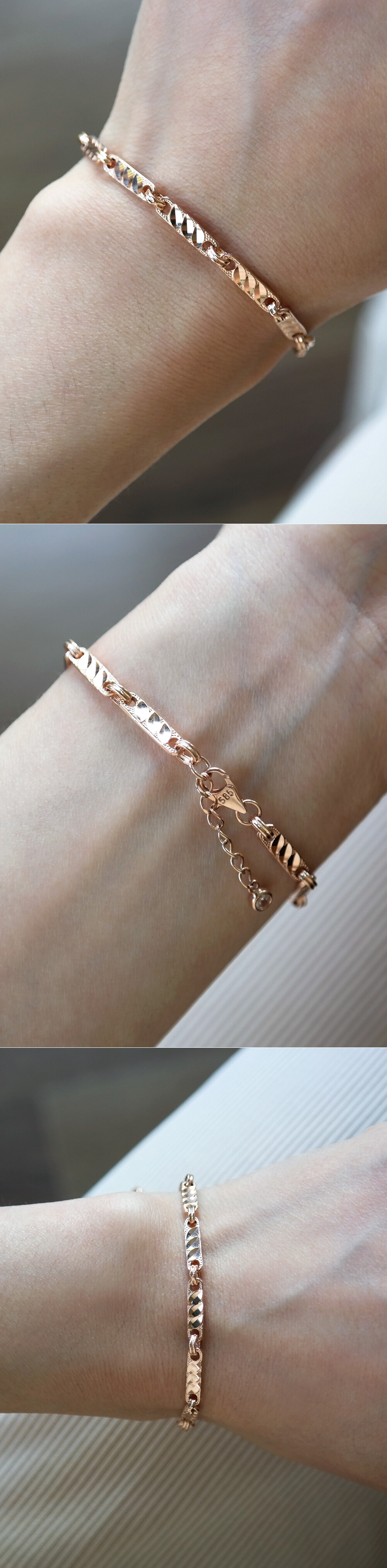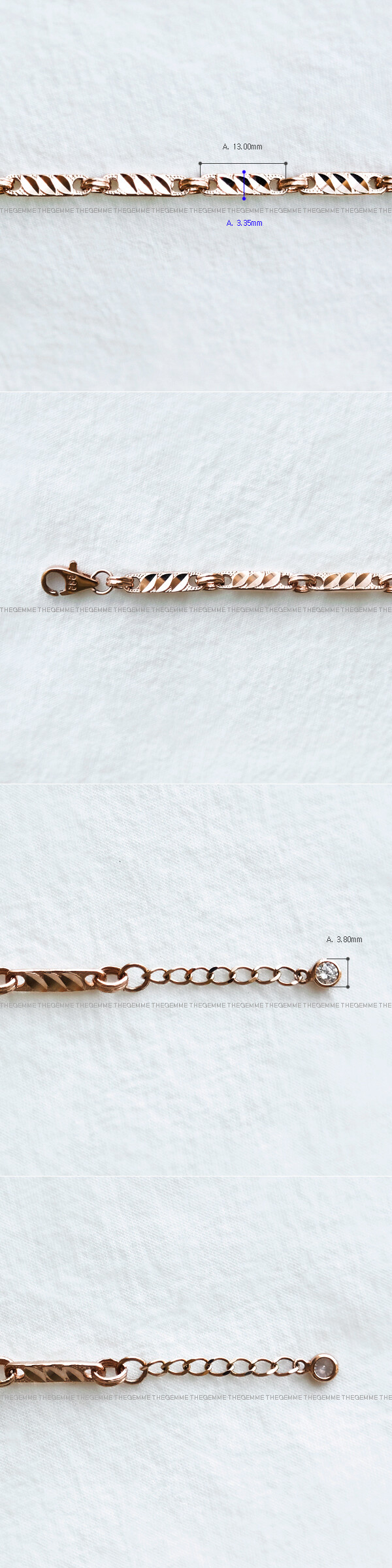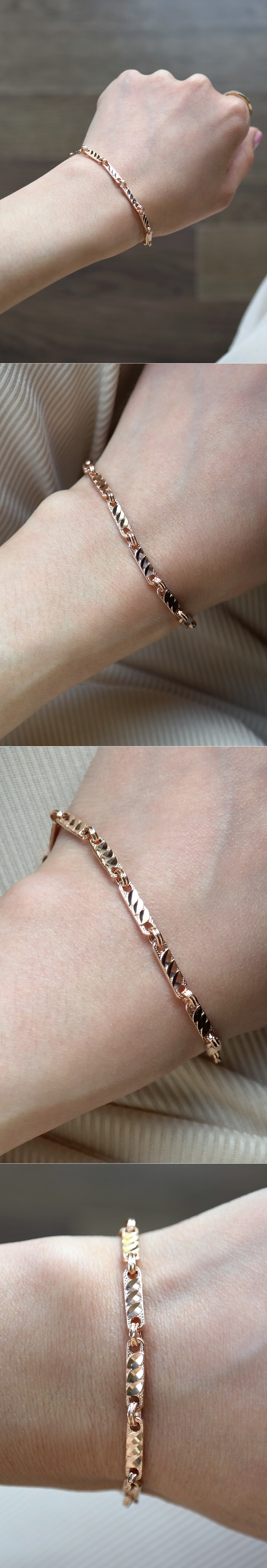 사선으로 컷팅된 스틱 장식이 줄줄이 연결된 팔찌입니다. 볼드한 스타일의 팔찌로 중량감이 있어요. 세련된 느낌으로 다양한 코디를 연출하시고 싶으신 분들에게 데일리 및 포인트 팔찌로 추천해 드릴게요! * 잠금 장식 부분에는 딸랑이 큐빅 참이 달려있어요 :) 💚