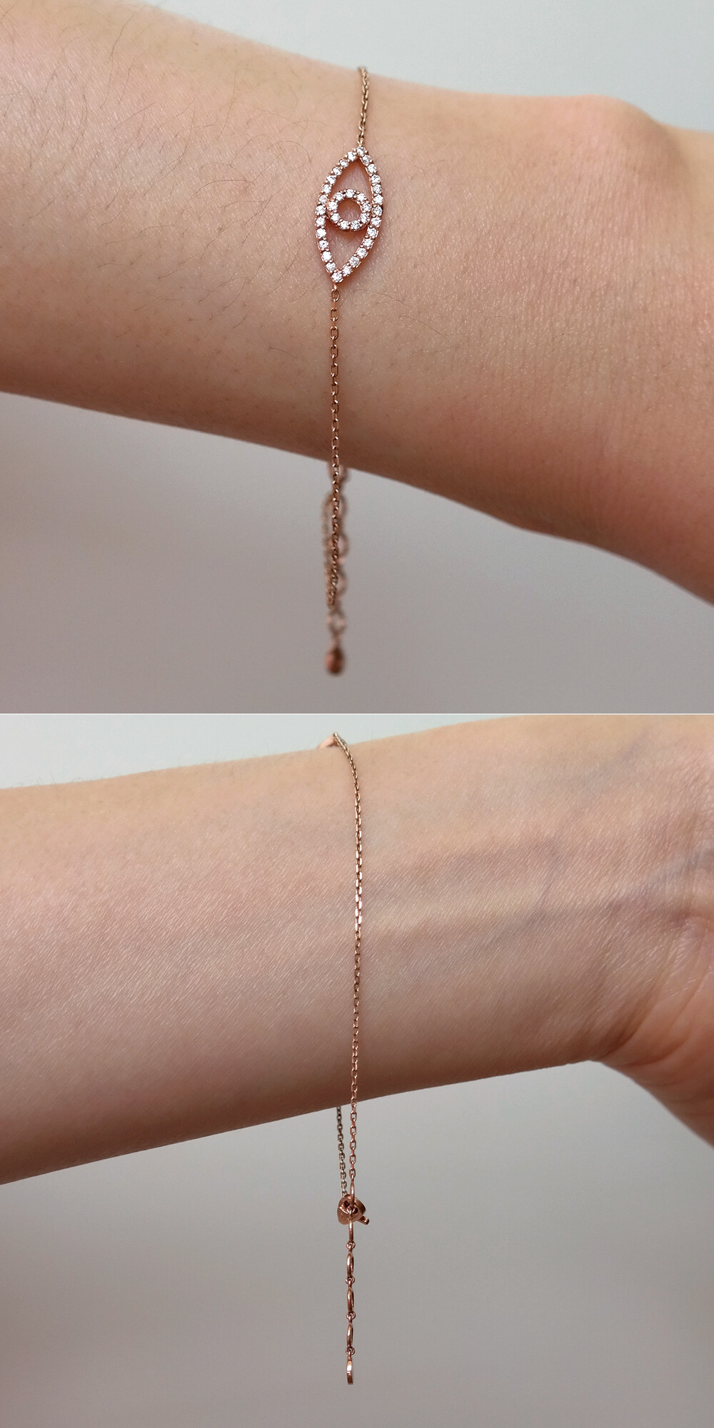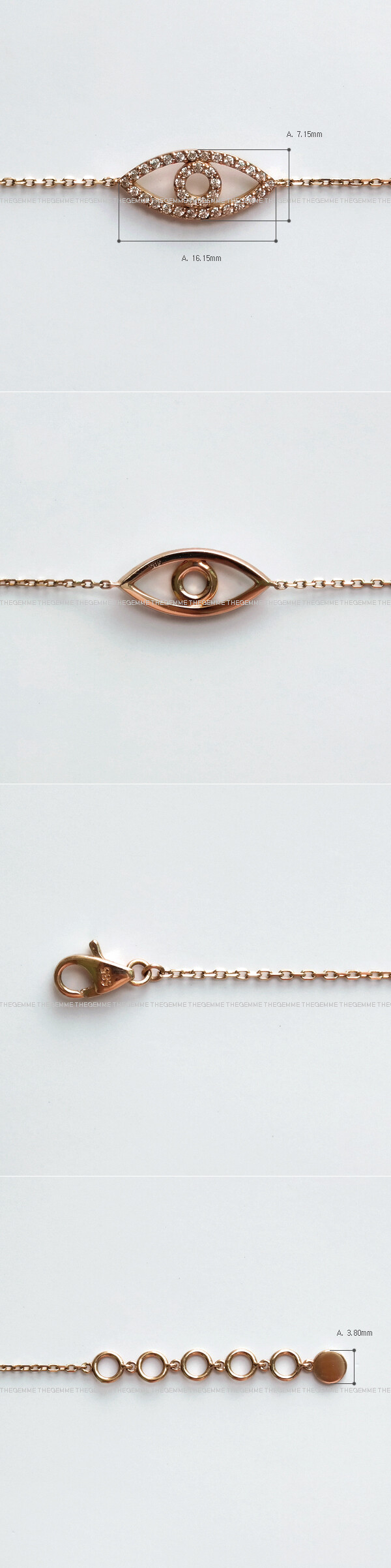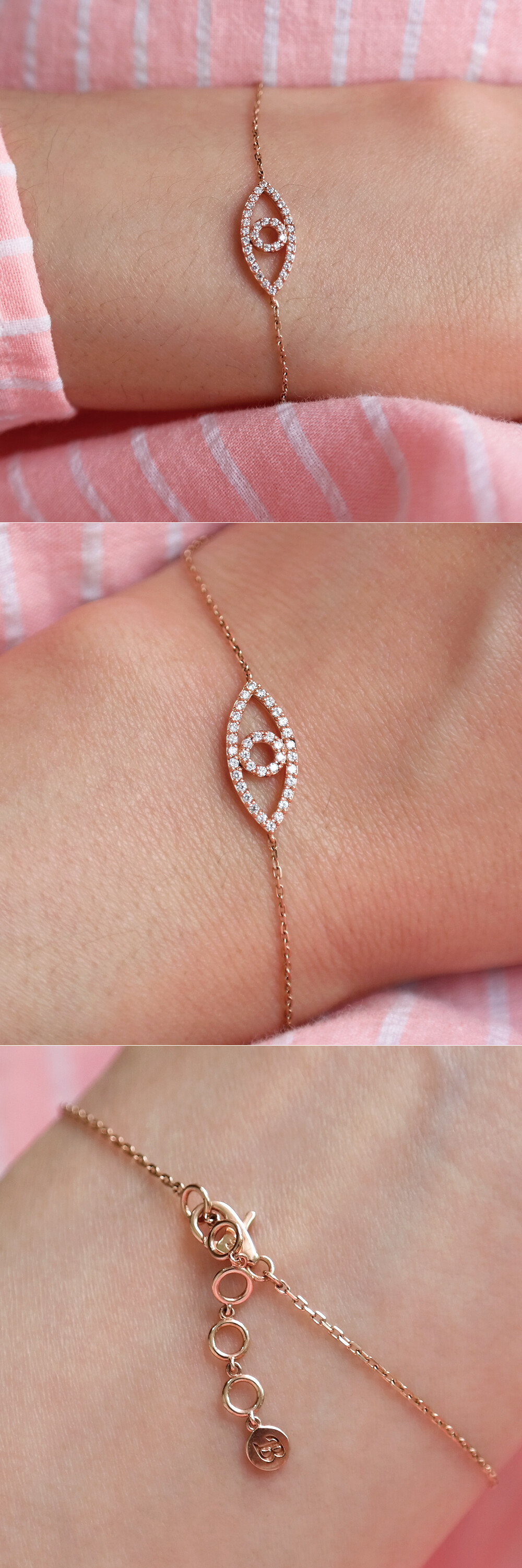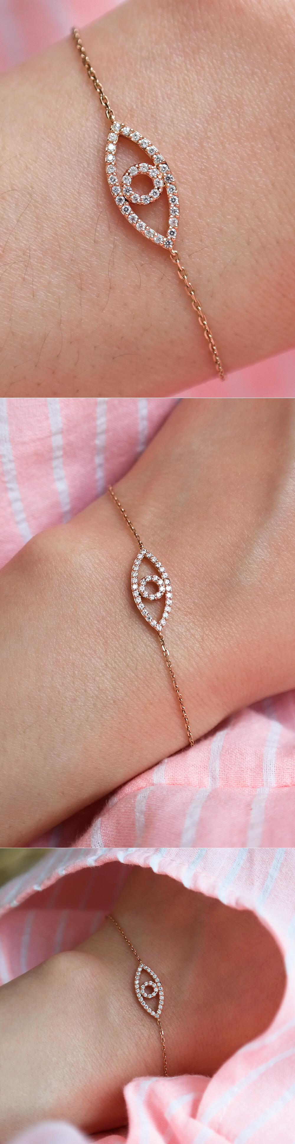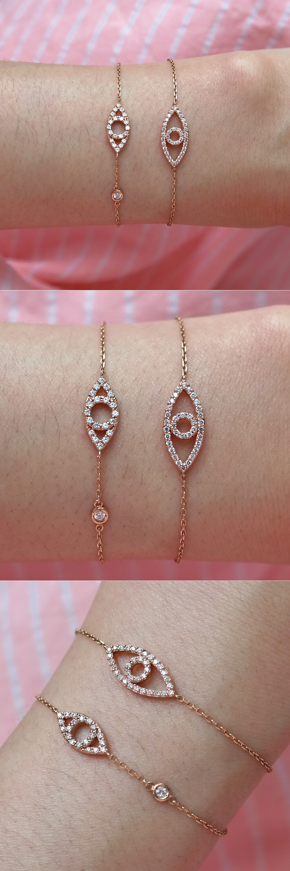 "지혜의 눈 큐빅 팔찌" 는 두 가지 타입으로 나뉩니다. 목걸이 모티브 사이즈가 팔찌 모티브 사이즈보다 조금 더 작으며 중앙에 있는 팔찌가 TYPE1, 마지막에 있는 팔찌가 TYPE2 입니다. ※ 팔찌는 두 타입 디자인이 약간 다르며, TYPE1 팔찌 모티브 사이즈가 TYPE2 팔찌 모티브 사이즈보다 조금 더 작습니다! 이 부분 꼭 참고해 주세요 :)