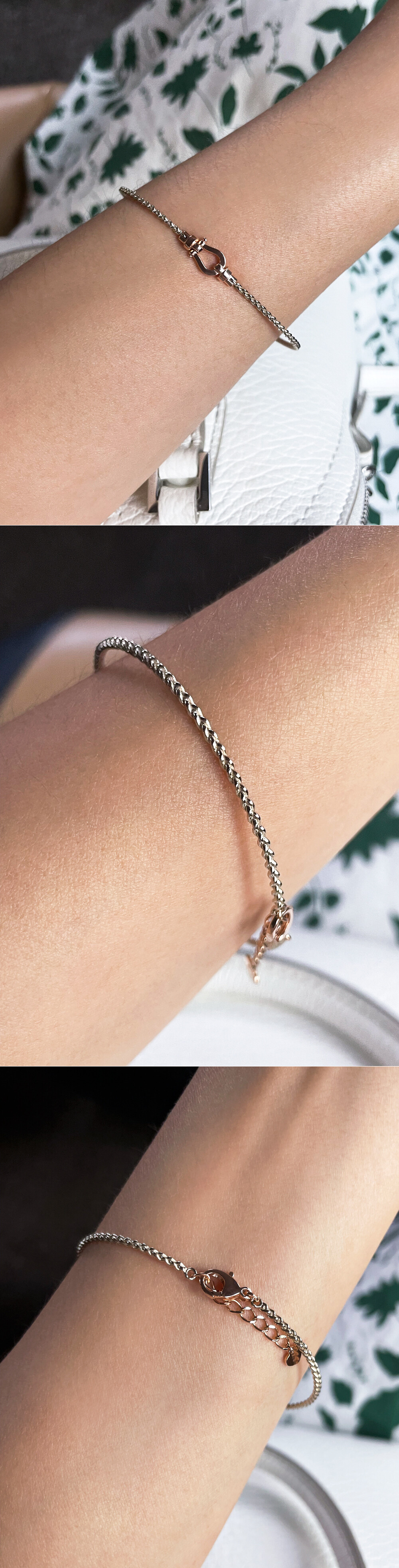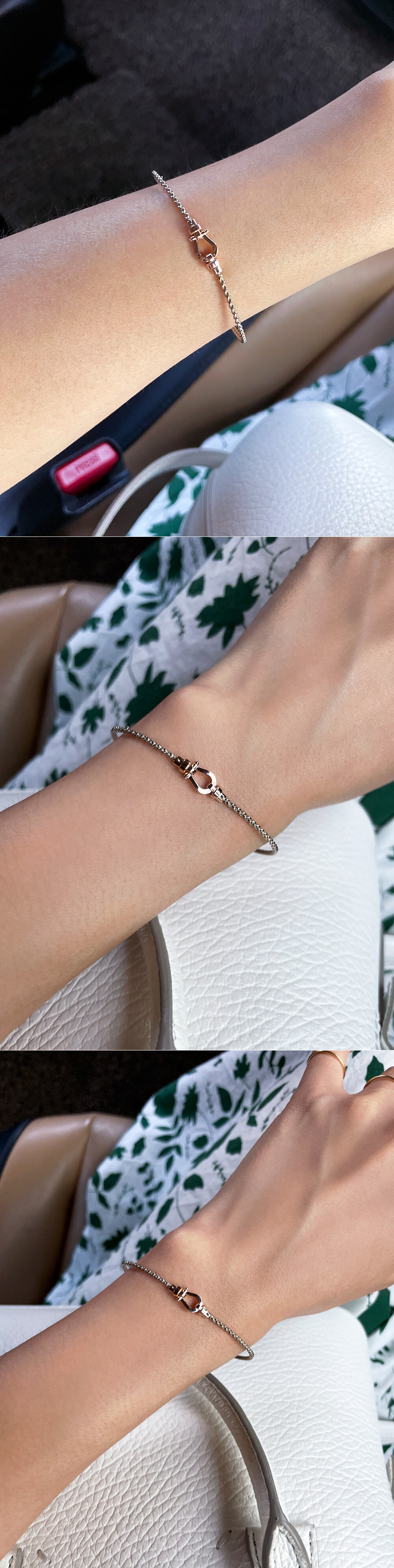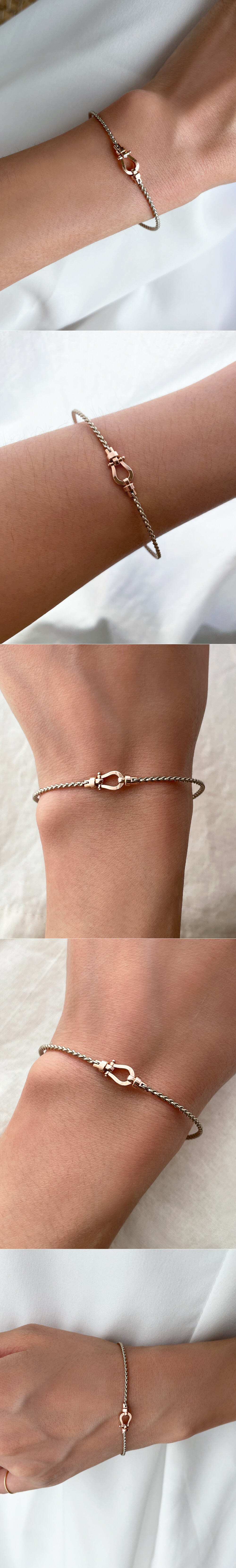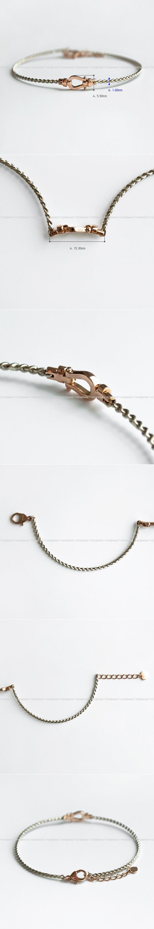 세련된 말발굽 팬던트가 포인트로 들어간 뱅글 디자인 팔찌입니다. 뱅글 부분은 꼬아진 밧줄 쉐입의 와이어 스타일이에요. 뱅글 스타일이지만 일반 체인 팔찌와 비슷하게 여유 장식이 따로 있어 착용 시 약간의 조절이 가능하니 이 점 참고해 주세요! ✨ 기본 투톤 디자인이구요, 원톤으로 주문을 원하시는 경에는 옵션에서 기본 골드 색상과 포인트 골드 색상을 동일하게 선택해 주세요 :) 세련된 느낌으로 다양한 코디를 연출하시고 싶으신 분들에게 데일리 및 포인트 팔찌로 추천해 드릴게요! * 잠금 장식 부분에는 하트 참이 달려있어요 :) 💚
