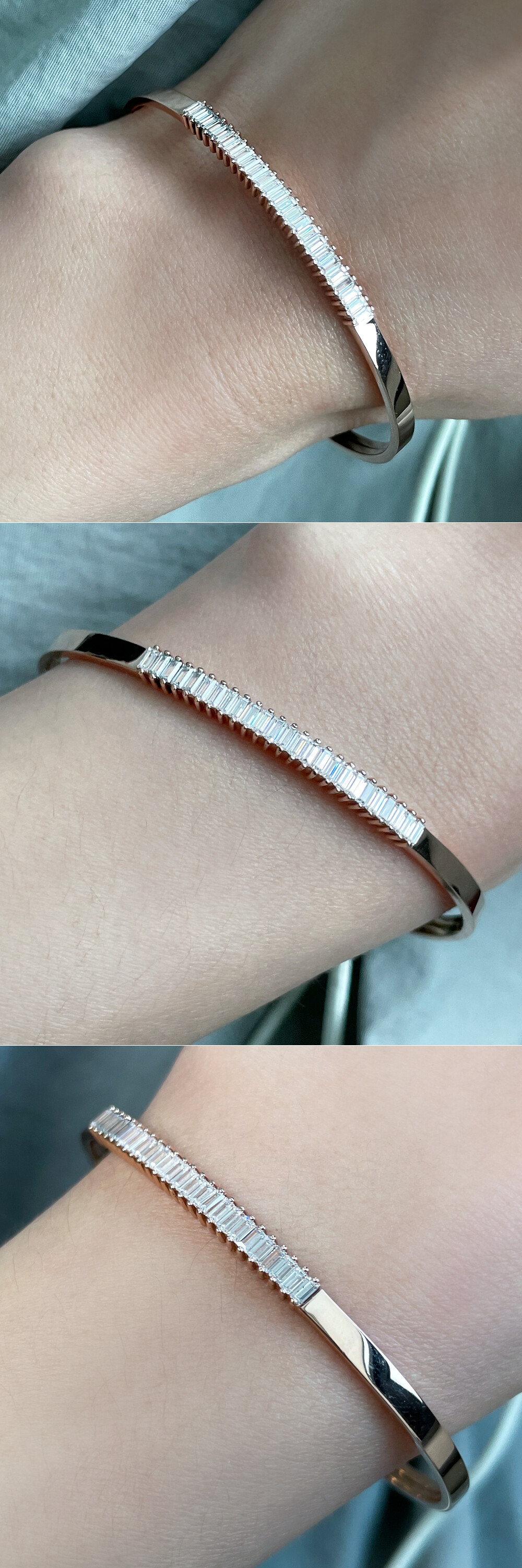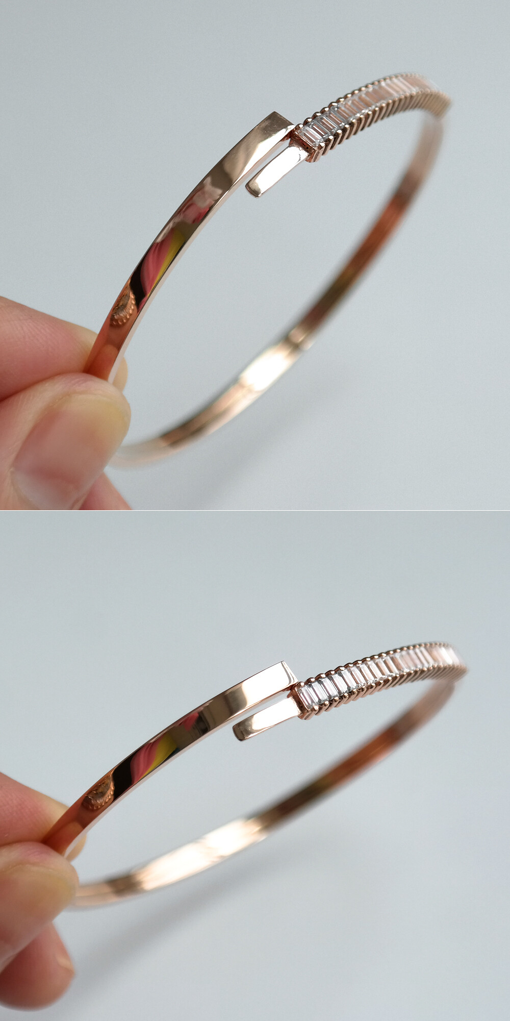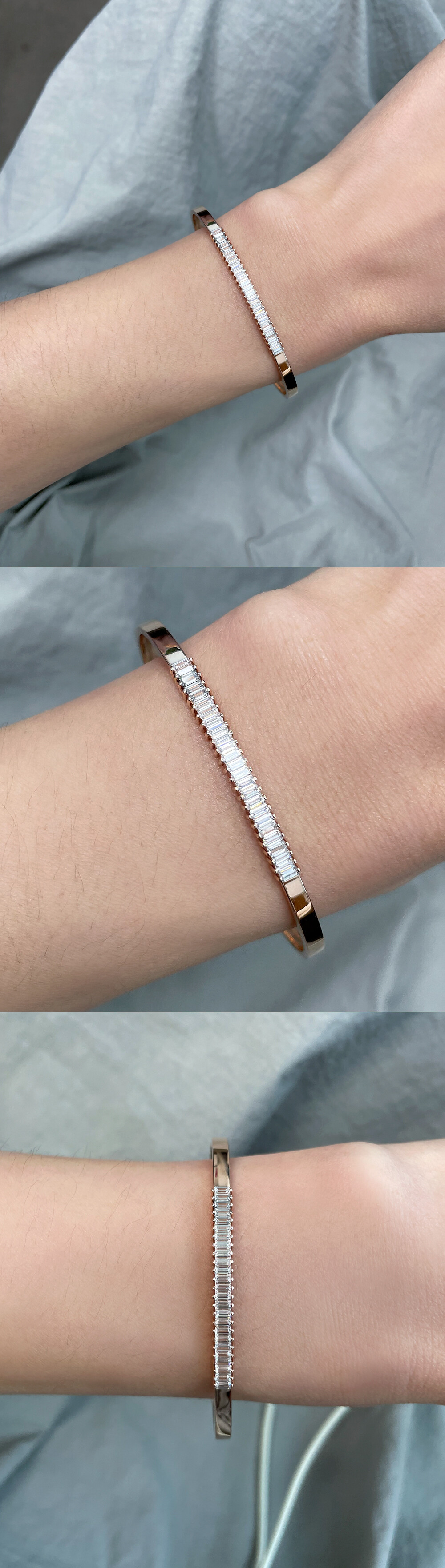 세련된 스타일의 뱅글 팔찌입니다. 플랫한 뱅글의 중앙에 바게트컷의 큐빅들이 촘촘히 세팅된 포인트 라인이 있어요. 🩷 움직일 때마다 반짝반짝~ 눈길을 끄는 아이랍니다. 전체적으로 깔끔한 라인의 뱅글로 어떤 코디에도 다 잘 어울려요 :) 다양한 코디를 연출하시고 싶으신 분들에게 데일리 및 포인트 팔찌로 추천해 드릴게요! 🙌🏼