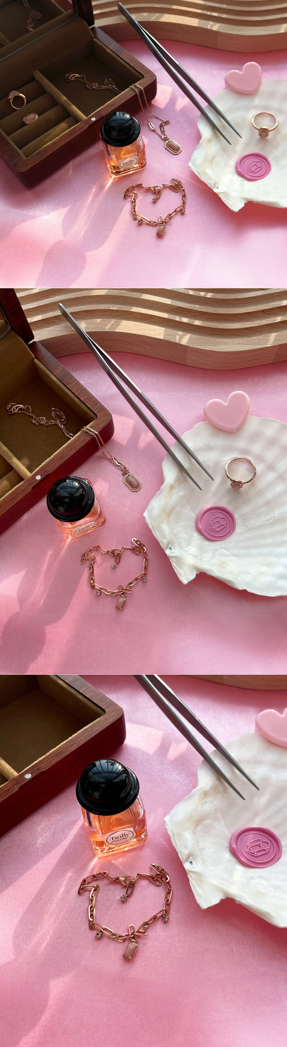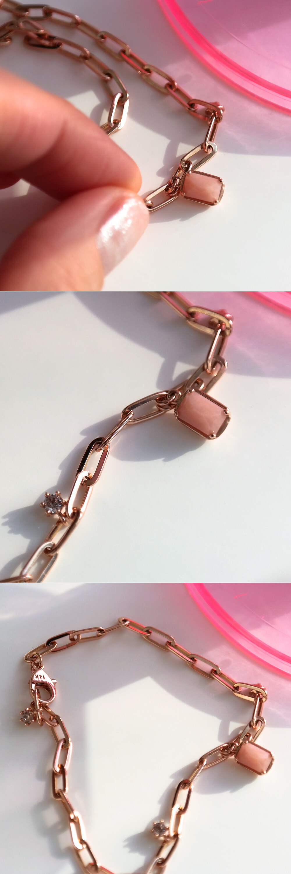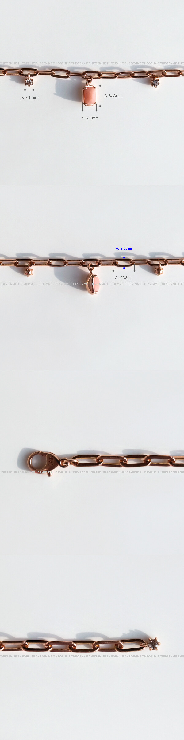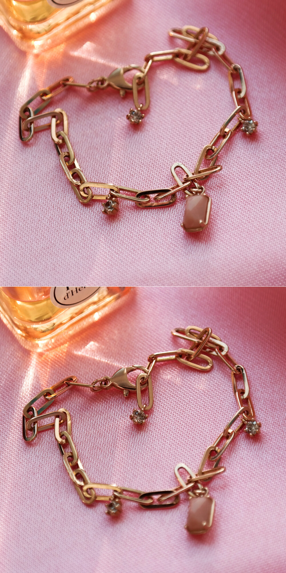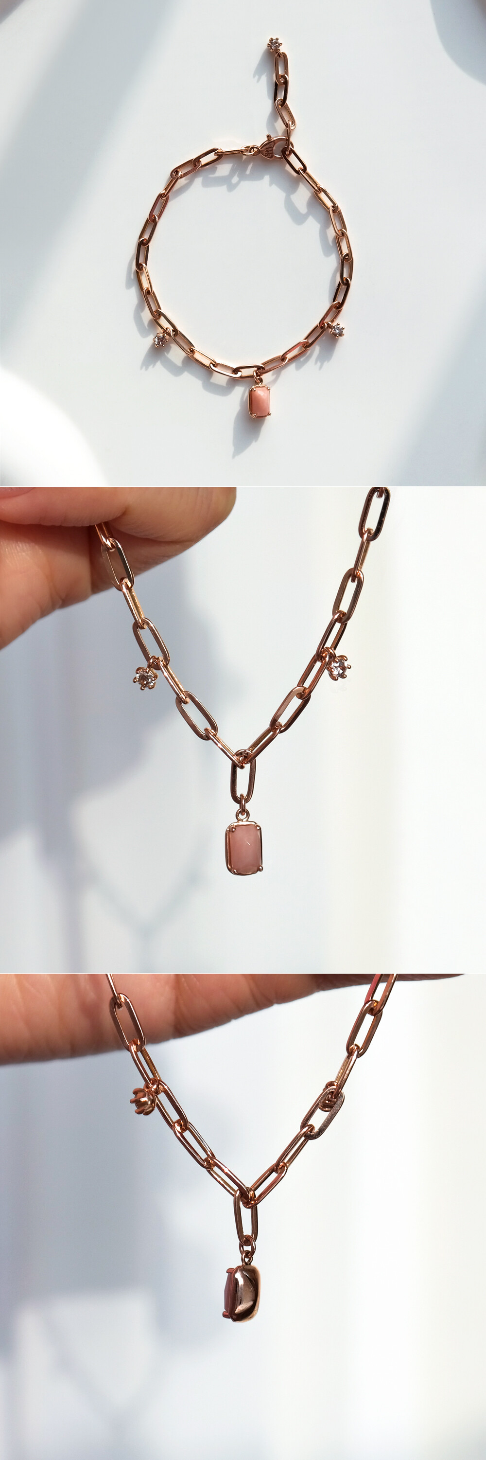반짝반짝~ ✨ 사랑스럽고 러블리한 컬러를 가진 핑크 오팔 팬던트 장식의 링크 체인 팔찌입니다. 💍 귀한 사각 로즈컷의 핑크 오팔이 메인으로 세팅된 포인트 팔찌로 서브 스톤으로는 아주 은은한 브라운~그레이 톤의 흐린 코냑 컬러의 큐빅들이 함께 세팅되었어요. 😃 (서브 스톤들의 경우 기본 화이트(투명) 큐빅으로 변경하실 수 있도록 옵션을 만들어 놓았으니 변경을 원하시는 분들은 작성형 옵션에서 직접 큐빅 색상을 기입하여 변경해 주세요.) 볼드하면서 여성스러운 느낌의 팔찌로 러블리한 느낌을 좋아하시는 분들에게 데일리 및 포인트 팔찌로 추천해 드릴게요! 🩷