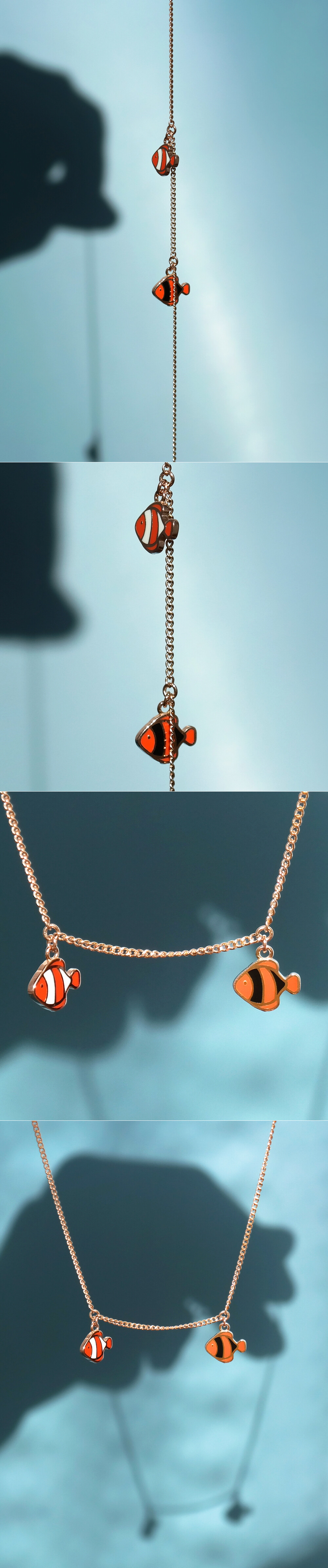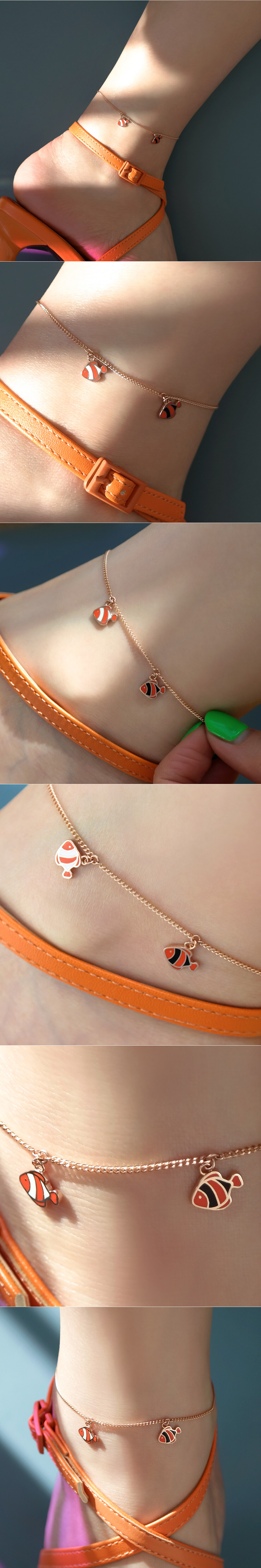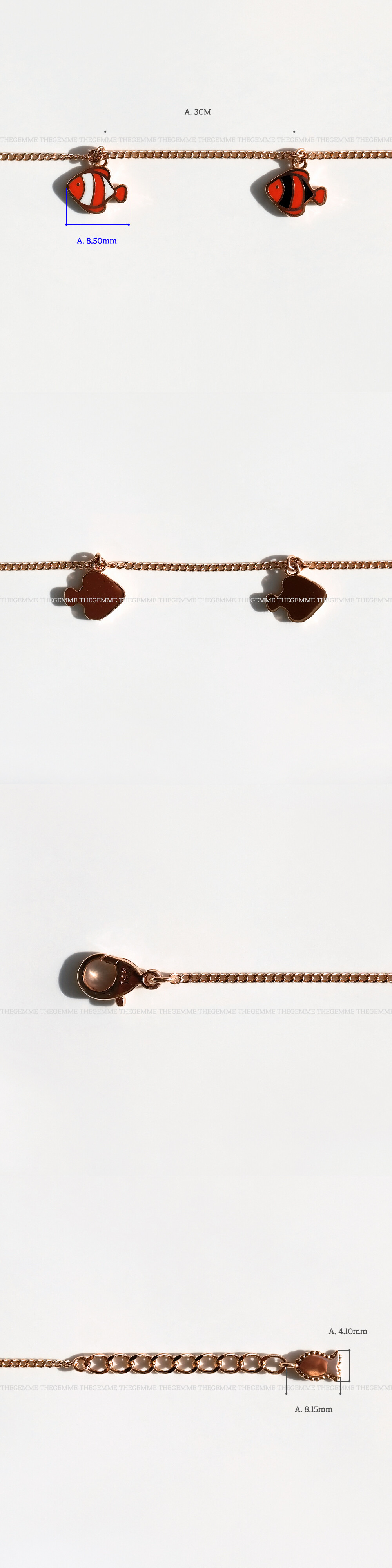 귀여운 니모 모티브의 발찌입니다. 🐠 한 눈에 들어오는 밝은 컬러감과 패턴을 가지고 있어서 포인트 주얼리로 제격이에요! 알록달록한 색상은 ; 골드의 표면에 얇게 컬러 에폭을 입힌 것입니다. 이 점 참고해 주시구요, 적당한 두께감을 가진 5푼 굵기의 체인과 함께 레이어드 되어 안정감 있게 착용하시기 좋아요. (옵션에서 팔찌로도 주문 가능합니다!) 귀엽고 사랑스러운 데일리 발찌 및 팔찌를 찾으시는 분들께 추천해 드릴게요. 😛