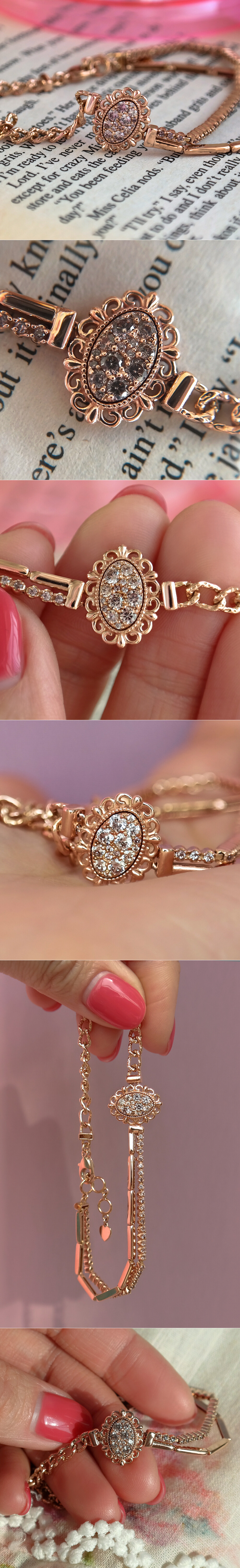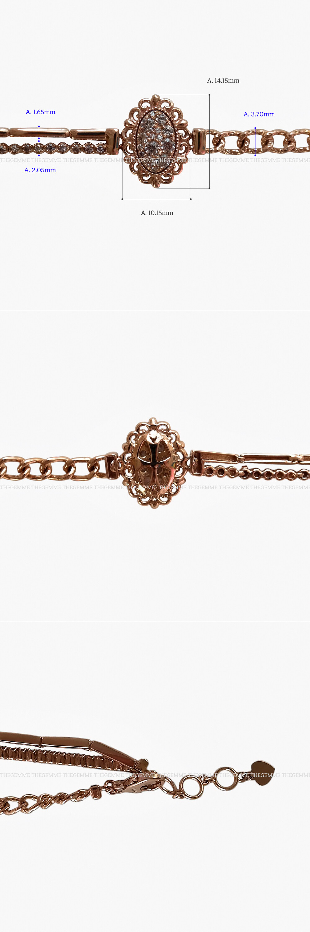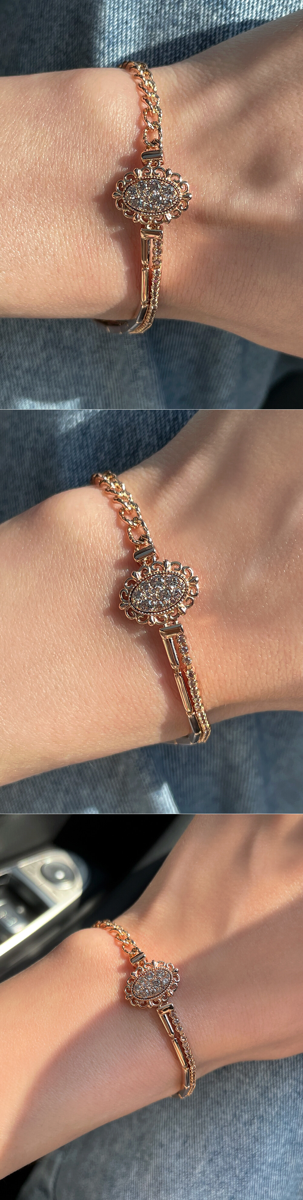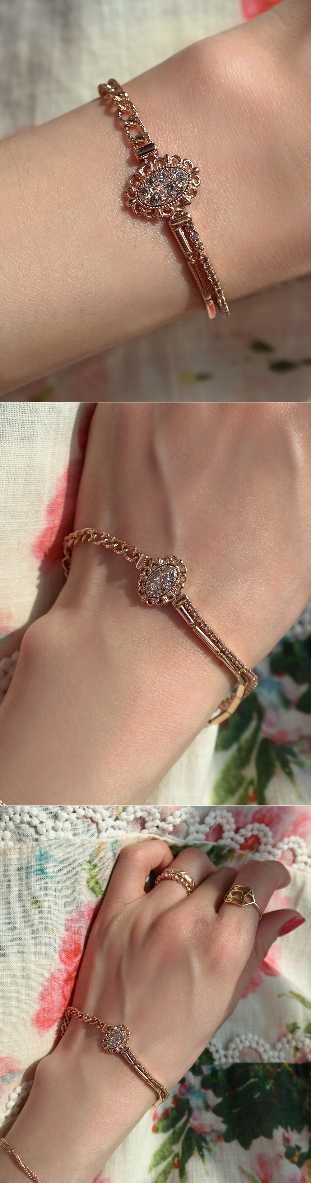 수려한 곡선 장식으로 마감된 고급스러운 느낌의 팔찌입니다. 💍 마치 꽃이 피고 있는 듯한 느낌을 연상케 하는 디자인으로 여성미가 돋보이는 팔찌에요. 믹스 체인 디자인으로 유니크한 멋스러움까지 더해졌답니다 :) 스톤은 코냑 다이아몬드 색상과 비슷한 브라운 톤의 코냑 큐빅이 세팅되었어요. 원하시는 경우 코냑 다이아몬드 또는 다른 스톤으로도 대체 가능합니다. 흔하지 않는 디자인의 여성스러운 팔찌를 찾으시는 분들께 포인트 팔찌로 추천해 드릴게요. 🧡