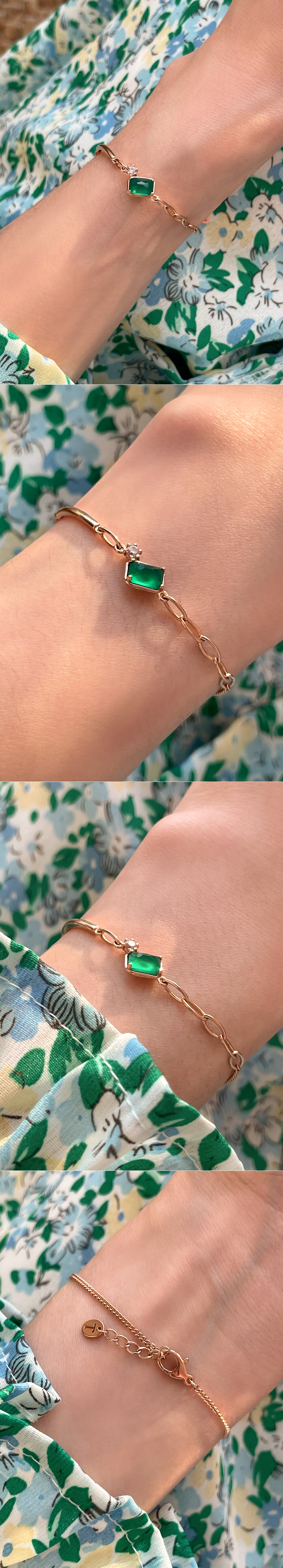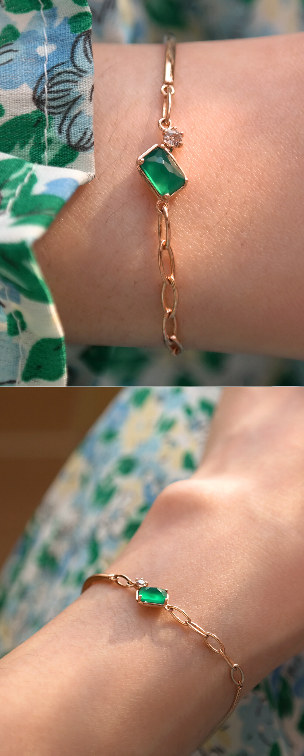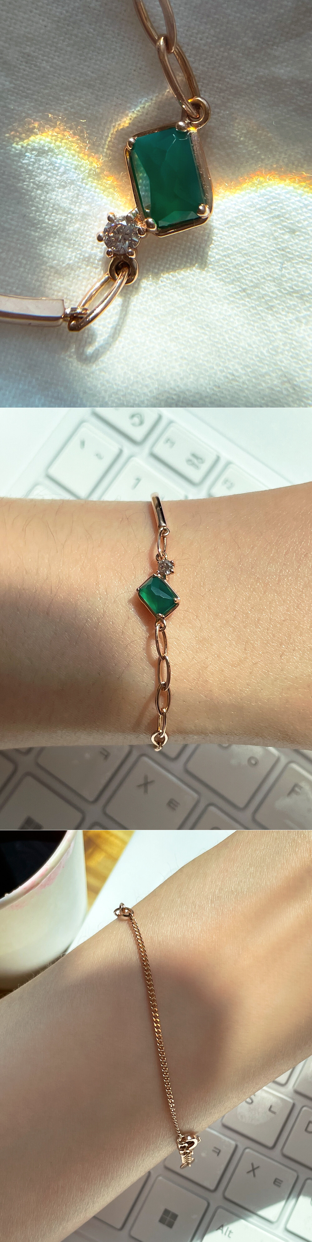 여성스러운 디자인의 그린 오닉스 팔찌입니다. 💍 차분한 느낌을 주는 딥 그린 컬러의 에메랄드컷 그린 오닉스가 메인 스톤으로 세팅되었구요, 스톤 쉐입이 사각 로즈컷 형태라 단조로우면서도 엣지있고 세련된 느낌이 있습니다. 옆에 함께 세팅된 스톤은 코냑 컬러의 큐빅입니다. (원하시는 경우 다이아몬드로 변경 가능!) 체인 부분이 스틱 장식과 링크 체인이 믹스된 디자인이라 그런지 전체적으로 유니크한 멋스러움이 느껴지는 아이에요. 어떤 코디에도 잘 어울리는 그린 톤이라 데일리 팔찌로 활용하셔도 좋을 것 같아요. 포인트 및 레이어드 팔찌로 추천해 드릴게요! 😃🩷