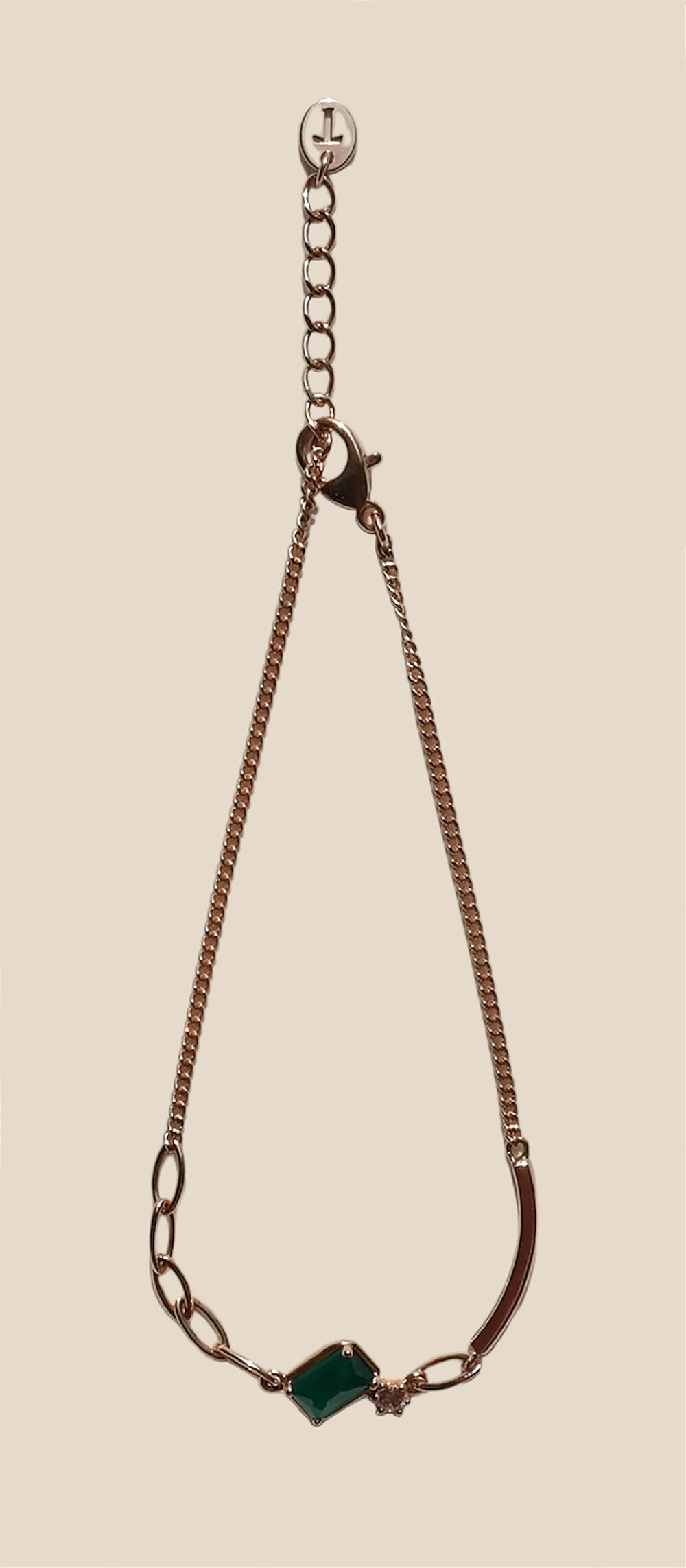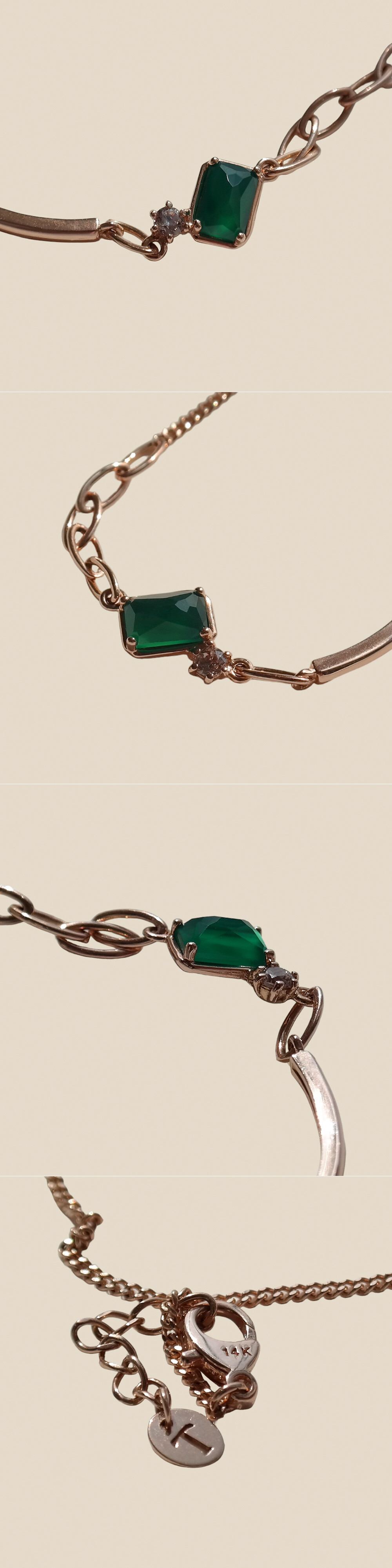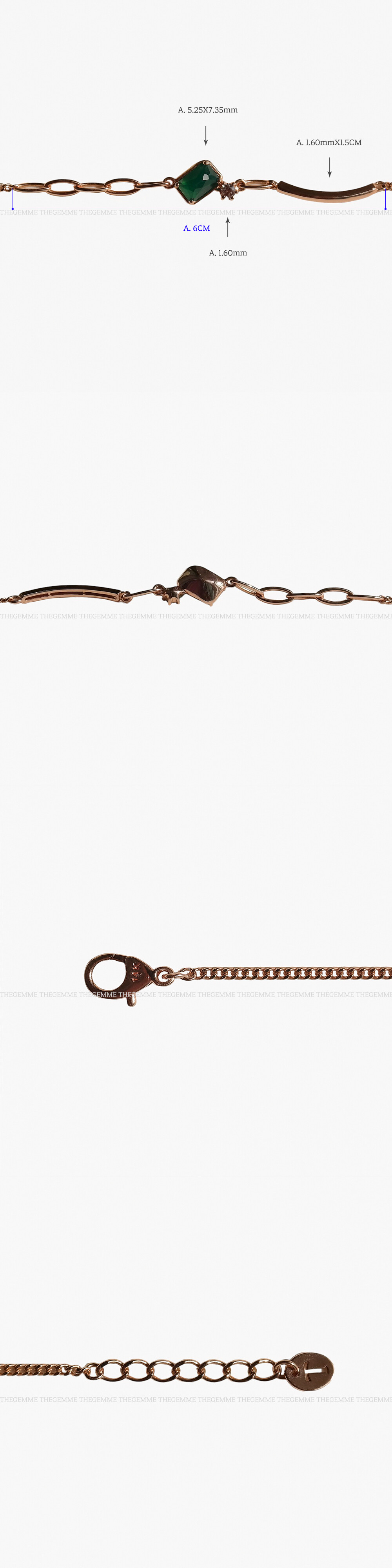 여성스러운 디자인의 그린 오닉스 팔찌입니다. 💍 차분한 느낌을 주는 딥 그린 컬러의 에메랄드컷 그린 오닉스가 메인 스톤으로 세팅되었구요, 스톤 쉐입이 사각 로즈컷 형태라 단조로우면서도 엣지있고 세련된 느낌이 있습니다. 옆에 함께 세팅된 스톤은 코냑 컬러의 큐빅입니다. (원하시는 경우 다이아몬드로 변경 가능!) 체인 부분이 스틱 장식과 링크 체인이 믹스된 디자인이라 그런지 전체적으로 유니크한 멋스러움이 느껴지는 아이에요. 어떤 코디에도 잘 어울리는 그린 톤이라 데일리 팔찌로 활용하셔도 좋을 것 같아요. 포인트 및 레이어드 팔찌로 추천해 드릴게요! 😃🩷