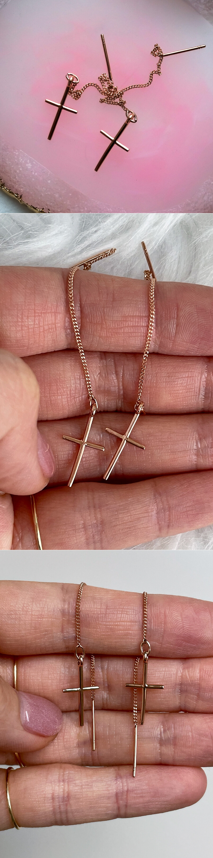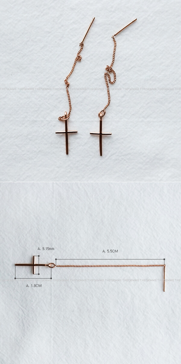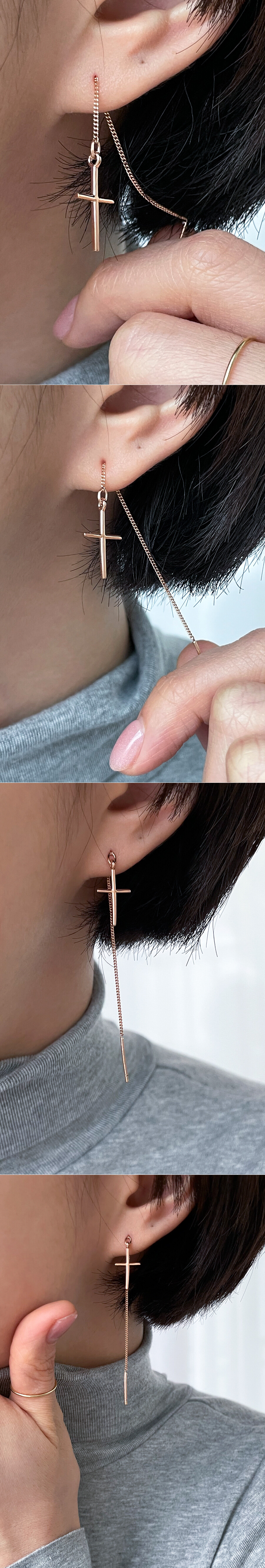 플랫한 십자가 팬던트가 달린 하늘하늘한 디자인의 관통형 귀걸이입니다. 다양하게 코디하시기 좋은 체인 스타일이에요. 포스트를 귀에 꼽고 원하시는 지점까지 체인을 쭈~욱 당겨주세요. ♥