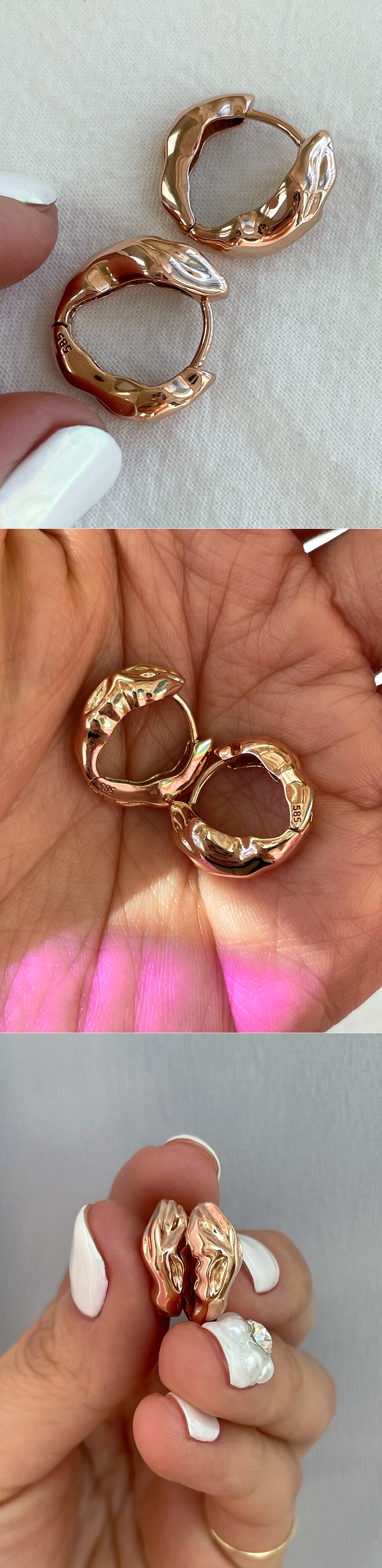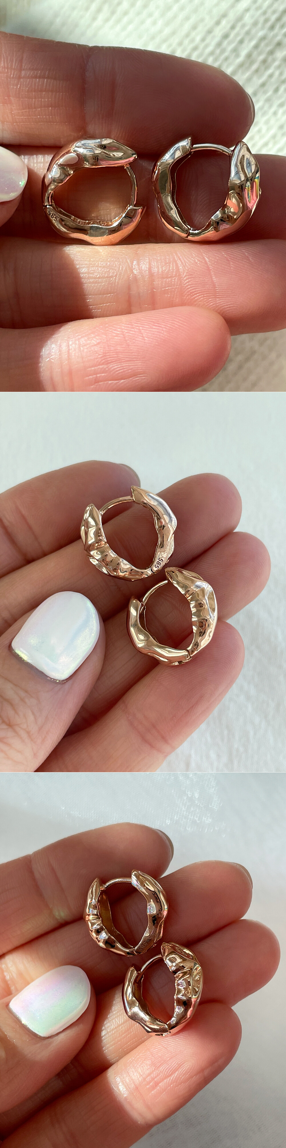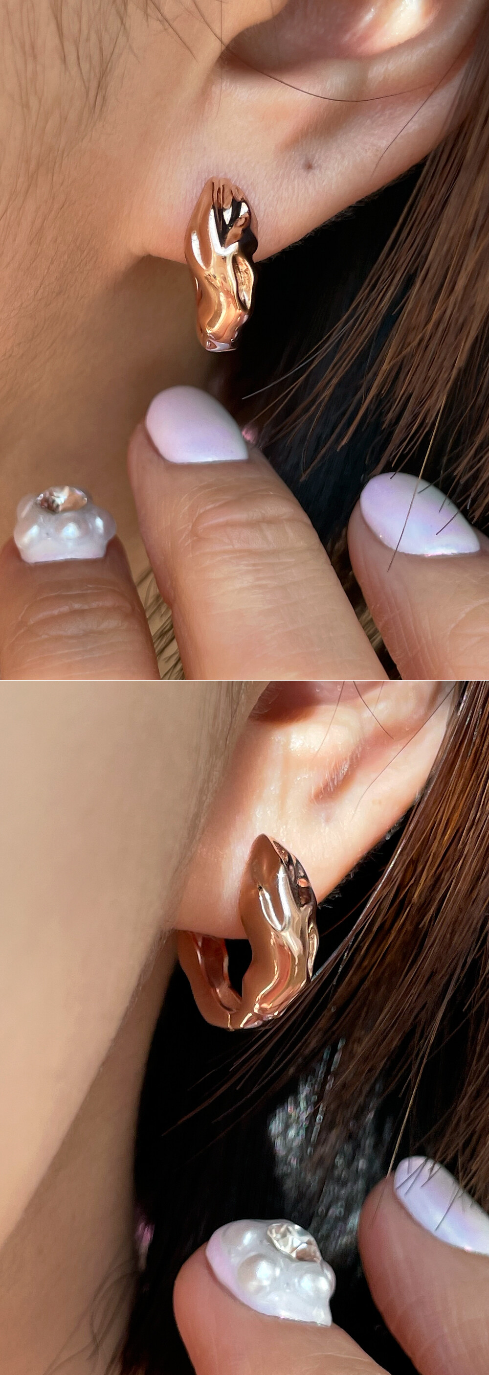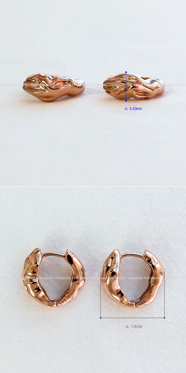 구불부굴~ 불규칙적인 해머링 디자인의 링 귀걸이입니다. 🥰 전체적으로 깔끔하면서 유니크한 느낌의 귀걸이에요. 간단한 티셔츠 차림의 캐주얼이나, 원피스, 세미 정장 등 어떤 코디와도 잘 어울린답니다! 보기보다 중량감이 나가는 디자인으로 안정감 있는 귀걸이를 찾으시는 분들에게 추천해 드릴게요. 💖