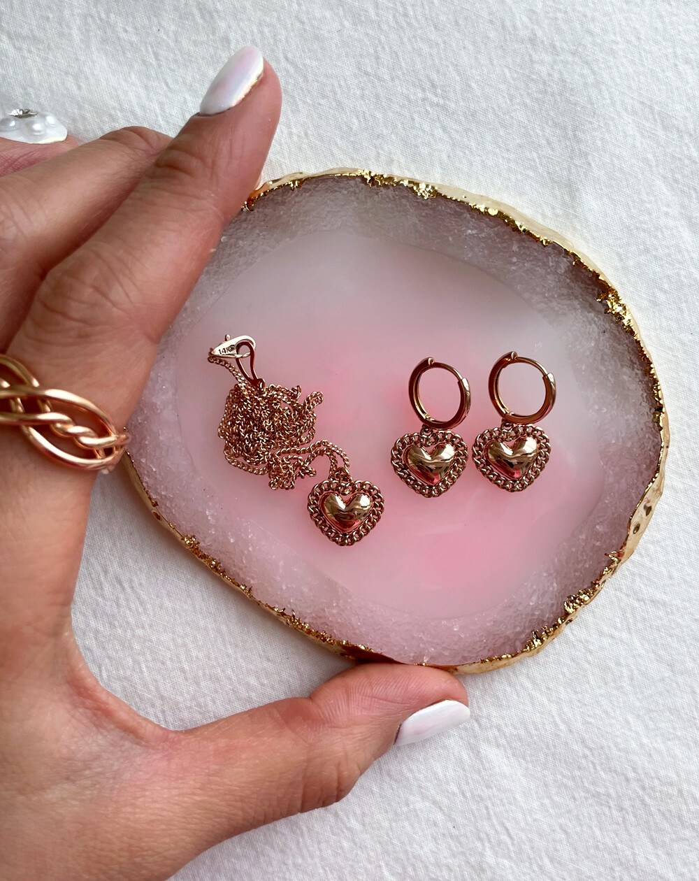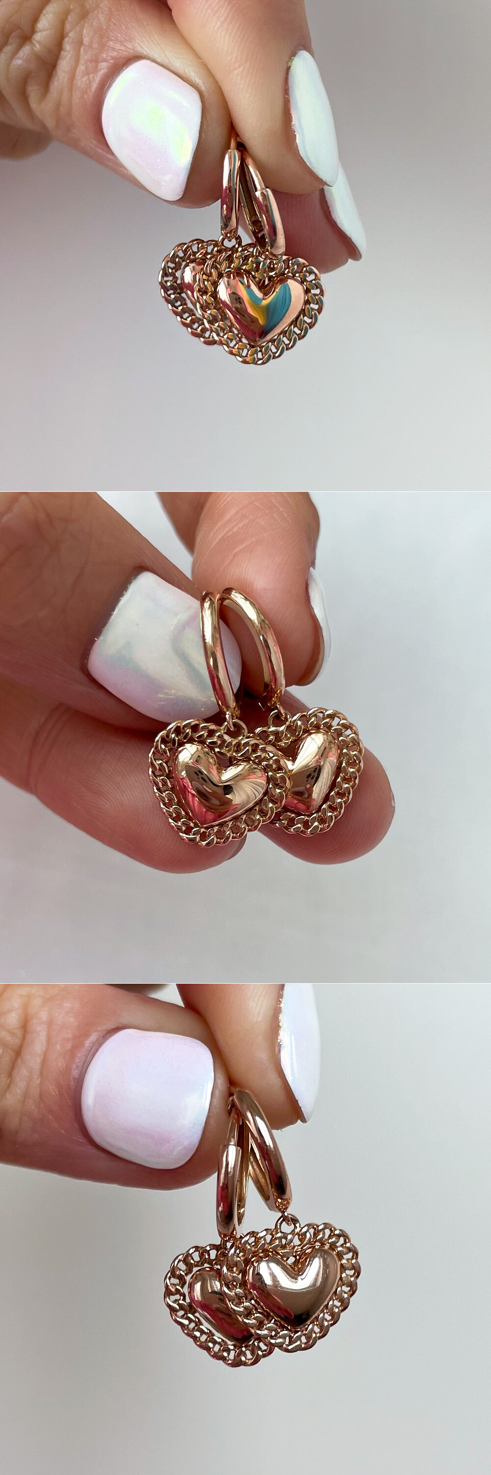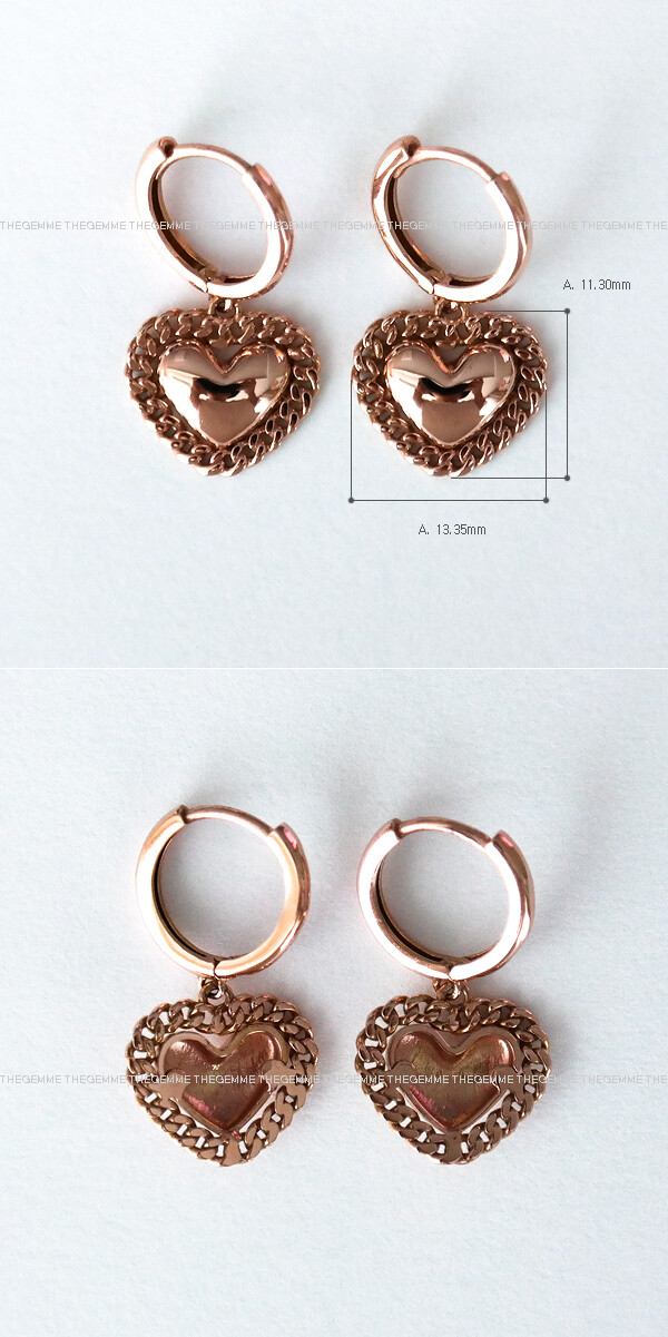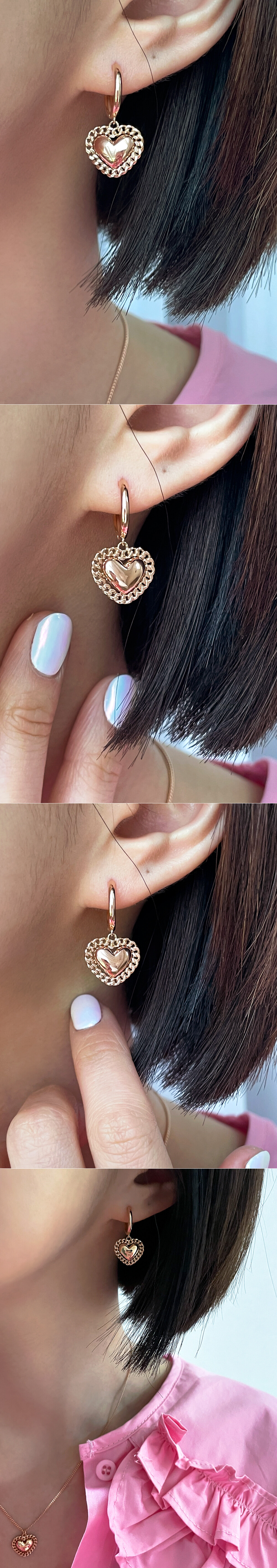 블링블링~ 볼록볼록~ 귀여운 하트 팬던트 장식의 링 귀걸이입니다. 💕 볼록하게 올라온 하트 쉐입에 체인 테두리가 들어가 있어서 볼륨감이 있으면서 고급스러운 느낌이 들어요. 🥰 귀엽고 여성스러운 코디를 연출하시고 싶으신 분들에게 데일리 및 포인트 귀걸이로 추천해 드릴게요. ❤️