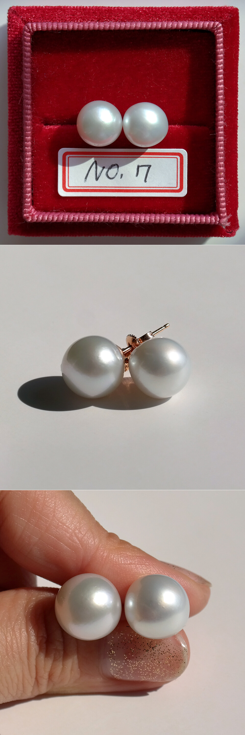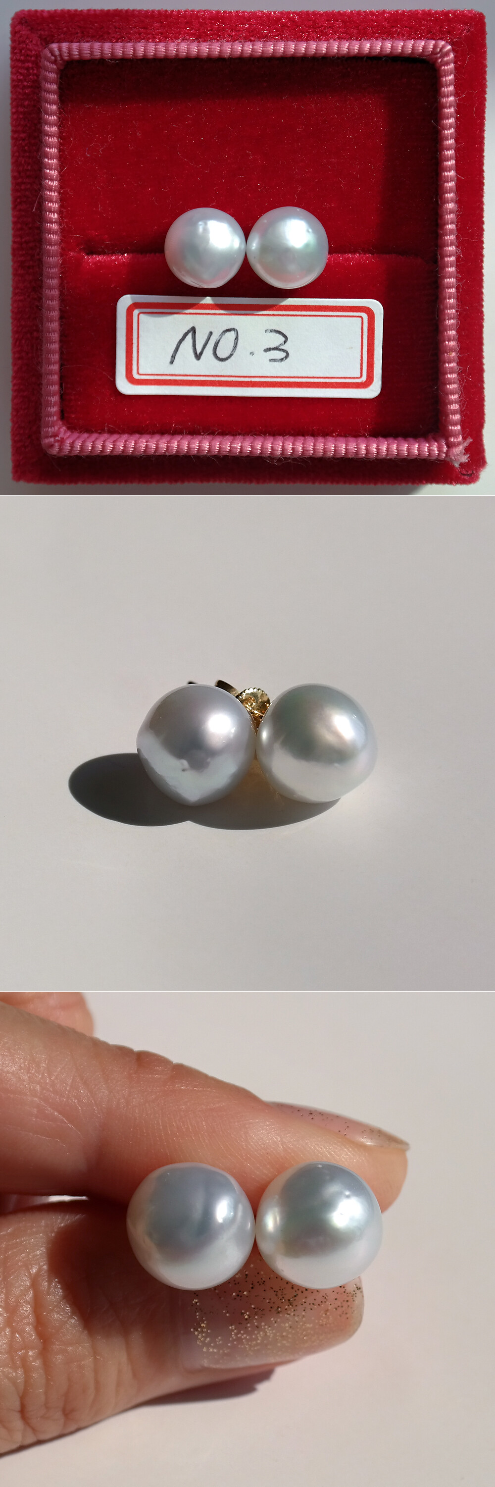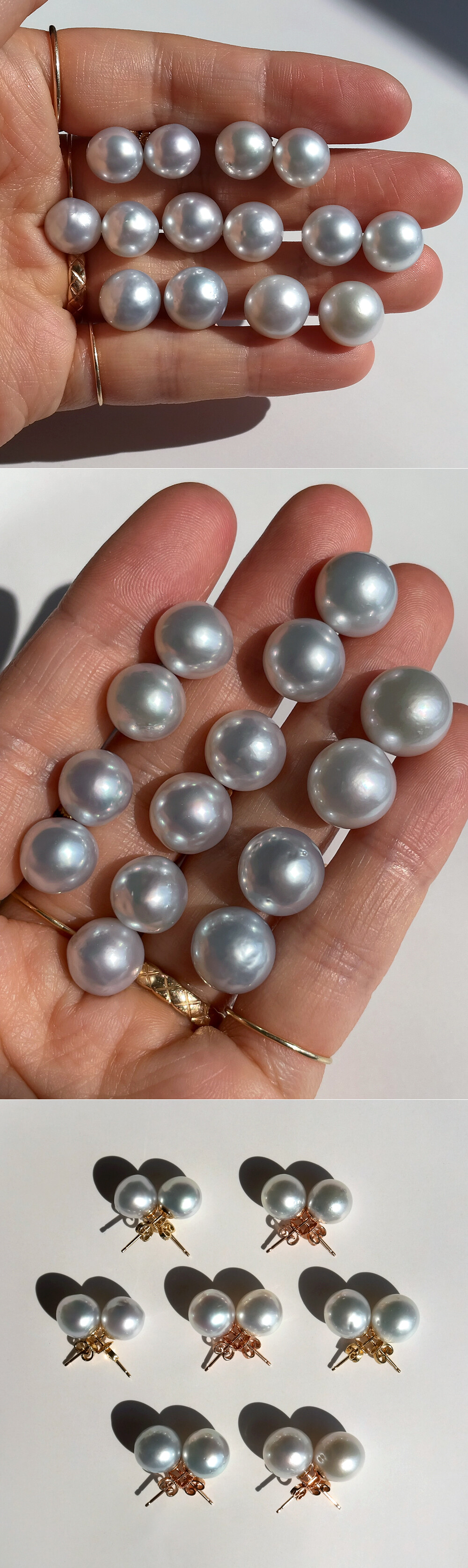 화이트~그레이 바디에 은은한 실버~핑크 오버톤이 맴도는 남양진주를 세팅한 귀걸이입니다. 😃 불퉁불퉁, 모양이 불균형한 바로크 타입의 해수진주로 총 7벌이 제작되었어요. 모두 14K로 제작된 아이들이구요, 세트마다 진주의 컨디션과 골드 색상, 사이즈가 약간씩 달라서 영상과 이미지를 각각 올려드렸으니 이 부분 각각 참고해 주시기 바랍니다! 요 아이들은 바로크 진주임에도 불구하고 최대한 구형에 가까운 아이들로 엄선하여 제작한 아이들이에요. 또, 모두 9.5mm 이상이라 사이즈가 커서 네이커나 광택 등 품질면에서 우수하답니다 :) 차분하고 고급스러운 이미지를 연출하시고 싶으신 분들에게 추천해 드릴게요. 💖 * 진주의 특성상 완벽한 구형은 아니고 약간의 굴곡이 있으며, 진주 표면에 진주가 자라면서 생긴 숨구멍 같은 작은 구멍들과 울퉁불퉁한 외면이 있을 수 있으나 자연적인 진주의 특성입니다.