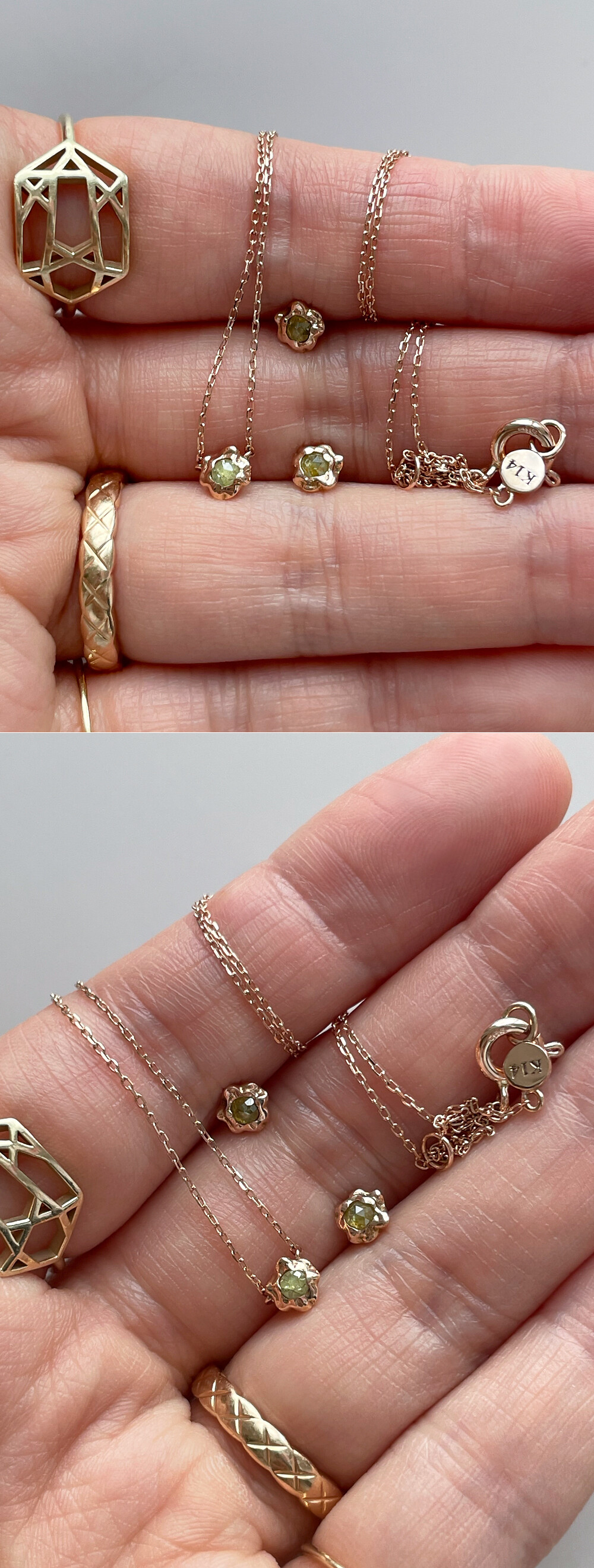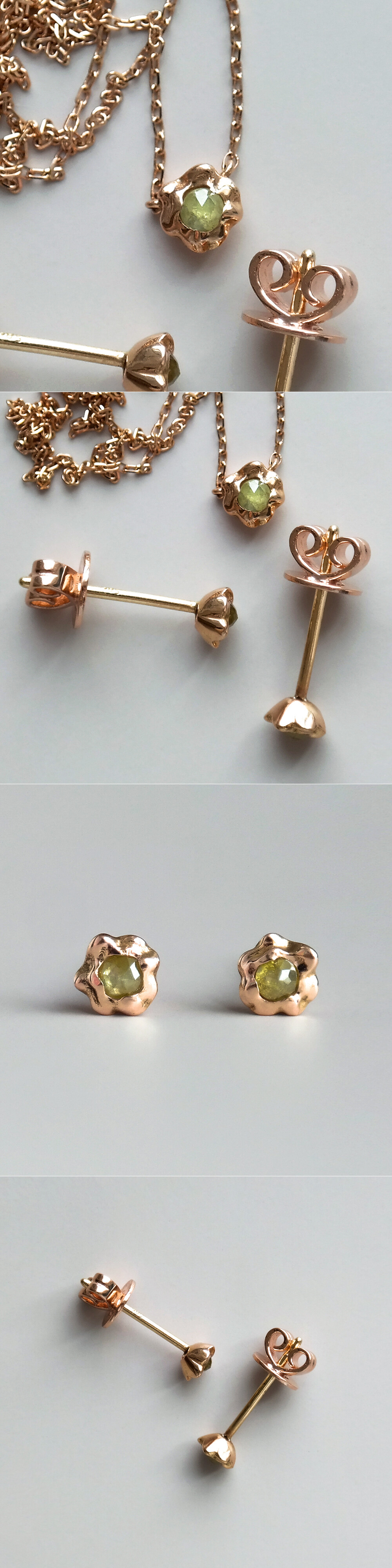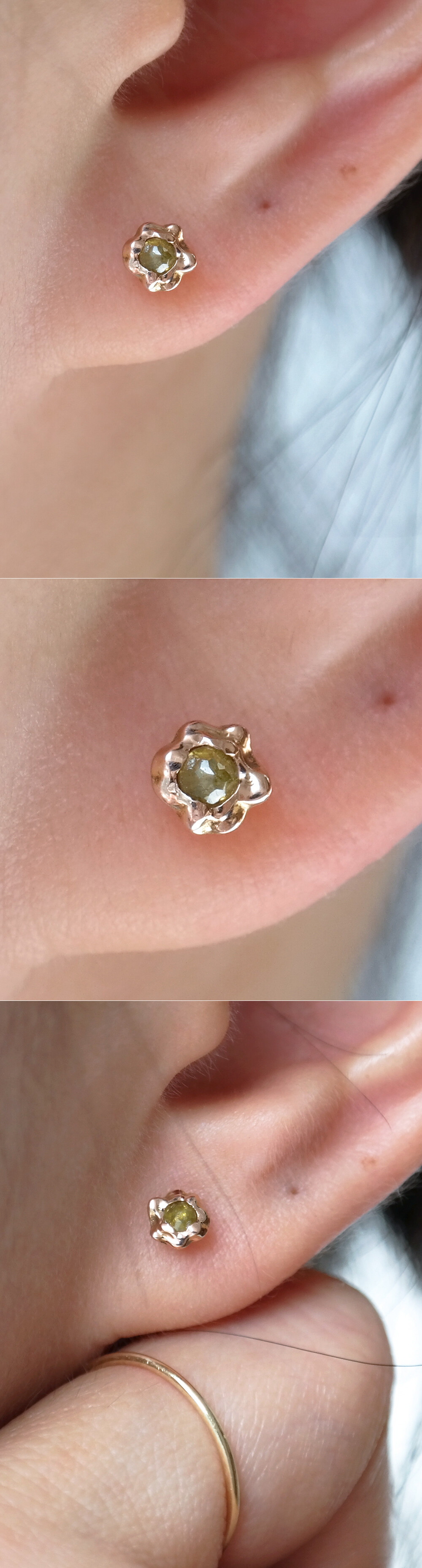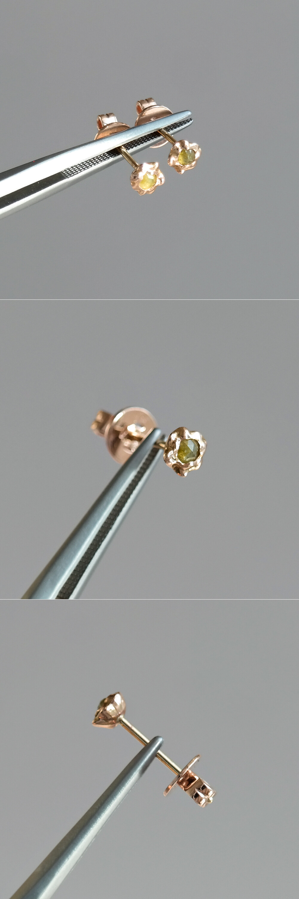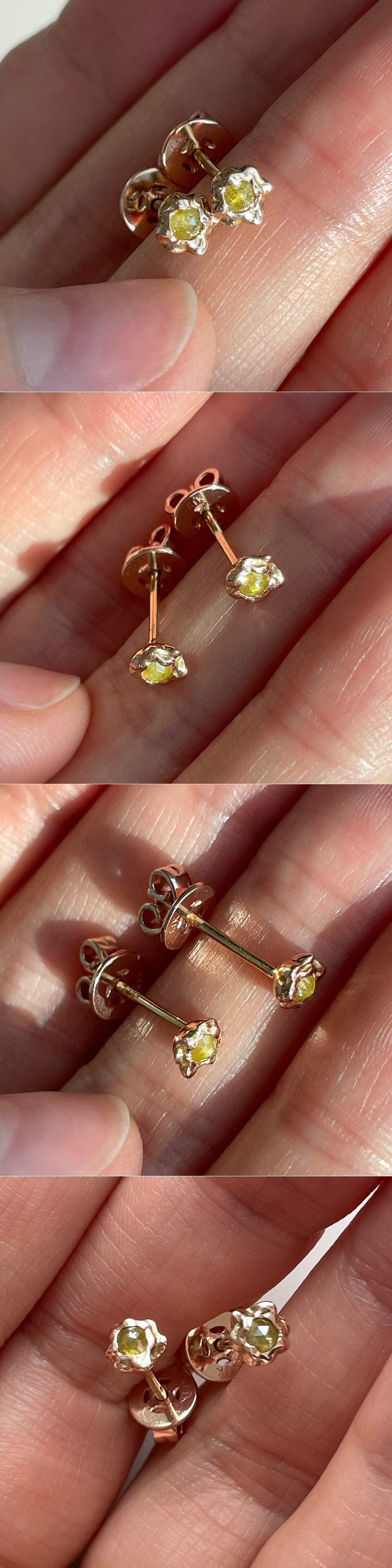 귀여운 쁘띠 사이즈의 러프 다이아몬드 귀걸이입니다. 💛 미니멀하면서 굴곡진 곡선 디자인의 스터드 귀걸이로 촬영된 샘플 귀걸이에는 사랑스러운 옐로우 머스타드 빛깔을 가진 5링 사이즈의 로즈컷 러프 다이아몬드가 세팅되었어요. 원하시는 경우 같은 로즈컷 러프 다이아몬드로 [ 그레이, 블루, 코냑/브라운 계열, 옐로우, 그린 ] 컬러 중에서 선택하셔서 주문 가능하니 참고해 주세요. (옵션에서 선택 가능!) 😃 작지만 오밀조밀한 디자인으로 선물용으로도 너무 좋을 것 같아요. 미니미하면서 고급스러운 매력으로 매일매일 착용하실 수 있는 데일리 귀걸이로도 추천해 드릴게요. 💖