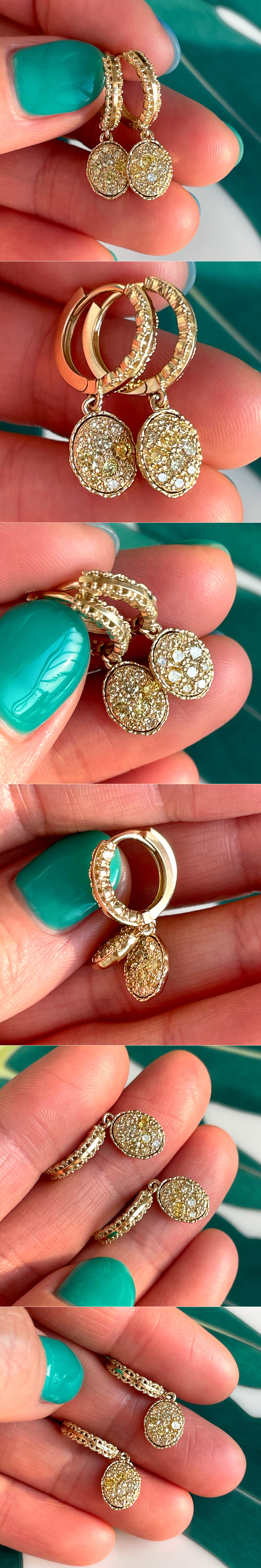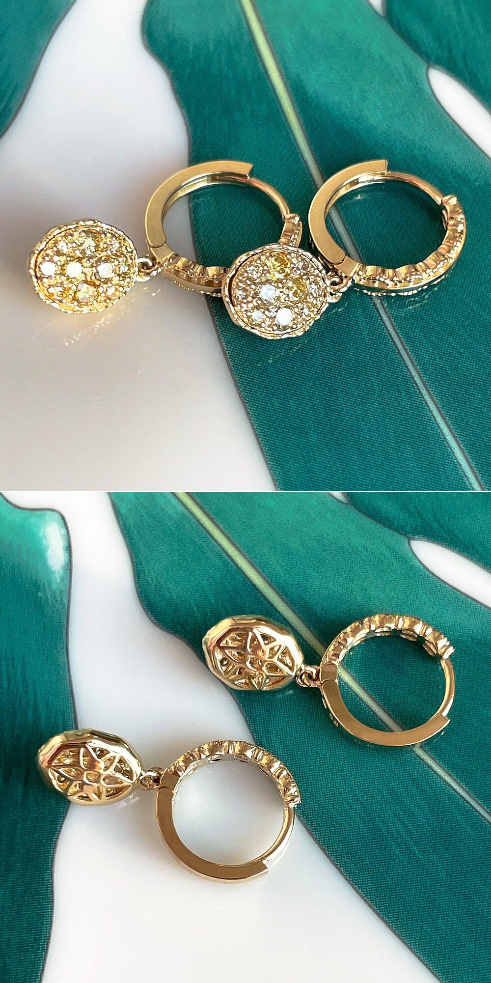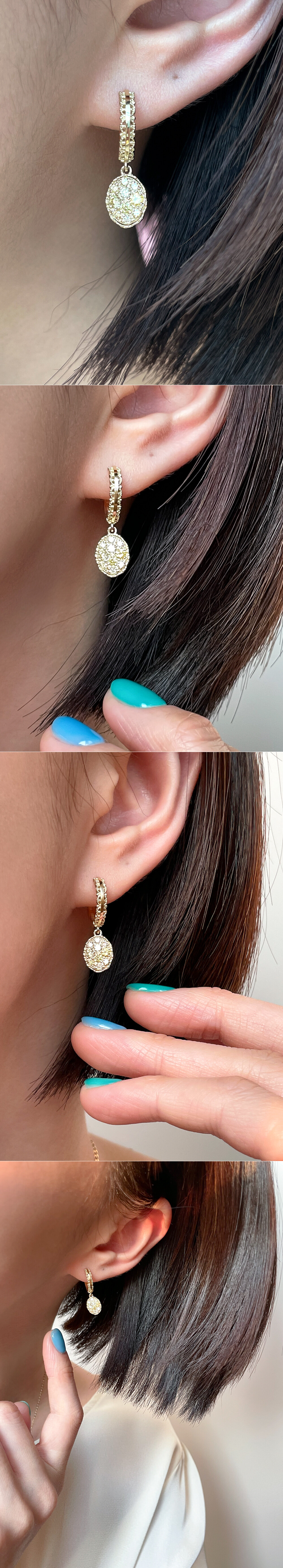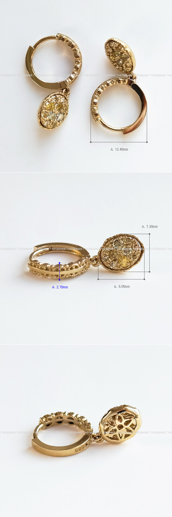 밝고 화사한 빛깔의 옐로우 다이아몬드가 세팅된 링 귀걸이입니다. 🌼💛✨ 다양한 빛깔을 가진 내추럴 옐로우 다이아몬드들이 고루고루 세팅되어 있어서, 뭐랄까 .. 천연 다이아몬드의 고급스럽고 우아한 금빛을 그대로 머금고 있는 것 같은 느낌이에요. 링 부분도 은은하고 섬세한 레이스 디자인으로 마감되어 여리여리한 느낌으로 여성적인 이미지를 연출하시고 싶으신 분들께 좋을 것 같아요. 스톤이 세팅된 부분이나 프롱 등 마감 상태도 깔끔하고 정결하게 잘 정돈되어 있는 디자인으로 전체적인 디자인 퀄리티가 너무 좋은 제품이라고 칭찬할게요. 원터치 스타일의 링 귀걸이라서 탈착도 편안하답니다! 아름다운 빛깔의 다이아몬드 귀걸이를 찾으시는 분들께 데일리 및 포인트 귀걸이로 추천해 드릴게요 :) 💖