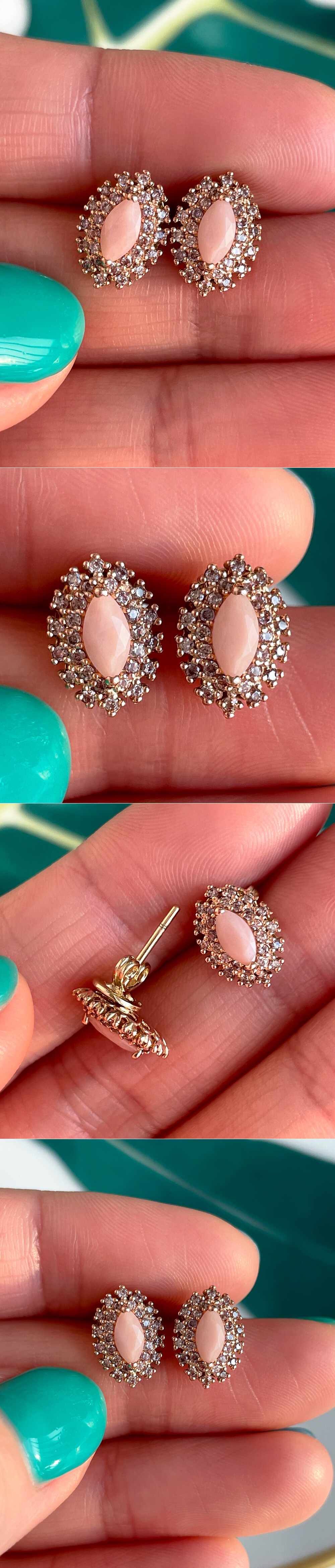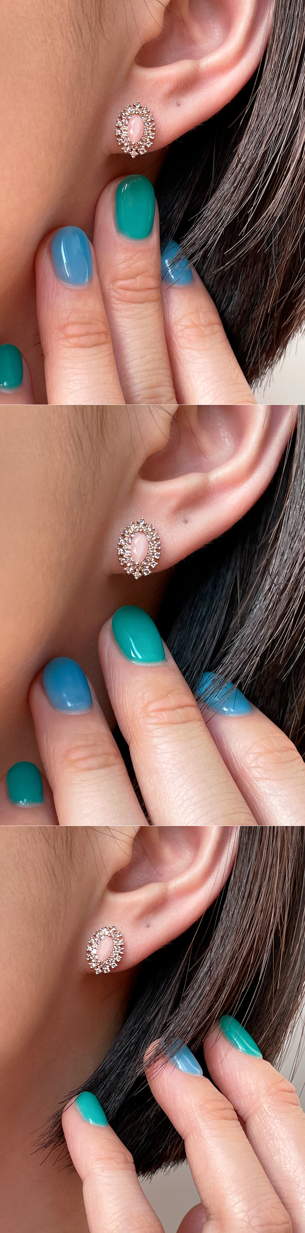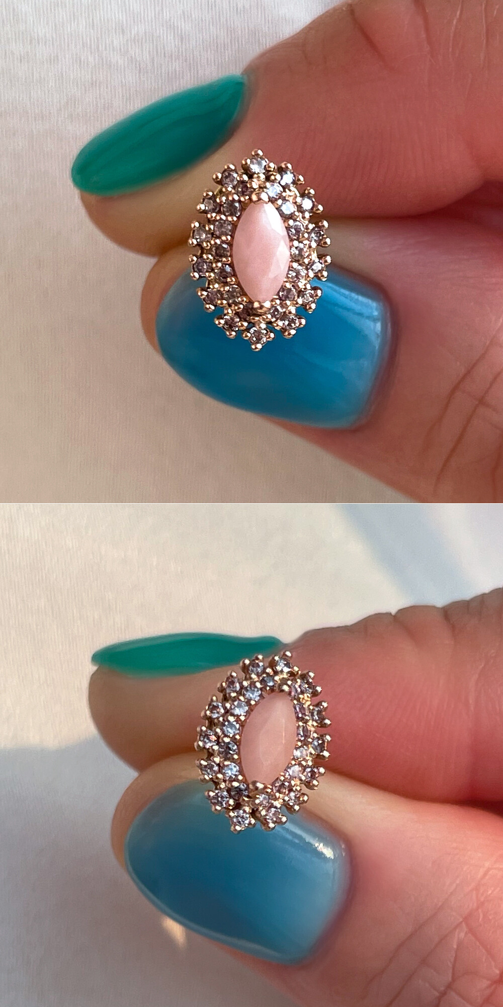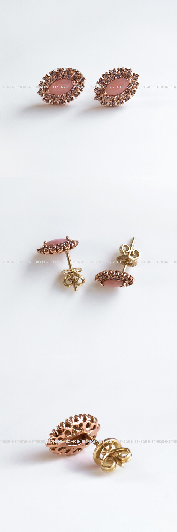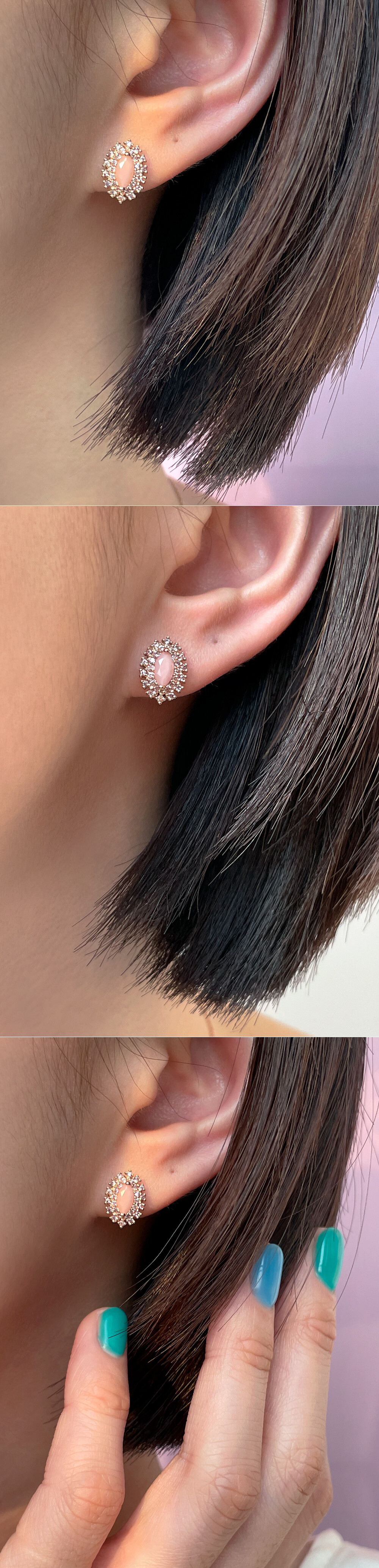 반짝반짝~ ✨ 사랑스럽고 러블리한 컬러를 가진 핑크 오팔 귀걸이입니다. 💍 귀한 마퀴즈 쉐입의 패시티드 핑크 오팔이 메인으로 세팅된 헤일로 디자인의 귀걸이로, 서브 스톤으로는 아주 은은한 브라운~그레이 톤의 흐린 코냑 컬러의 큐빅이 세팅되었어요. 자세히 눈여겨보지 않으면 일반 화이트(투명) 한 컬러의 큐빅처럼 보이기도 합니다! 😃 큐빅 사이즈가 작아서 육안으로 보았을 때는 보통의 화이트 큐빅과 아주 큰 색 차이는 없어 보이지만 코냑 컬러 큐빅입니다. 민감하신 분들을 위해 기본 화이트(투명) 큐빅으로 변경하실 수 있도록 옵션을 만들어 놓았으니 큐빅 색상 변경을 원하시는 분들은 추가 옵션에서 변경해 주세요. 🩷 작지만 섬세한 디자인으로 전체적으로 고급스러움이 느껴집니다. 자세한 디자인은 영상을 통해서 확인해 주세요. 작지만 화려한 이미지를 뽐내는 디자인으로 특별한 날에 착용하실 포인트 귀걸이를 찾으시는 분들께 추천해 드릴게요! 👏🏼