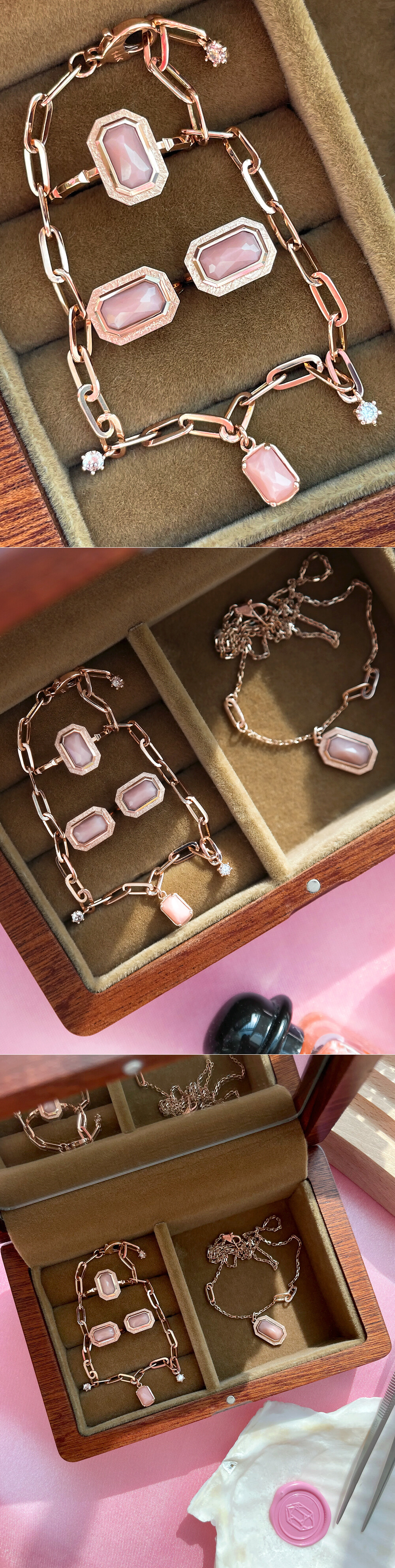 로즈컷 사각 핑크 오팔 링 귀걸이