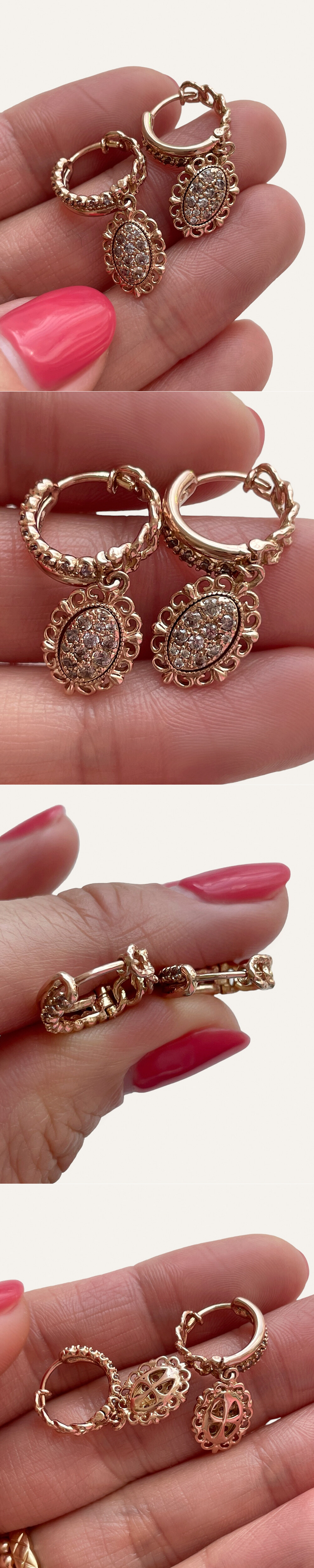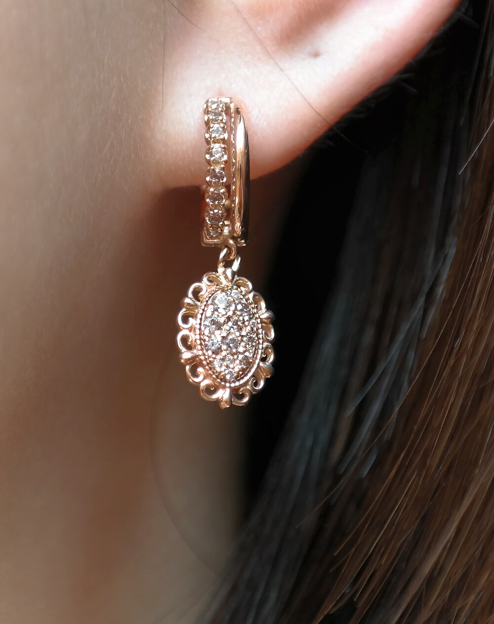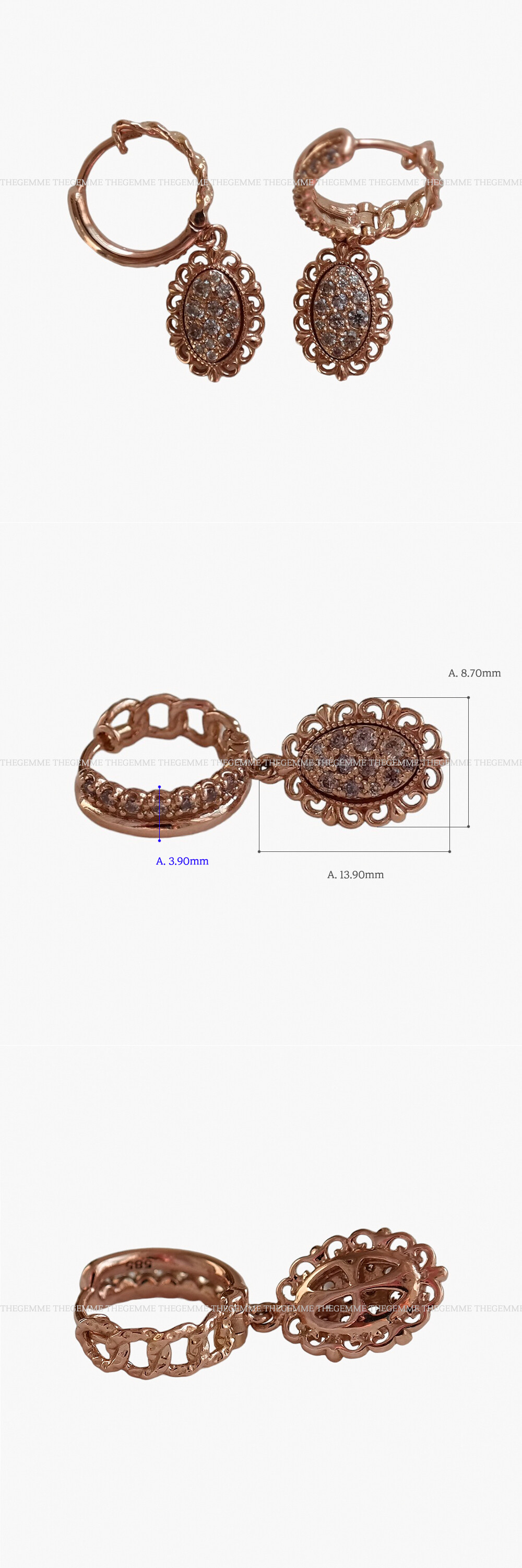 수려한 곡선 장식으로 마감된 고급스러운 느낌의 링 귀걸이입니다. 💍 마치 꽃이 피고 있는 듯한 느낌을 연상케 하는 디자인으로 여성미가 돋보이는 귀걸이에요. 링 부분은 탈착이 편안한 원터치 장식이구요, 믹스 체인 디자인으로 유니크한 멋스러움까지 더해졌답니다 :) 스톤은 코냑 다이아몬드 색상과 비슷한 브라운 톤의 코냑 큐빅이 세팅되었어요. 원하시는 경우 코냑 다이아몬드 또는 다른 스톤으로도 대체 가능합니다. 흔하지 않는 디자인의 여성스러운 귀걸이를 찾으시는 분들께 포인트 귀걸이로 추천해 드릴게요. 🧡