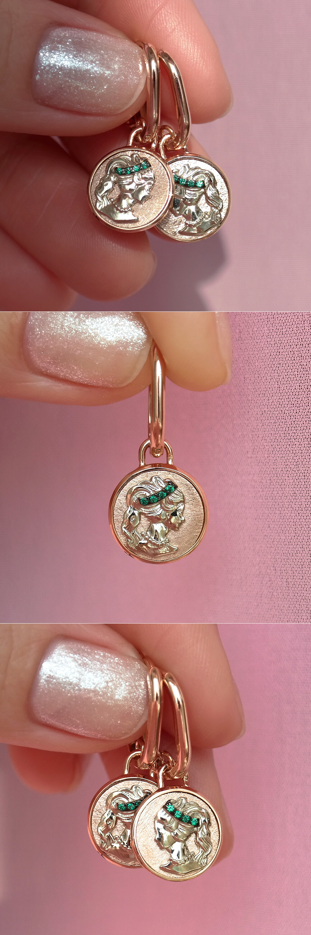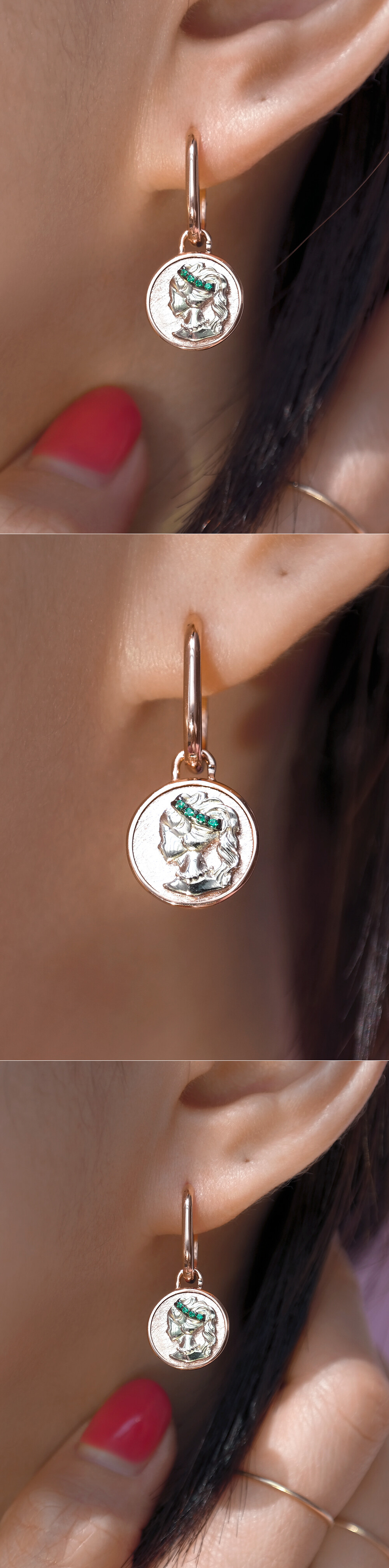 여성미가 물씬 풍기는 고급스러운 디자인의 코인 귀걸이입니다. 💍 간편한 원터치 스타일의 링 귀걸이구요, 팬던트는 한눈에 보아도 우아함이 가득한 여인의 모습이 양각으로 장식된 코인 디자인이랍니다. 골드 색상은 기본 투톤 디자인이구요, 중앙에 있는 여인 부분이 포인트 골드 색상입니다. (포인트 골드 색상은 작성형 옵션에 직접 입력해 주세요. * 원톤으로 주문 시에는 기본 골드 색상과 포인트 골드 색상을 동일하게 선택해 주시면 됩니다.) 참고해 주시구요, 이미지에서 보여지는 여인의 헤어밴드 부분에는 그린 다이아몬드가 세팅된 모습입니다. 주문 시에도 같은 그린 다이아몬드로 세팅되어요. (다른 색상의 다이아몬드나 기타 스톤으로도 변경 가능하니 원하시는 분들은 네이버 톡톡으로 따로 문의주세요.) 그리고 다이아몬드가 세팅된 부분에 까맣게 보이는 부분은 블랙도금 처리가 되어있는 것이랍니다. 블랙 도금을 바탕에 깔면 다이아몬드가 더 쨍하게 빛나는 효과가 있어요. 게다가 전체적으로 샌딩된 무광 디자인이 골고루 믹스되어 있어서 보면 볼수록 은은한 골드의 광택에 빠져들게 된답니다. 정말 유니크하죠? 코인 스타일의 귀걸이를 좋아하시는 분들이라면 아마 정말 좋아하실 것 같아요. 매일매일 착용하실 데일리용 포인트 및 레이어드 귀걸이를 찾으시는 분들께 적극 추천해 드릴게요. 💚
