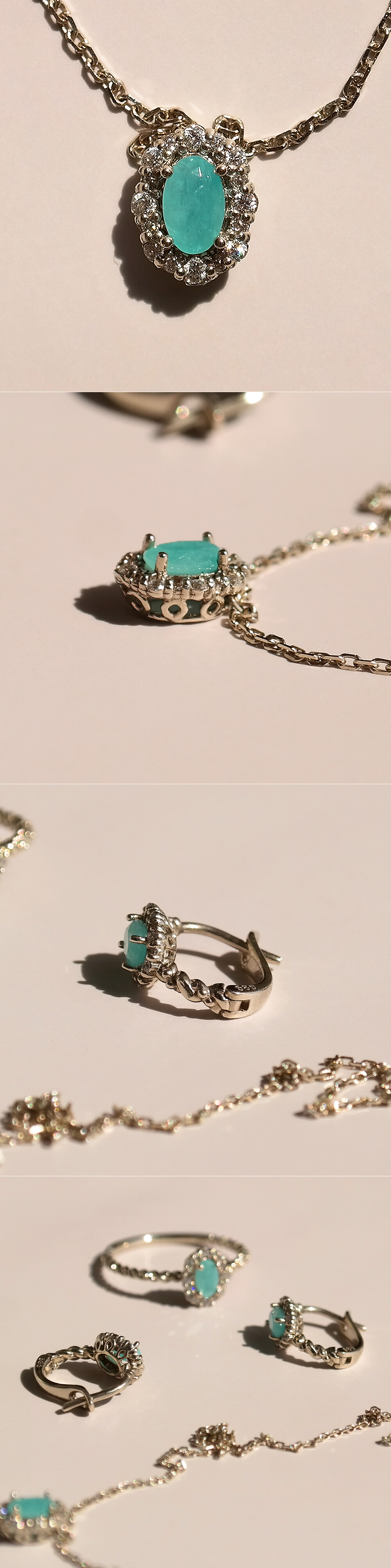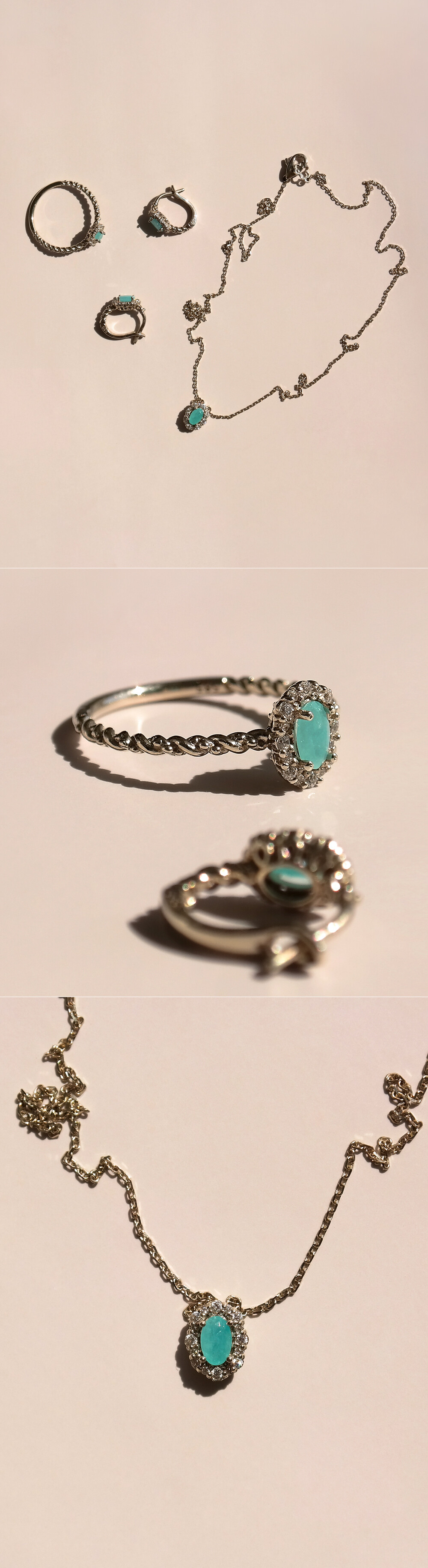 아마조나이트는 아름다운 청록색을 띠는 보석으로, 고대부터 사람들에게 신비한 의미와 전설을 전해준 광물입니다. 묘한 블루 빛을 띄는 색감으로 인해 오랫동안 "신의 선물"이라고 불려온 이 아마조나이트의 이름은 남미의 아마존 강 (Amazon River) 에서 유래했지만, 실제로 아마존에서는 산출되지 않아요. 주요 산지는 러시아, 미국 (콜라로도), 브라질, 마다가스카르 등이며, 광물의 특성상 ; 투명한 스톤은 아니라 아름다운 색감에 비해 가격이 저렴한 보석이랍니다. 보면 볼수록 예뻐보이는 색감이에요. 언틋, 색감만 보면 최상급의 아리조나산 터쿼이즈와 색이 유사해 보이기도 합니다. 촬영된 이미지는 볕이 드는 자연광에서 촬영되어 약간 노란빛이 올라오니 이 점 참고해 주시구요, 자세한 색감과 디자인은 영상에서 확인해 주세요.