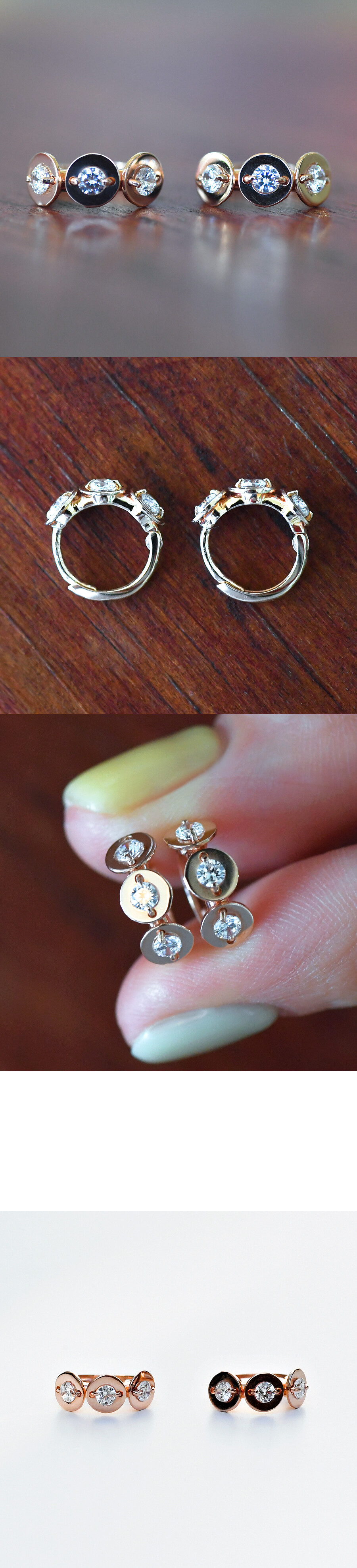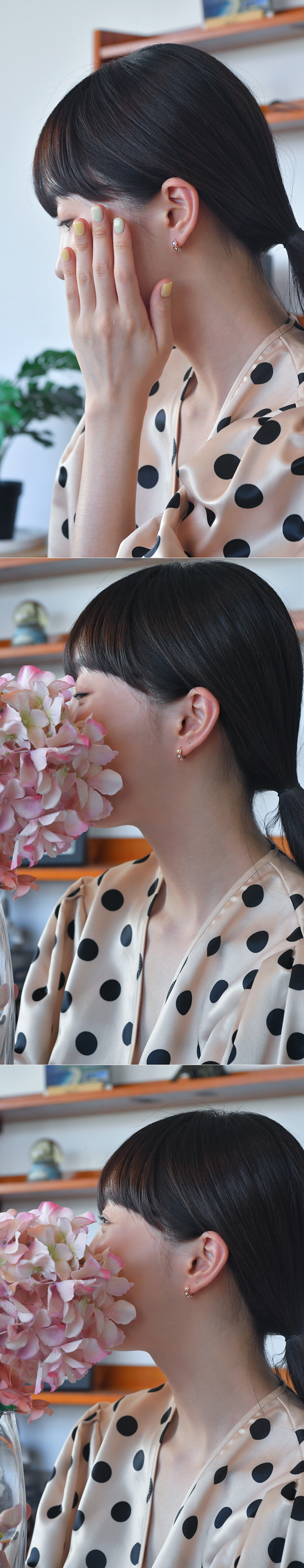 세련되고 귀여운 디자인의 링 귀걸이입니다. 내폭 지름이 약 7mm 정도로 귀에 딱 달라붙게 착용하시기 좋은 미니멀한 사이즈입니다. 작지만 포인트를 줄 수 있는 디자인으로 데일리 귀걸이로 추천해 드립니다 :)