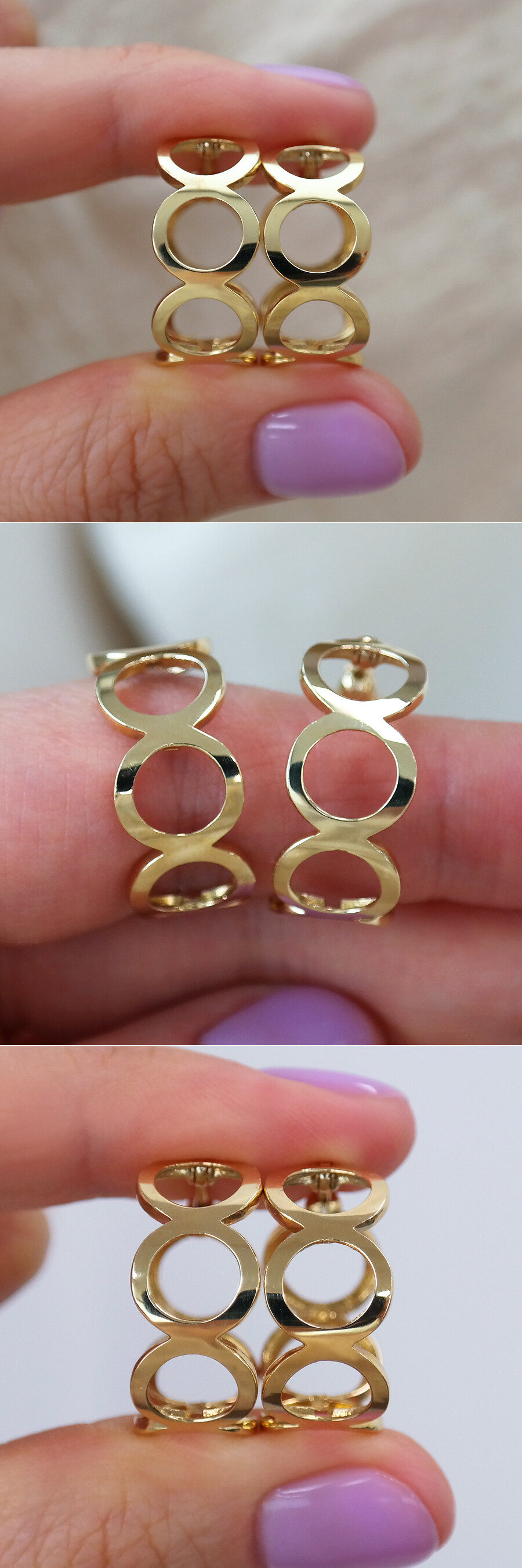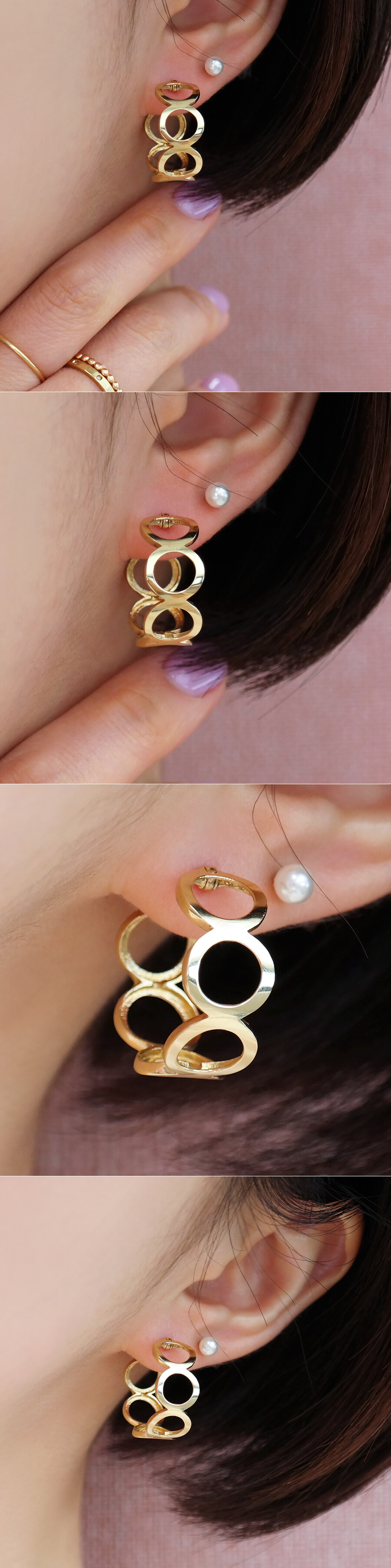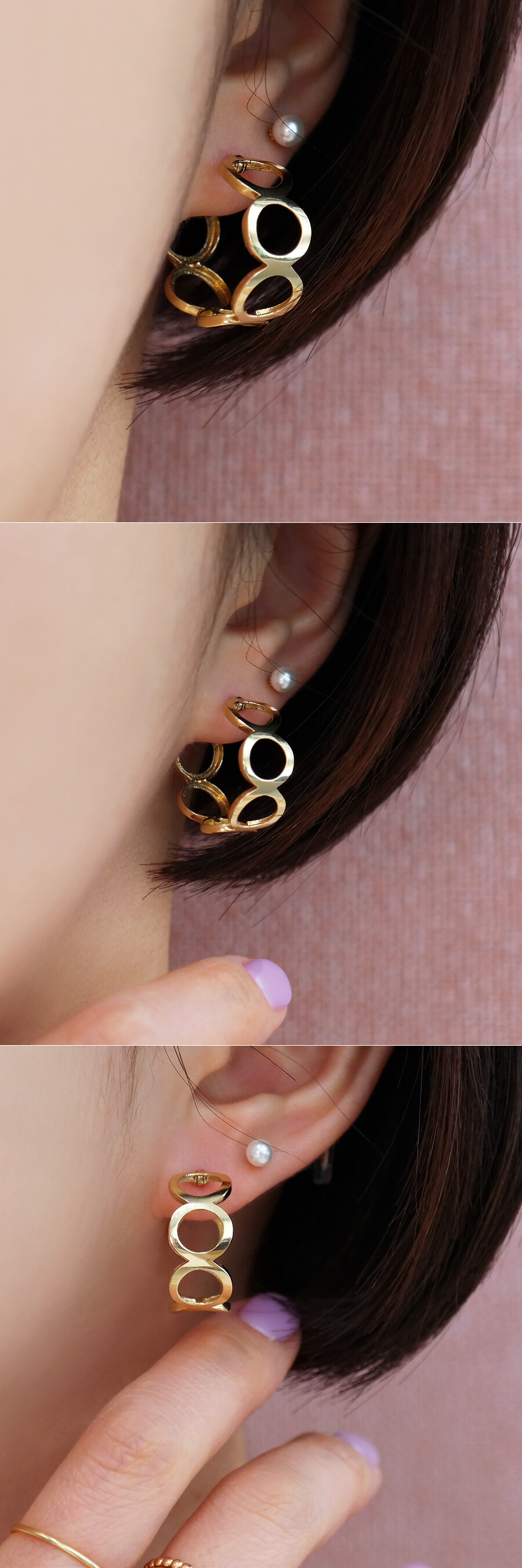 동그란 원형의 모양이 줄줄이 연결된 디자인의 링 귀걸이입니다. 링 지름 약 2CM로 사이즈가 큰 편이라 중량감이 어느 정도 있어요. 유니크한 느낌의 귀걸이를 찾으시는 분들께 추천해 드릴게요 :)