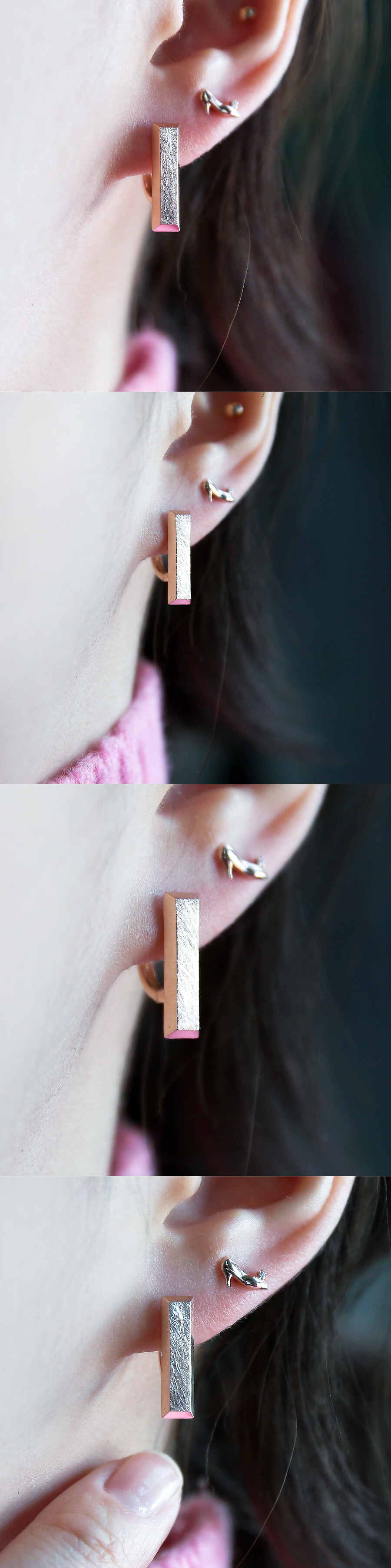 세련된 사각 디자인의 링 귀걸이입니다. 스틱형 디자인으로 세련된 이미지를 연출하시기 좋으며, 앤틱한 느낌을 가진 표면의 무광 처리는 유광으로도 변경하셔서 주문 가능합니다. 탈착이 편안한 원터치 스타일로 데일리 및 포인트 귀걸이로 활용하시기 좋아요. ♥