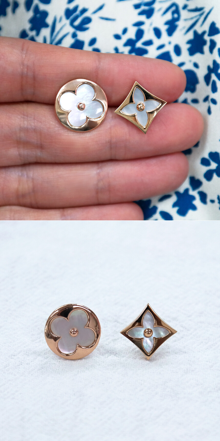 깔끔한 크로버 디자인의 스터드 귀걸이입니다. 크로버 내부에는 화이트 자개 스톤이 세팅되었어요. 디자인은 두 가지 타입으로 라운드 크로버와 뾰족 크로버 디자인이 있습니다. 주문 시에는 이미지와 같은 1. 언발 한 쌍, 2. 라운드 크로버 한 쌍, 3. 뾰족 크로버 한 쌍 중에서 원하시는 세트로 주문이 가능합니다. 단조롭게 감싸진 디자인으로 깔끔하면서도 자개의 마더 오브 펄 효과 때문에 밝고 화사한 느낌이 있어서 보면 볼수록 여성스러운 느낌이 물씬 풍기는 귀걸이에요. 고급스럽고 화사한 느낌의 귀걸이를 찾으시는 분들께 추천해 드릴게요 :)