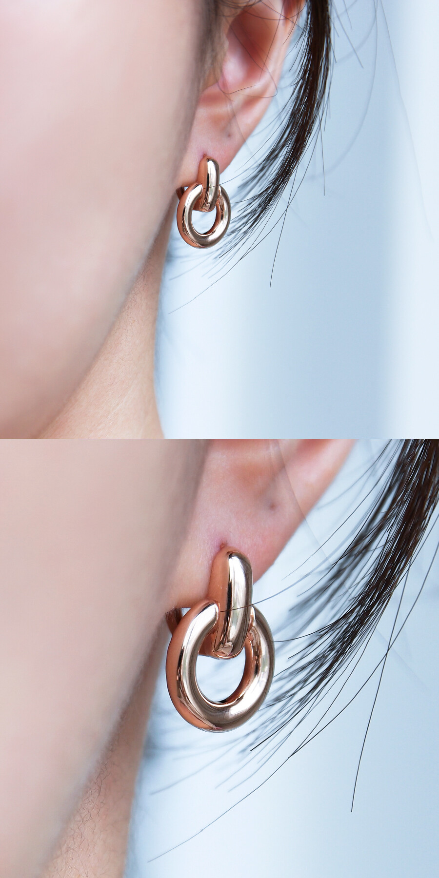 원형 디자인의 링 귀걸이입니다. 깔끔하면서 볼드한 스타일로 어떤 코디에나 모두 잘 어울리는 디자인이에요. 데일리 및 포인트 귀걸이로 추천해 드릴게요 :)