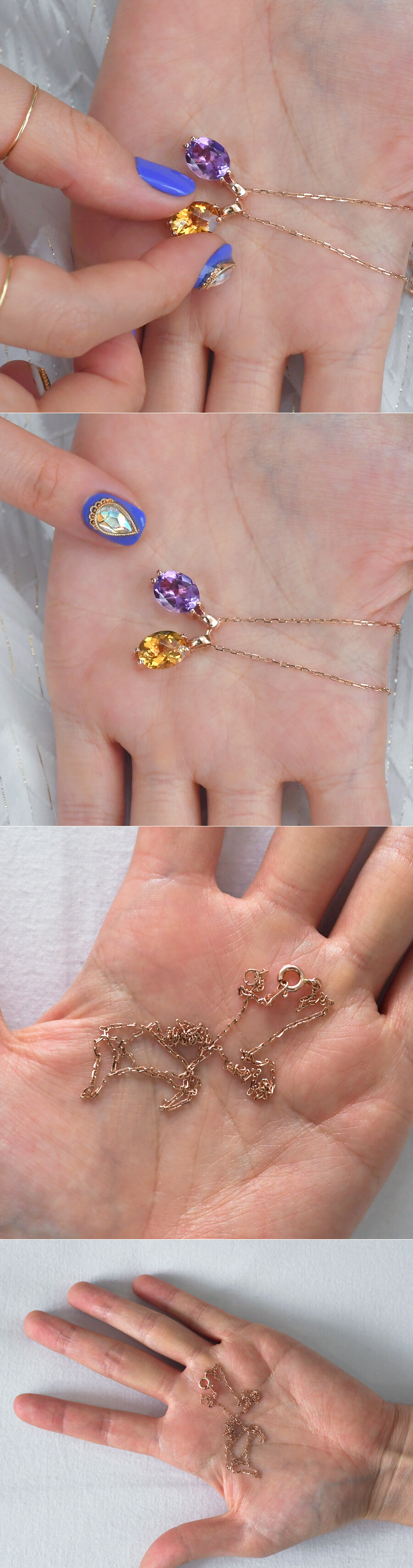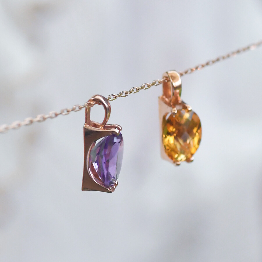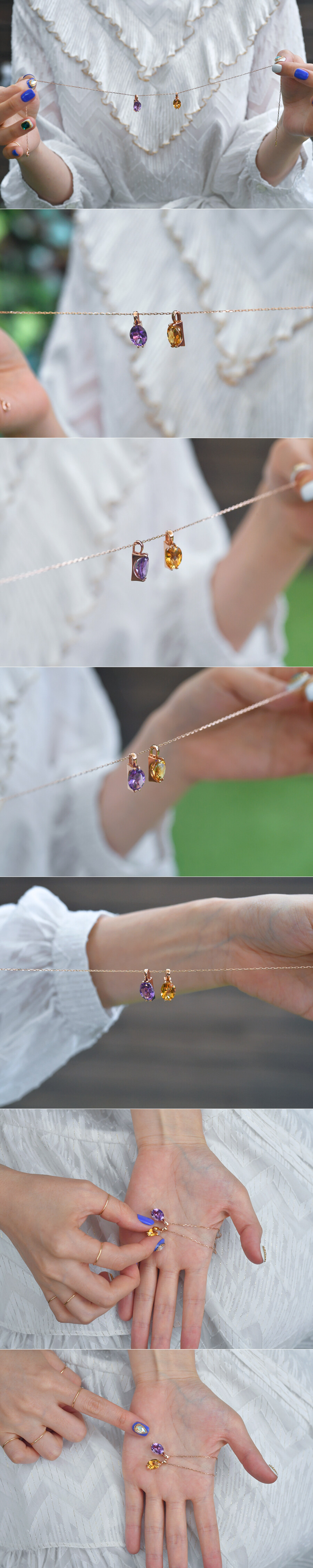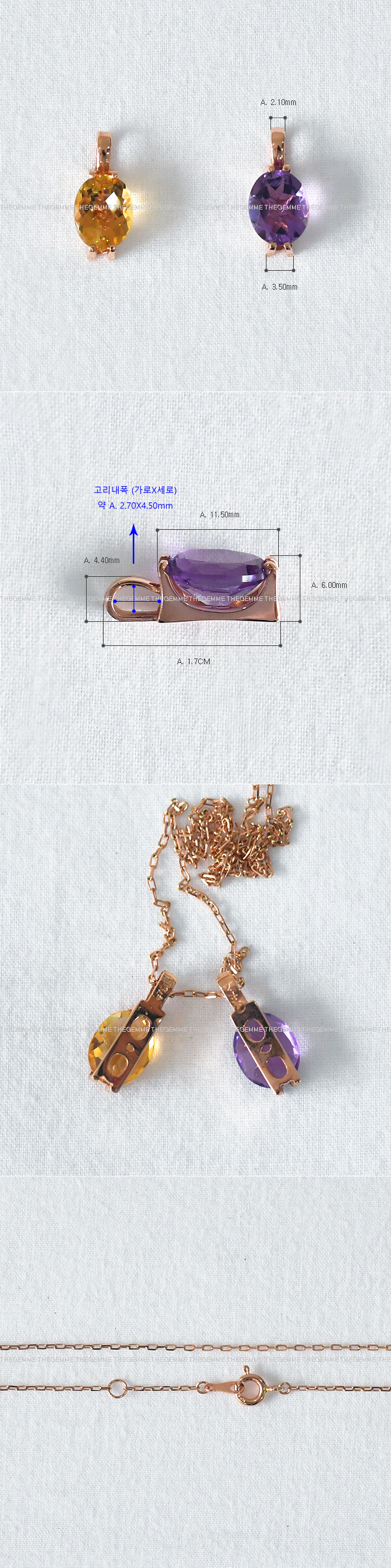 사이즈가 비교적 큰 10X8 사이즈의 골든 시트린과 밝은 컬러의 자수정을 세팅한 자체 제작 목걸이 팬던트입니다. 골든 시트린은 열처리를 통해서 고급스럽고 아름다운 황금빛을 가지게 된 엑스트라 골든 시트린이며, 자수정은 밝고 투명한 스톤으로 천연의 순수함을 머금고 있는 아이랍니다. 둘 다 모두 최상급 퀄리티를 가지고 있어요. 자세히 보시면 두 가지 스톤의 차이점이 있는데, 자수정은 브릴리언트컷 스톤이며, 골든 시트린은 체커컷 스톤입니다. 스톤의 커팅 모양은 하단의 이미지에서 자세히 확인해 주시기 바랍니다 :) 스톤의 사이즈가 크기 때문에 옆면에서 보았을 때는 프롱이 높은 편에 속합니다. 다만, 스톤을 많이 가리지 않은 디자인이라 빛이 투과할 수 있는 공간이 많다 보니 아이들이 더욱더 영롱하게 빛을 뿜어낸다는 특징이 있어요. 팬던트 고리의 내경이 넉넉해서 웬만한 체인들과 호환하여 착용하실 수 있는 아이랍니다! (굵은 체인의 경우에는, 페이지 가장 하단의 상세 이미지를 통해 잠금 장식 사이즈를 체크해 주세요.) 중요한 날, 우아한 매력으로 장식할 포인트 팬던트로 추천해 드립니다. * 옵션에서 함께 레이어드 된 체인 추가 가능합니다.