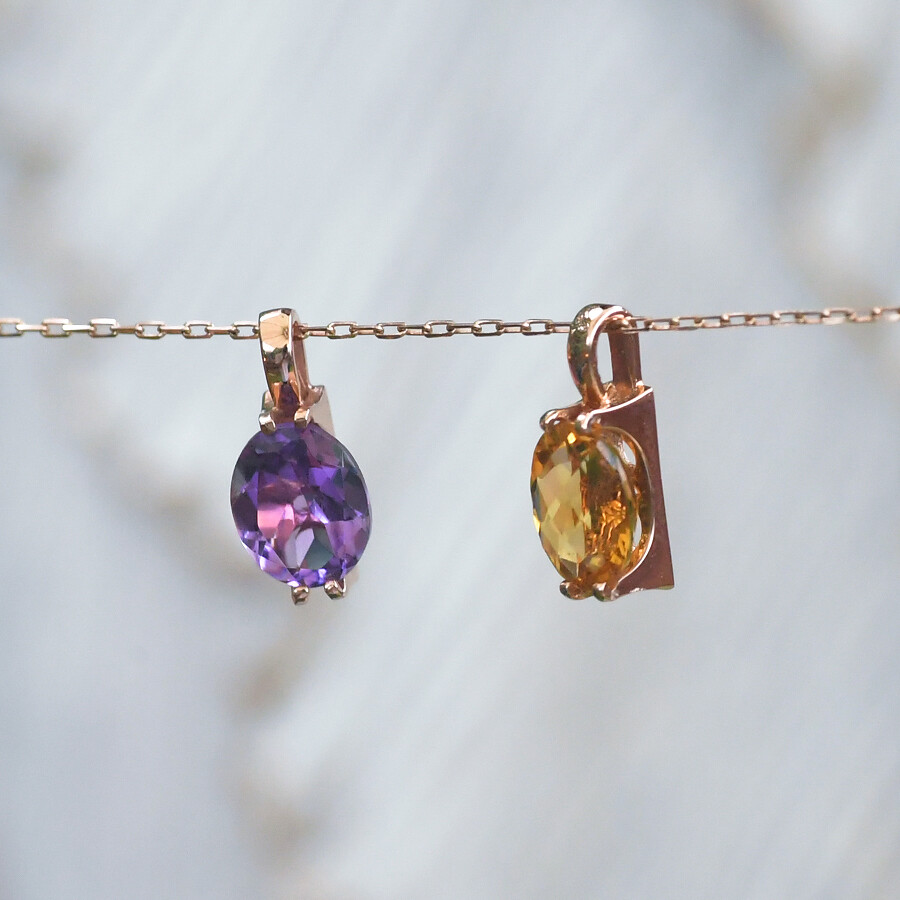 자세히 보시면 커팅 모양이 다른 걸 확인하실 수 있으세요. (자수정 - 브릴리언트 컷, 시트린 - 체커 컷)