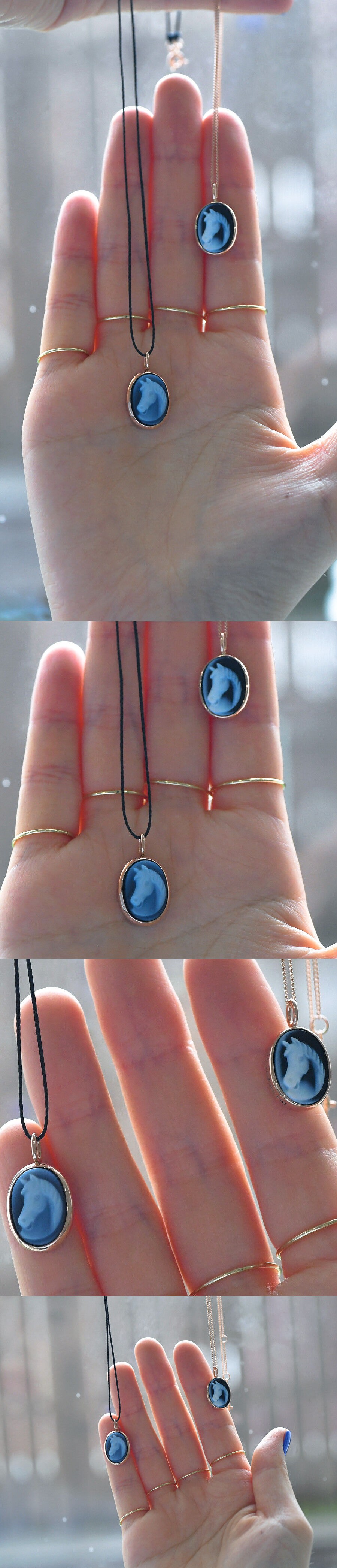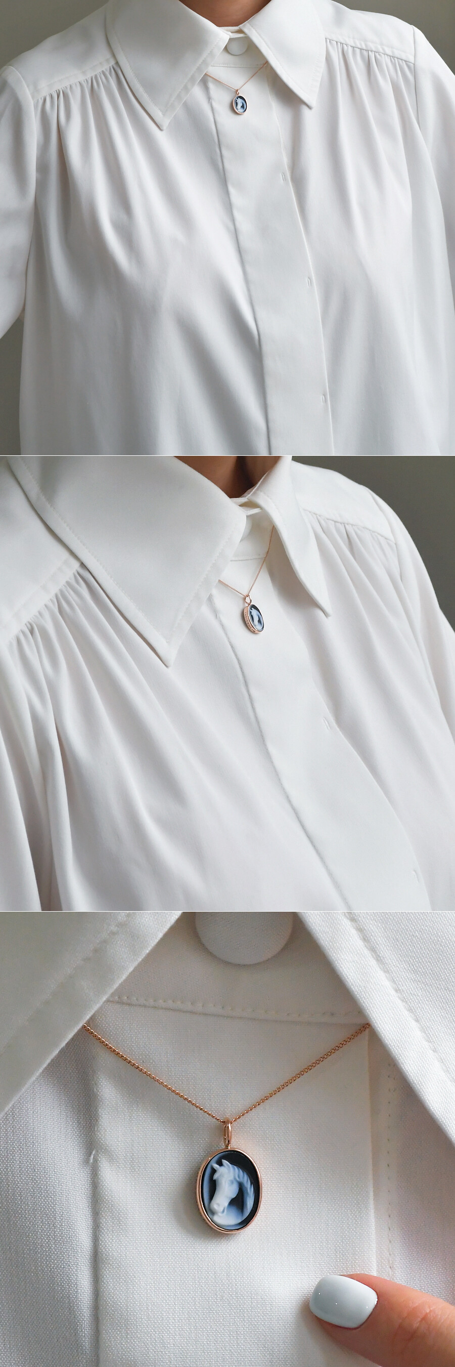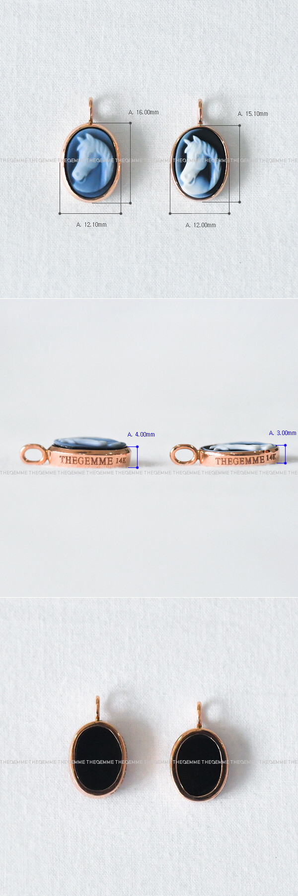 블랙 아게이트를 섬세하게 조각한 카메오 팬던트입니다. 말의 얼굴이 새겨진 카메오를 깔끔한 베즐 세팅으로 감싸서 심플하게 제작하였어요. 카메오 색상은 전체적으로 블랙 바탕에 잔잔한 블루 베이스가 맴도는 색상을 가진 원석과, 블랙과 화이트 대비가 분명한 원석으로 두 가지 종류입니다. 서로 고 높이도 다르고 바디 색상에도 차이가 있으며 중량감도 달라서 각각 가격 차이가 있으니 원석의 번호를 확인하시고 구매해 주세요 :) * 기본 설정가는 팬던트 가격이며, 함께 레이어드 한 체인과 함께 구매 가능한 ⓐ 팬던트 + 골드 체인, ⓑ 팬던트 + 실크 체인 구성으로 옵션에서 선택하셔서 구매하실 수 있으니 이 점 참고해 주세요.