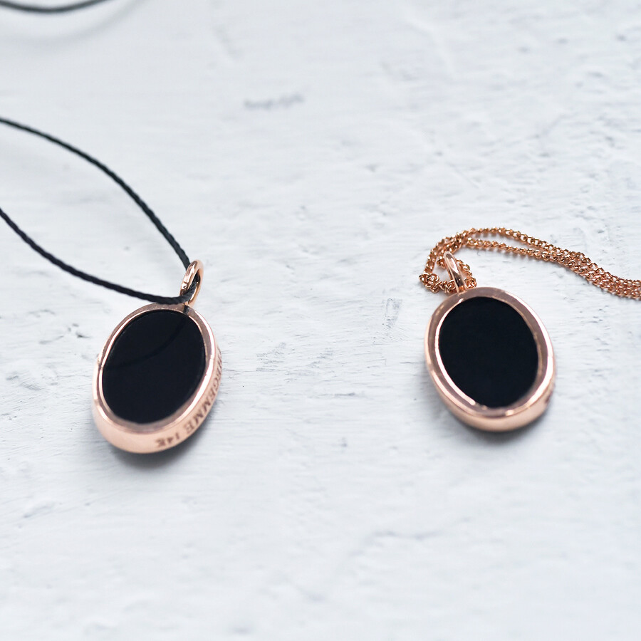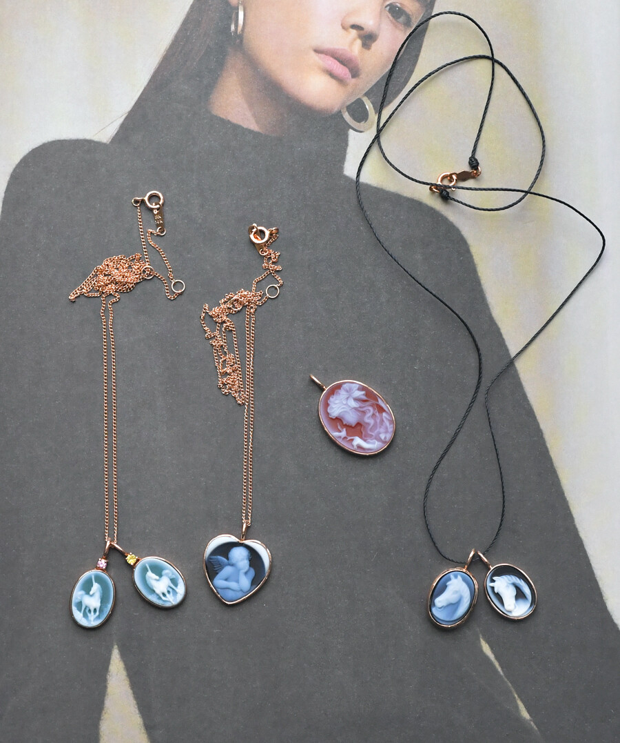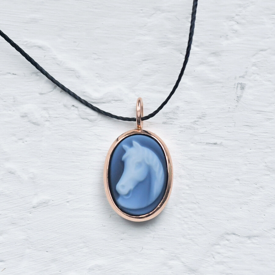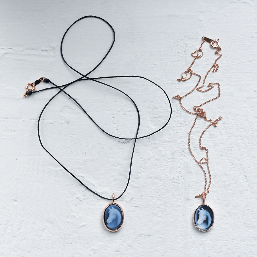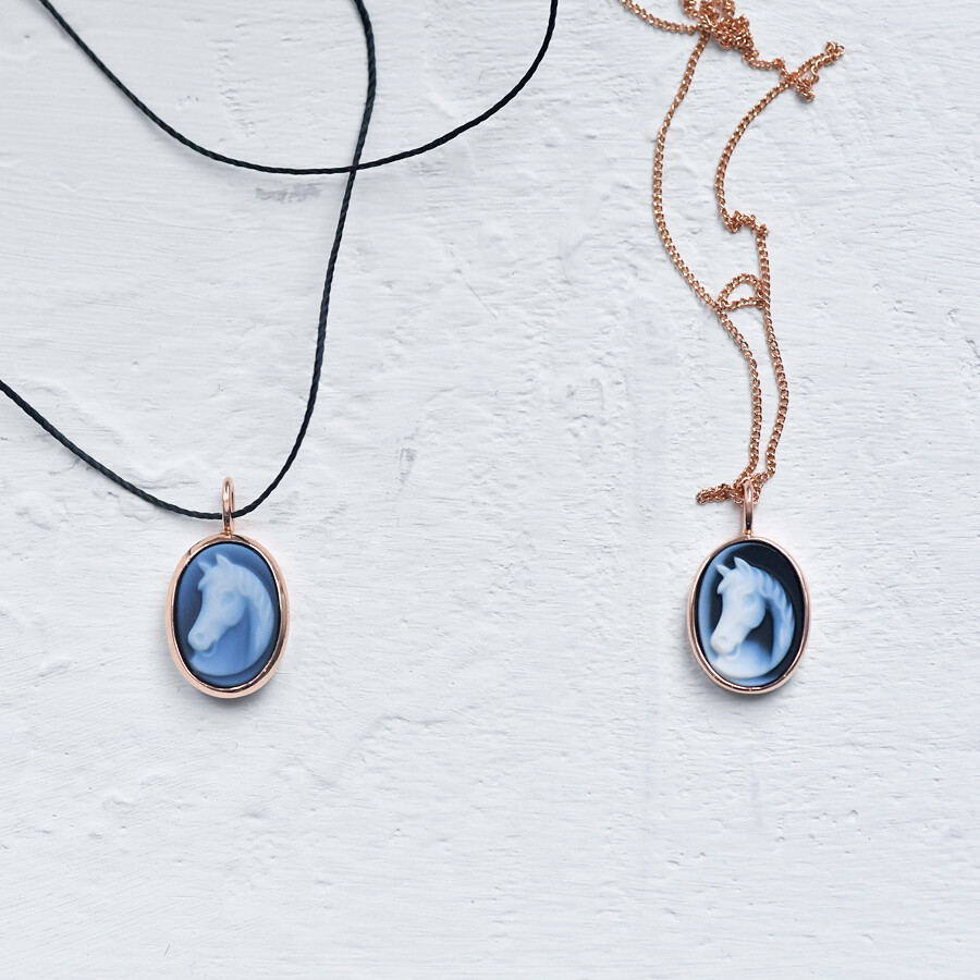 블랙 아게이트를 섬세하게 조각한 카메오 팬던트입니다. 말의 얼굴이 새겨진 카메오를 깔끔한 베즐 세팅으로 감싸서 심플하게 제작하였어요. 카메오 색상은 전체적으로 블랙 바탕에 잔잔한 블루 베이스가 맴도는 색상을 가진 원석과, 블랙과 화이트 대비가 분명한 원석으로 두 가지 종류입니다. 서로 고 높이도 다르고 바디 색상에도 차이가 있으며 중량감도 달라서 각각 가격 차이가 있으니 원석의 번호를 확인하시고 구매해 주세요 :) * 기본 설정가는 팬던트 가격이며, 함께 레이어드 한 체인과 함께 구매 가능한 ⓐ 팬던트 + 골드 체인, ⓑ 팬던트 + 실크 체인 구성으로 옵션에서 선택하셔서 구매하실 수 있으니 이 점 참고해 주세요.