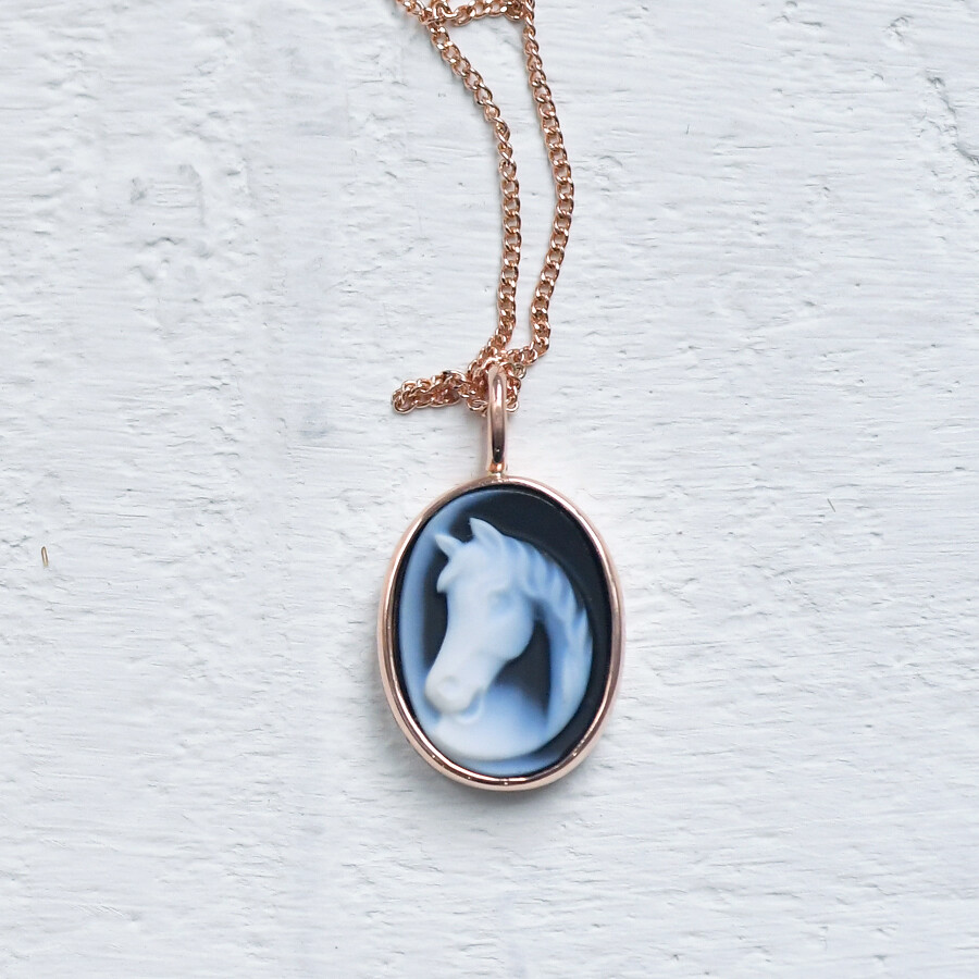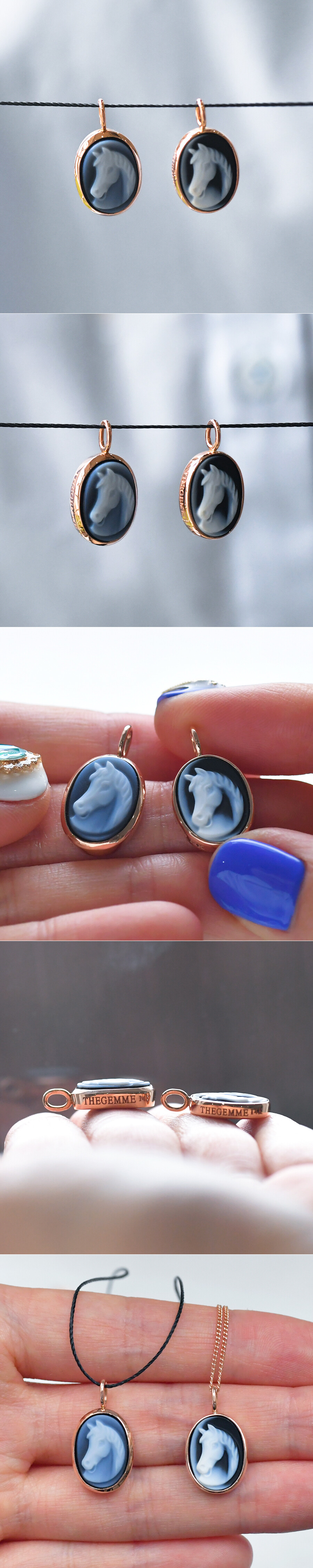 14K 10X14 블랙 아게이트 말 얼굴 카메오 팬던트 & 목걸이