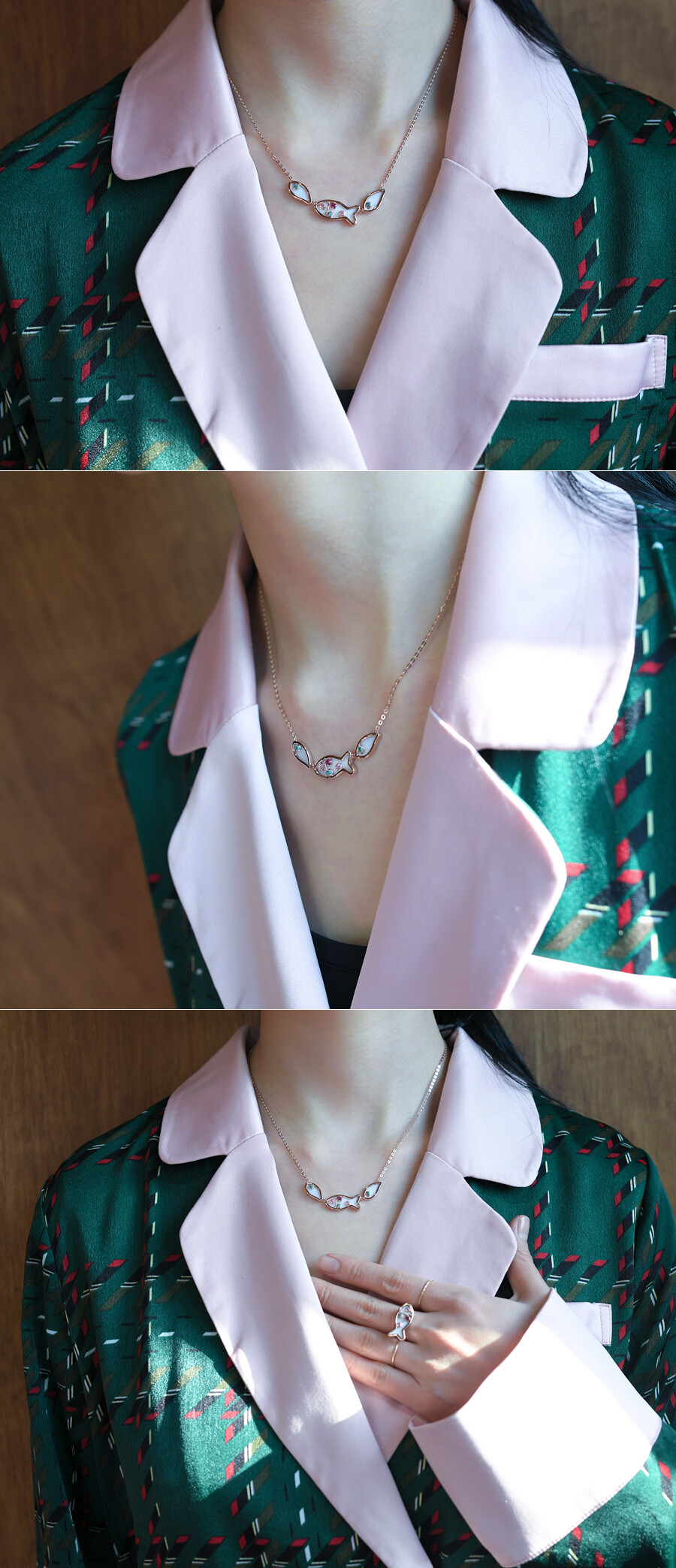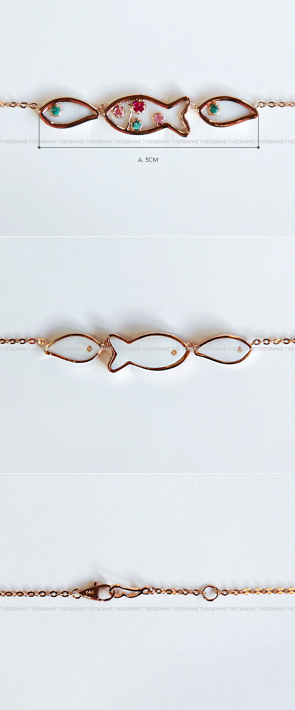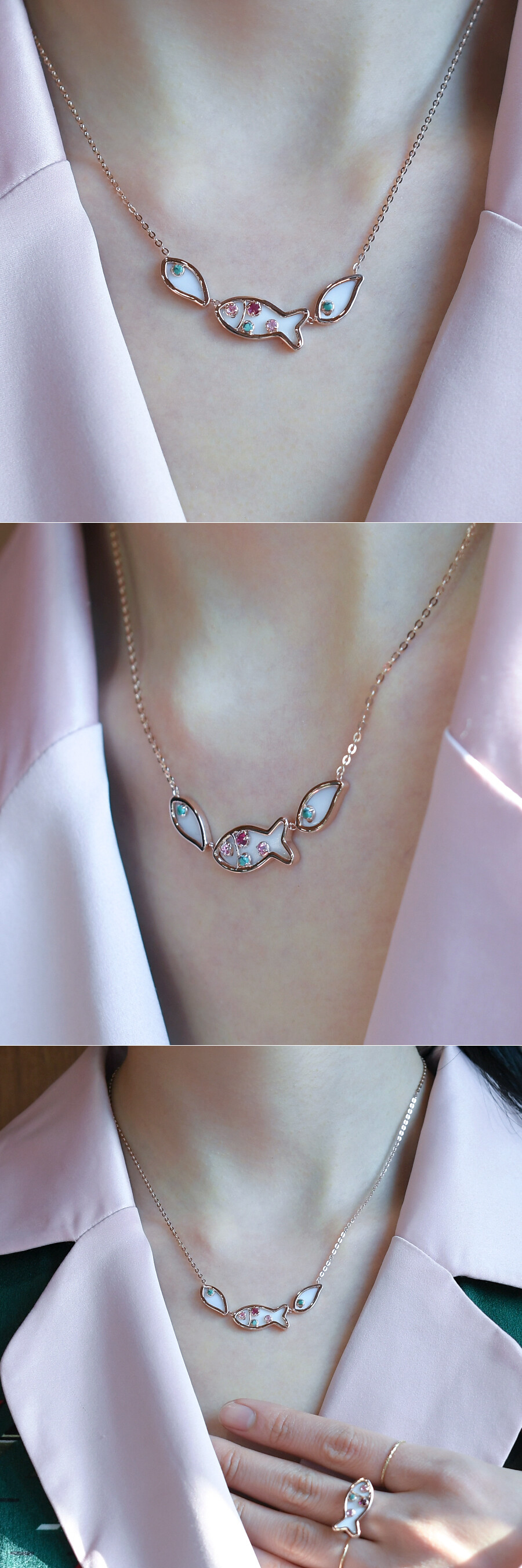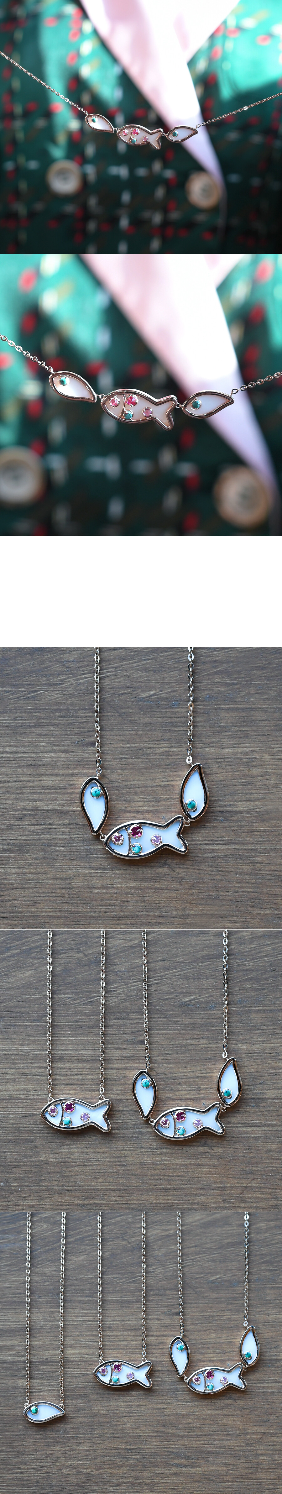 아름다운 빛깔을 뽐내는 물고기 모티브의 목걸이입니다. 유색 보석들로 아기자기하게 꾸며놓은 아이들이구요, 콤비 스타일, 큰 물고기, 작은 물고기 이렇게 세 가지 디자인으로 나뉘며, 이 페이지 제품은 큰 물고기 디자인입니다. 큰 물고기 디자인의 경우, 물고기의 바디는 화이트 자개를 깎아서 세팅한 것이구요, 그와 함께 루비, 핑크 사파이어, 터쿼이즈가 세팅되었습니다. 다양한 스톤이 함께 어우러져 세팅되는 칵테일 스타일의 목걸이로 화사하고 유니크한 느낌의 포인트 목걸이를 찾으시는 분들께 추천해 드릴게요 :)