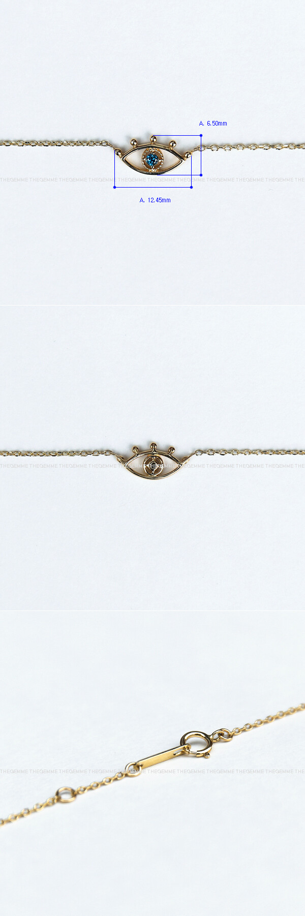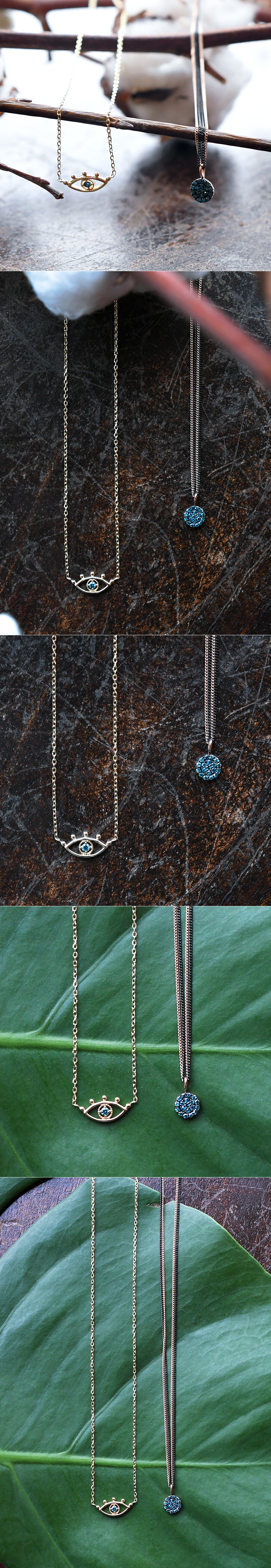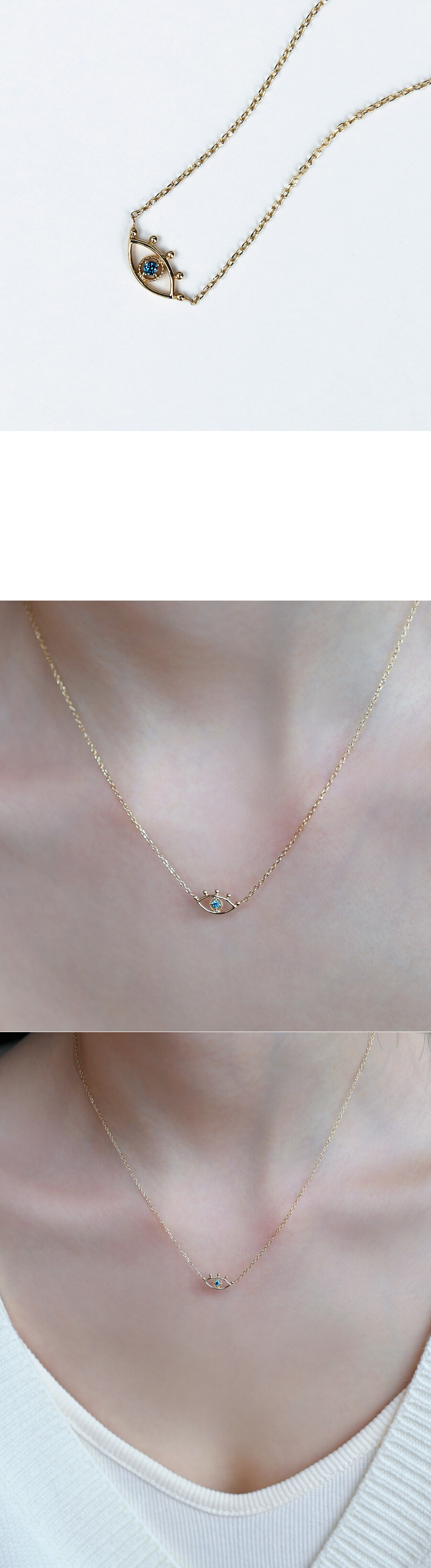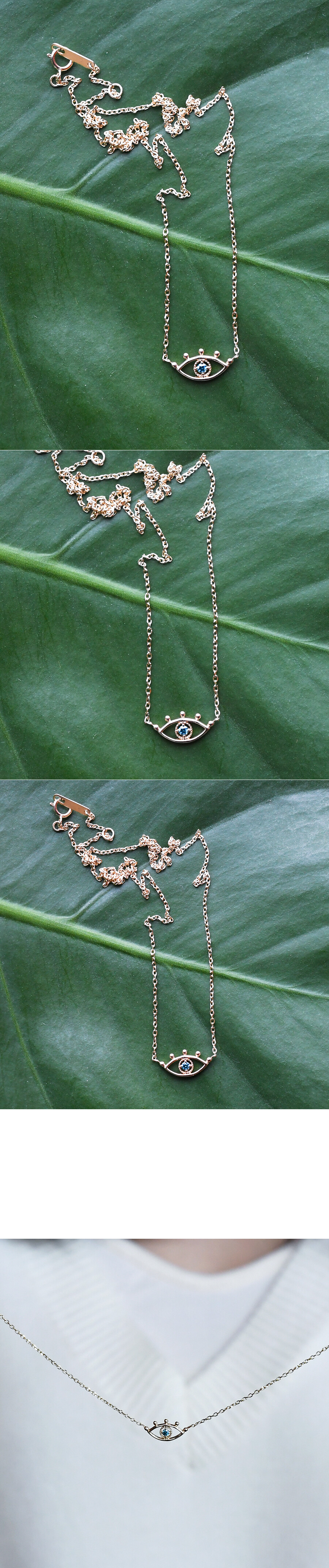 눈 모양의 팬던트 장식에 블루 다이아몬드가 세팅된 포인트 목걸이입니다. 데일리 목걸이로 편안하게 착용하시기 좋아요 :)