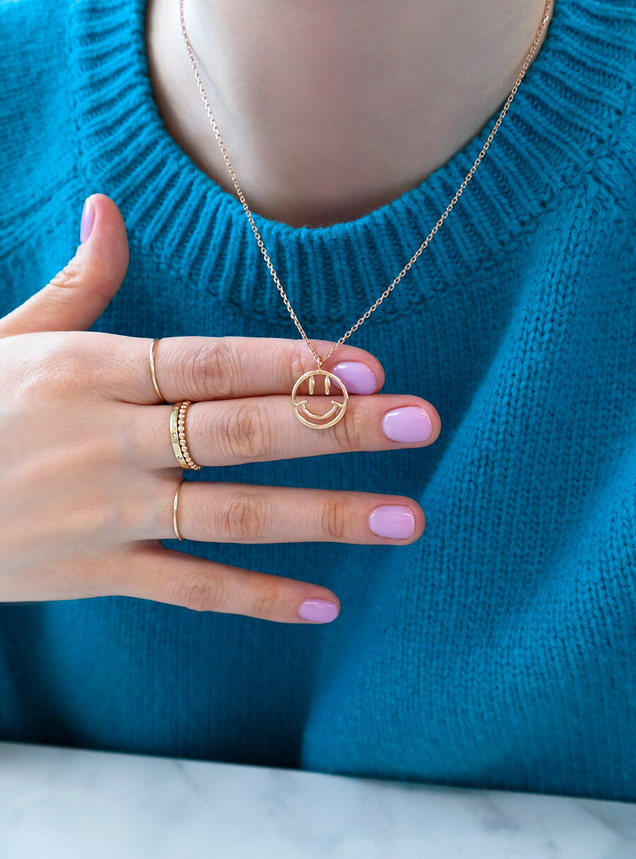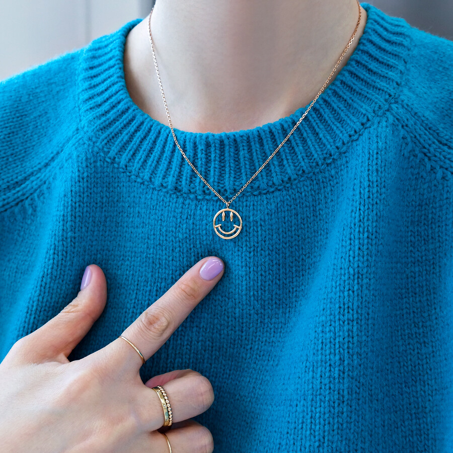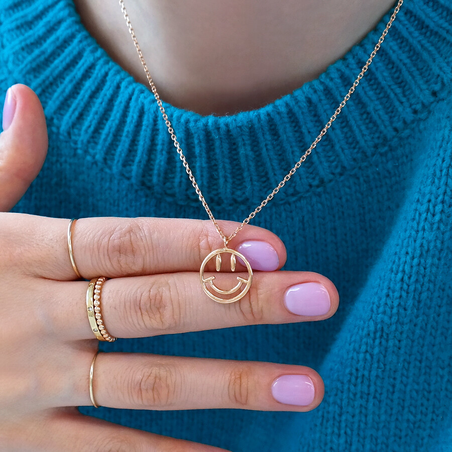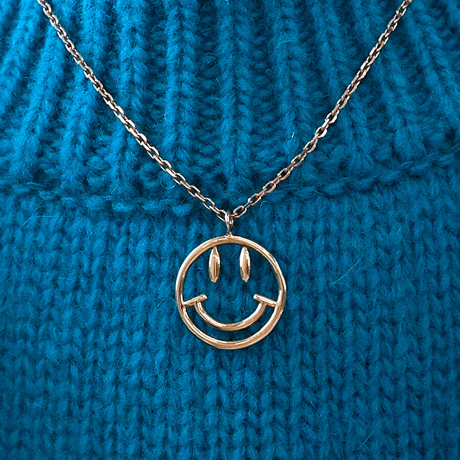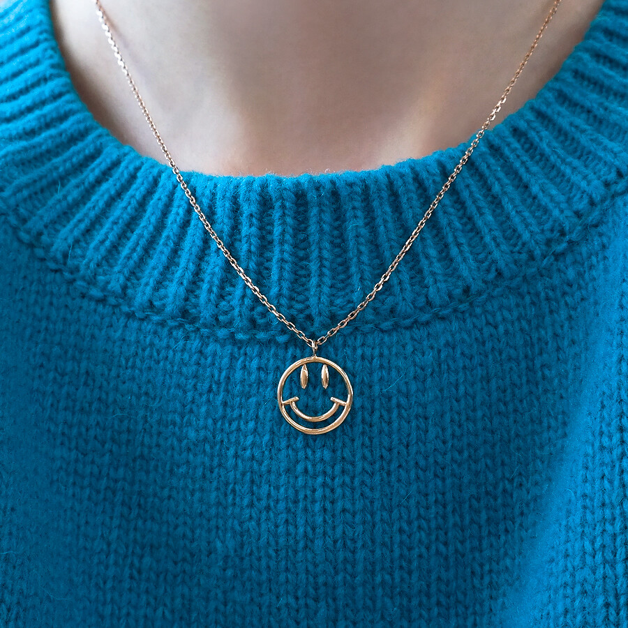 귀여운 표정을 짖고 있는 스마일 팬던트 장식의 목걸이입니다. 😊 체인과 일체형 디자인으로 팬던트 앞/뒷면의 모양이 동일하구요, 지름은 약 1.5CM로 사이즈가 어느 정도 있어서 5푼 굵기의 체인과 함께 레이어드 되었습니다. 캐주얼한 느낌의 목걸이를 좋아하시는 분들께 데일리 및 포인트 목걸이로 추천해드려요. ❤️