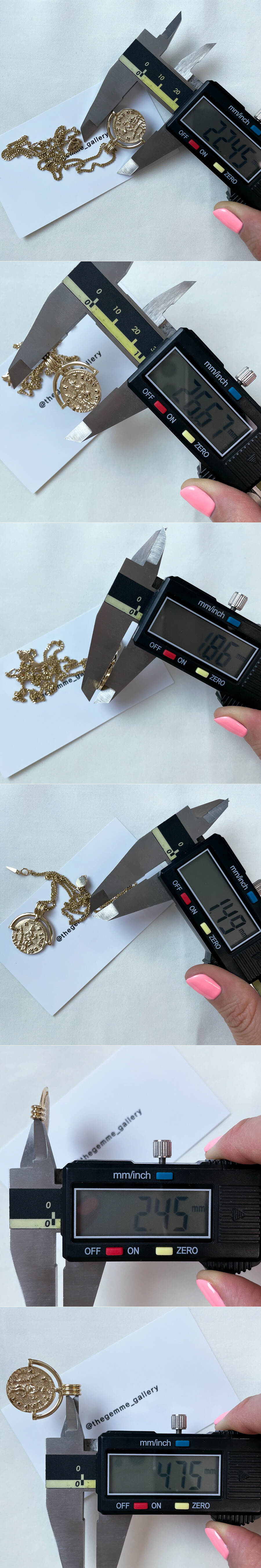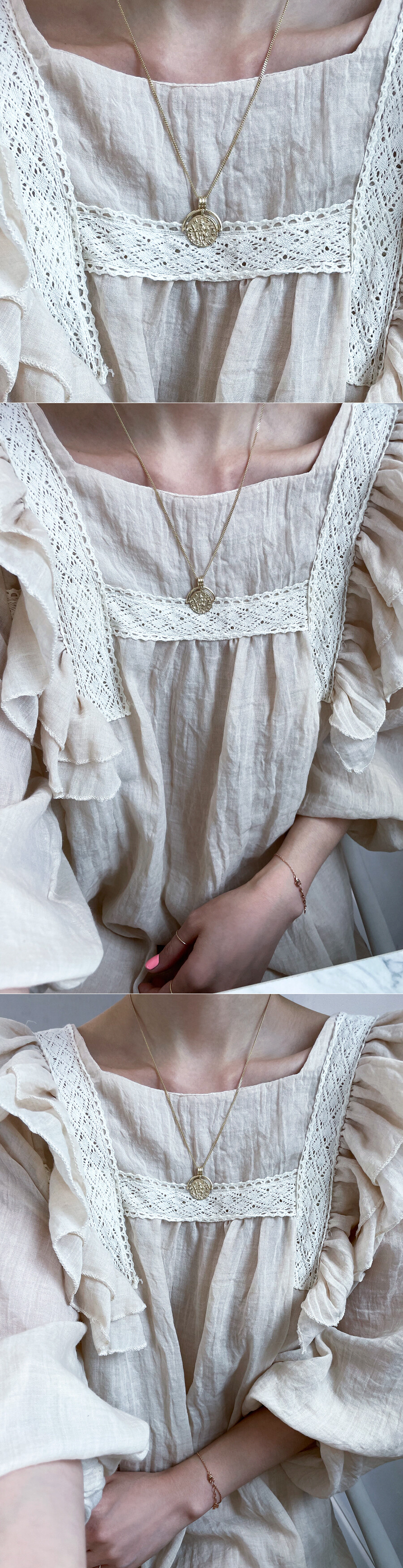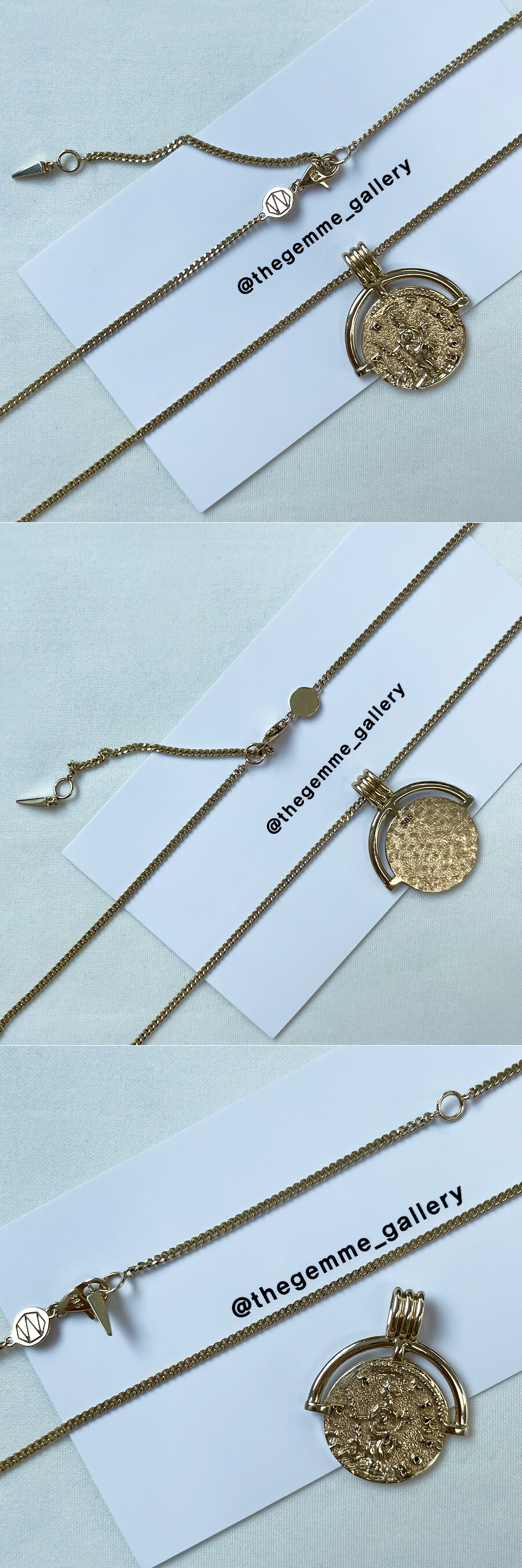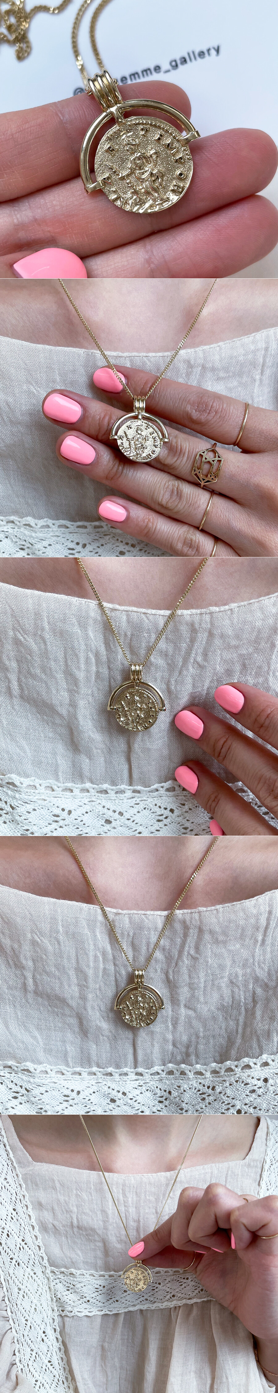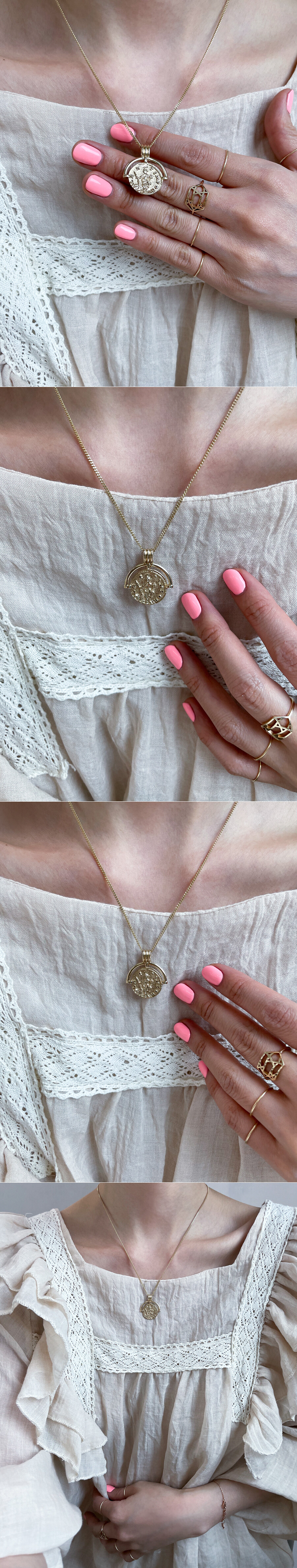 기하학 패턴 문양이 들어간 빈티지 느낌의 코인 목걸이입니다. 전체적으로 앤틱한 느낌이 물씬 풍기는 디자인으로 코인의 양면에 디자인이 들어가 있어요. 함께 레이어드 된 체인은 약 7푼 굵기 & 50CM (45CM 영고리 포함) 길이의 롱 체인입니다. (중량감이 있는 팬던트인데다가 고리 내폭도 커서 팬던트만 구매 시에는 최소 5푼 굵기의 체인과 함께 레이어드하시길 권장 드립니다.) 빈티지하고 세련된 디자인으로 어떤 코디에도 잘 어울리는 목걸이! 매일매일 착용하실 데일리용 포인트 목걸이를 찾으시는 분들께 추천해 드릴게요. * 기본 설정가는 (팬던트+체인) 으로 되어있습니다. * 팬던트만도 구매 가능 (옵션에서 선택해주세요.) * 기본 설정가는 14K 팬던트만 으로 되어있습니다. 자세한 가격은 옵션에서 사이즈 및 함량을 선택하셔서 확인해 주세요.