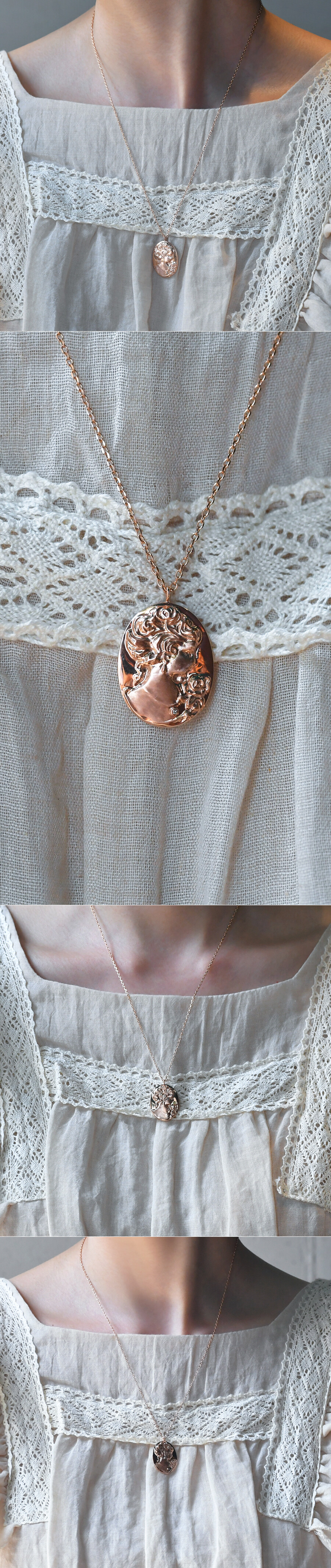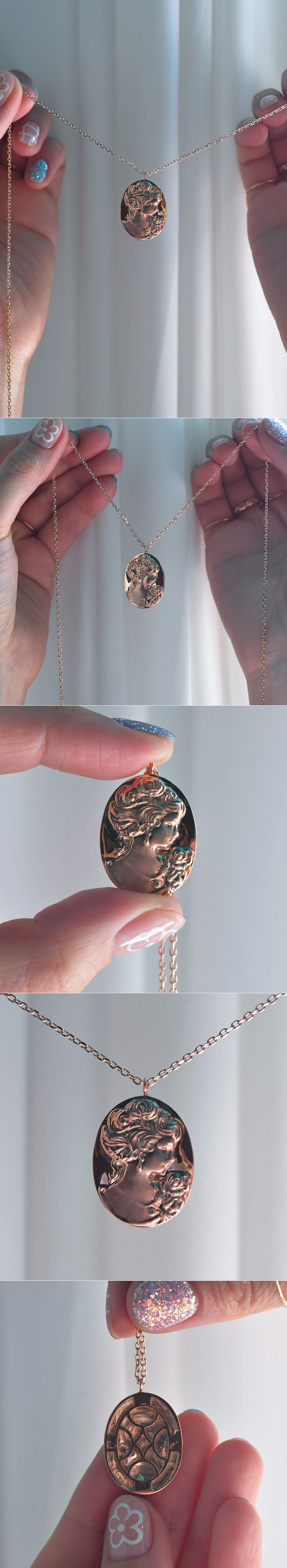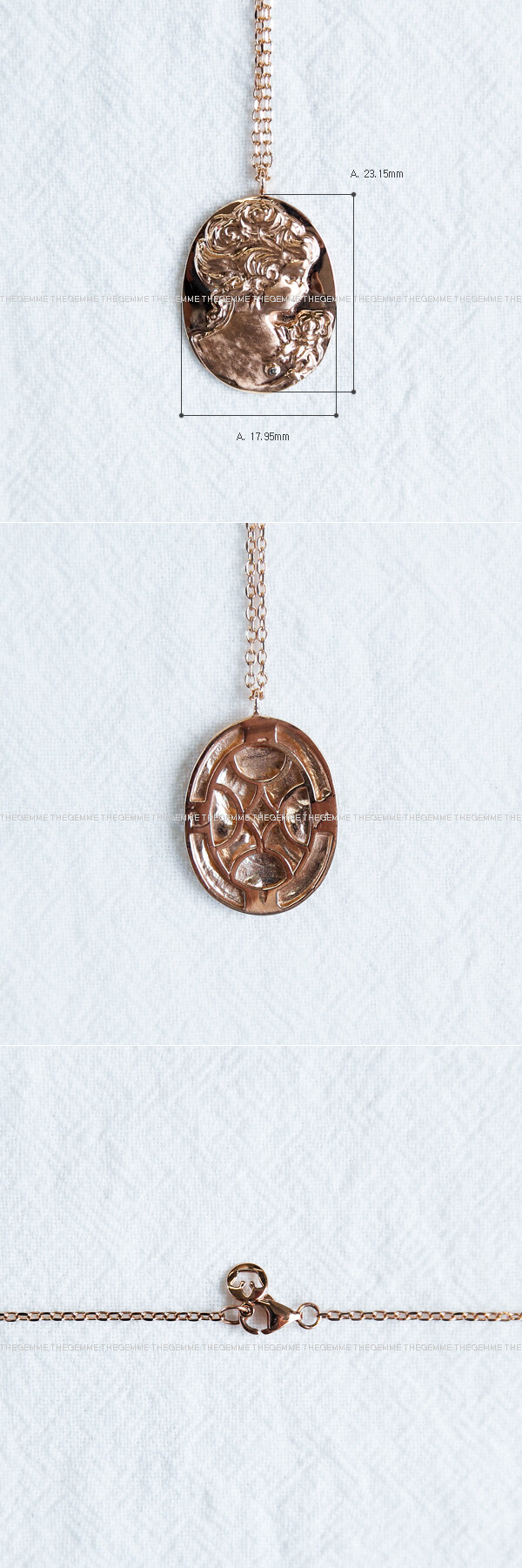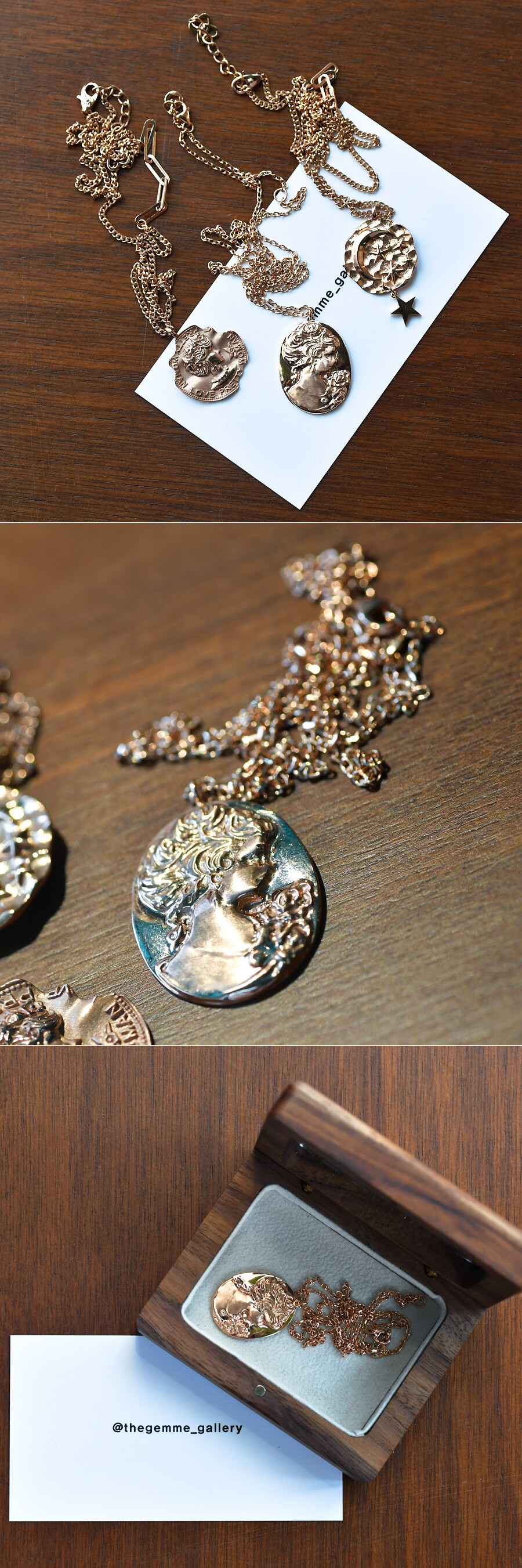 여성스러운 실루엣을 가진 코인 디자인의 롱 목걸이입니다. 팬던트 사이즈가 비교적 큰 편이라 롱 목걸이 스타일로 50CM가 기성으로 나온 디자인이에요 :) 이미지에도 같은 50CM 착용 이미지가 첨부되었으니 참고해 주시구요, 팬던트 메인은 여인의 옆모습이 양각으로 조각된 디자인입니다. 자세히 보시면 여인이 착용한 목걸이 팬던트 부분에 아주 작게 다이아몬드가 세팅되어 있어요. 브라운 계열의 코냑 다이아몬드라 크게 눈에 들어오지는 않지만 디테일한 반짝임이 숨어있답니다! (약간 눈에 띄는 색상의 다이아몬드로 변경하고 싶으신 분들께서는 다이아몬드 색상을 변경하실 수 있게 만들어 놓았으니 옵션에서 원하시는 색상의 다이아몬드로 선택해 주세요.) 조각 중 볼록한 양각 부분은 살짝 은은한 무광 느낌으로 샌딩 처리가 되어서 고급스러운 느낌이 한가득이에요. 전체적으로 앤틱한 느낌으로 코인의 앞면은 물론 뒷면에도 앤틱한 문양의 디자인이 들어가 있으니 페이지 가장 하단의 상세 이미지도 꼼꼼히 살펴봐주세요. 무게감은 14K 50CM 기준으로 했을 때 약 두 돈이 조금 안되는 중량으로 무게감이 있는 볼드한 디자인의 목걸이입니다! 어떤 옷차림에도 잘 어울리는 디자인이라 데일리용 포인트 목걸이로 추천해 드릴게요 :)