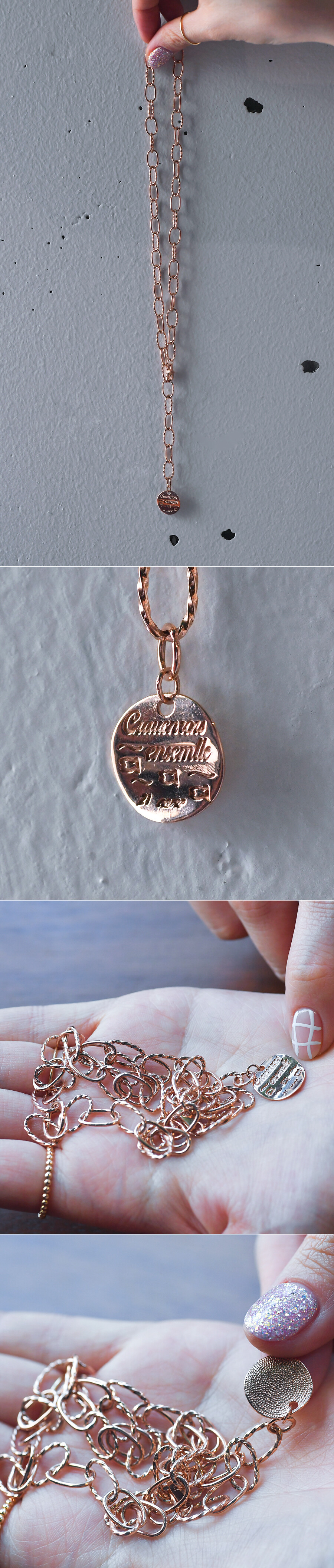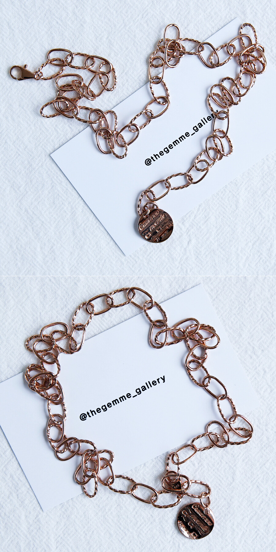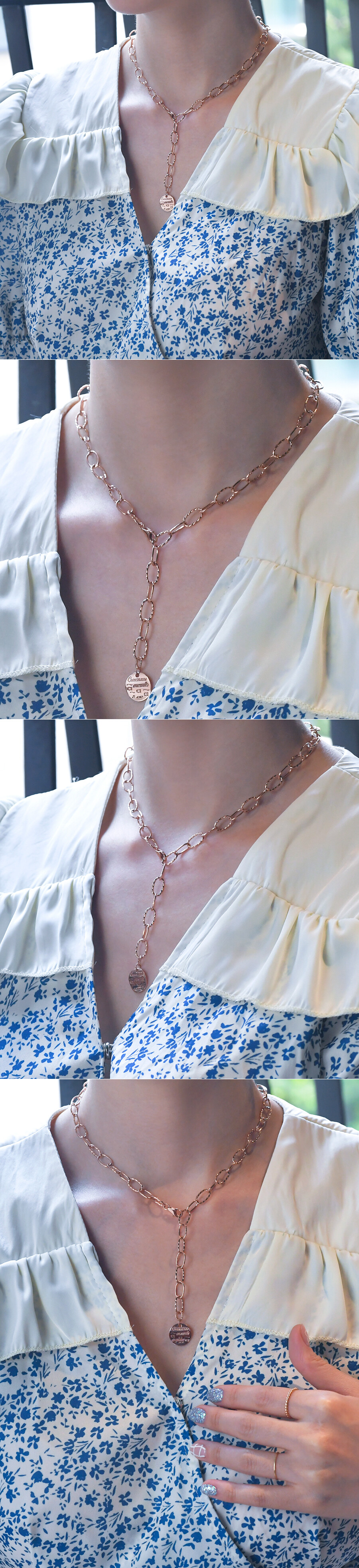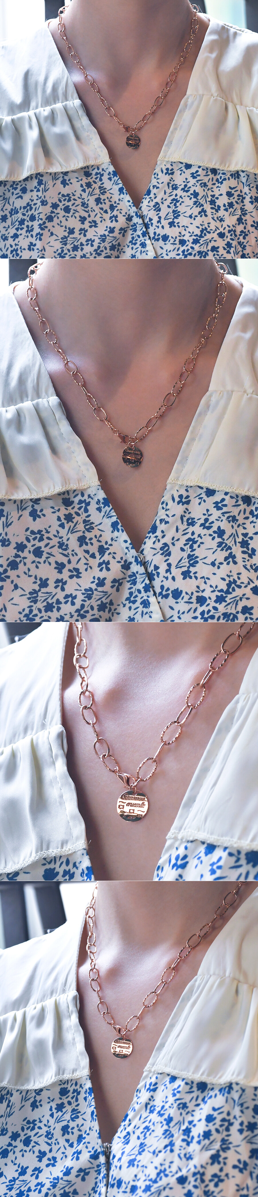 영문 레터링 각인이 들어간 유니크한 웨이브 코인 디자인의 목걸이입니다. 볼드한 오벌 체인과 함께 레이어드 된 디자인으로 중량감이 다소 나가는 편입니다. 촬영된 목걸이 사이즈는 약 45CM 길이로 촬영되었어요. (기성 사이즈는 42CM입니다.) 볼드한 스타일의 데일리 및 포인트 목걸이를 찾으시는 분들에게 추천해 드릴게요 :)