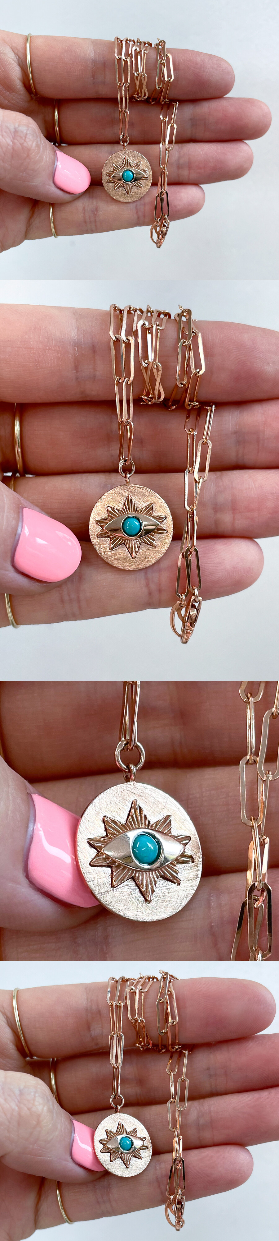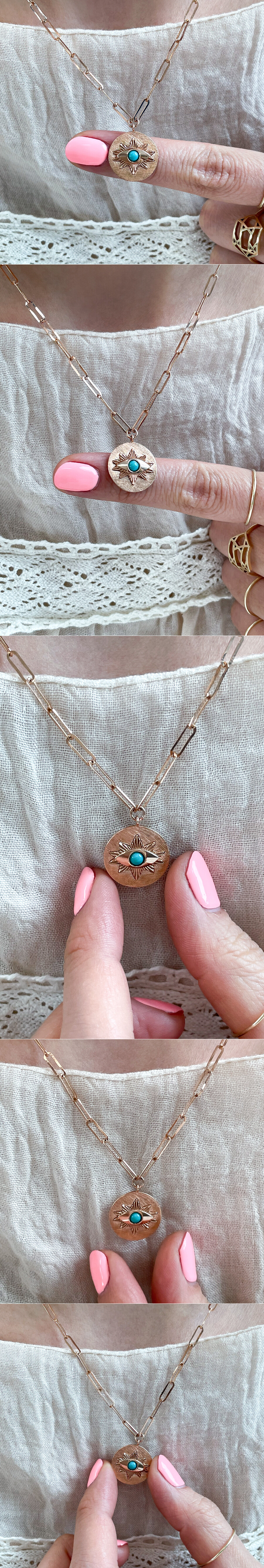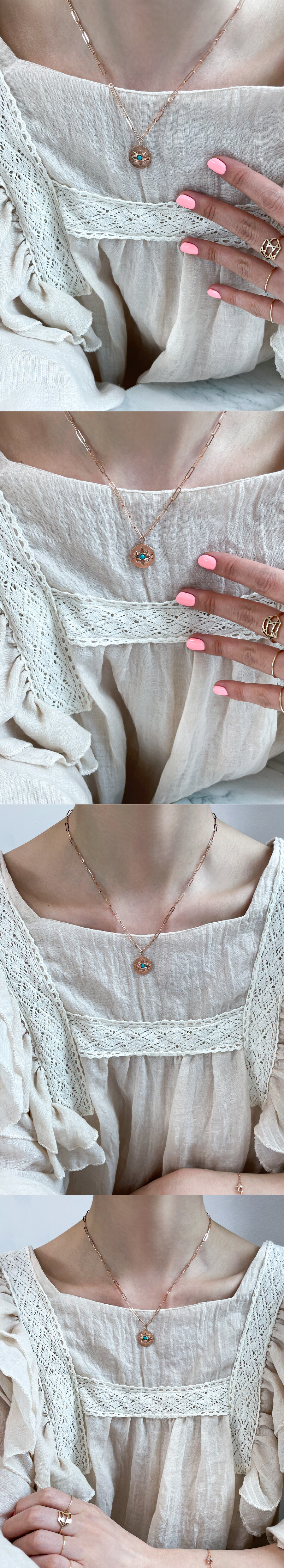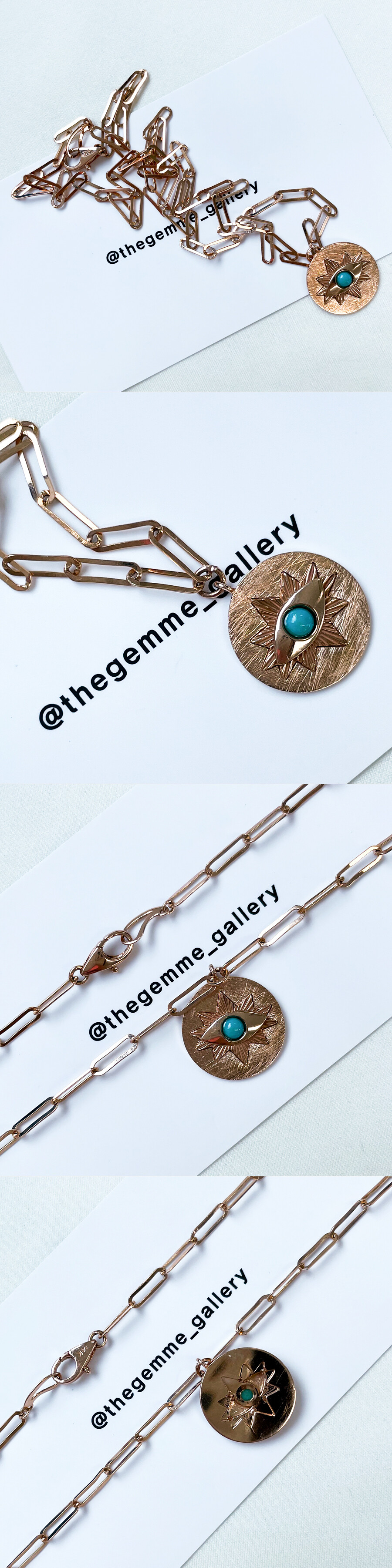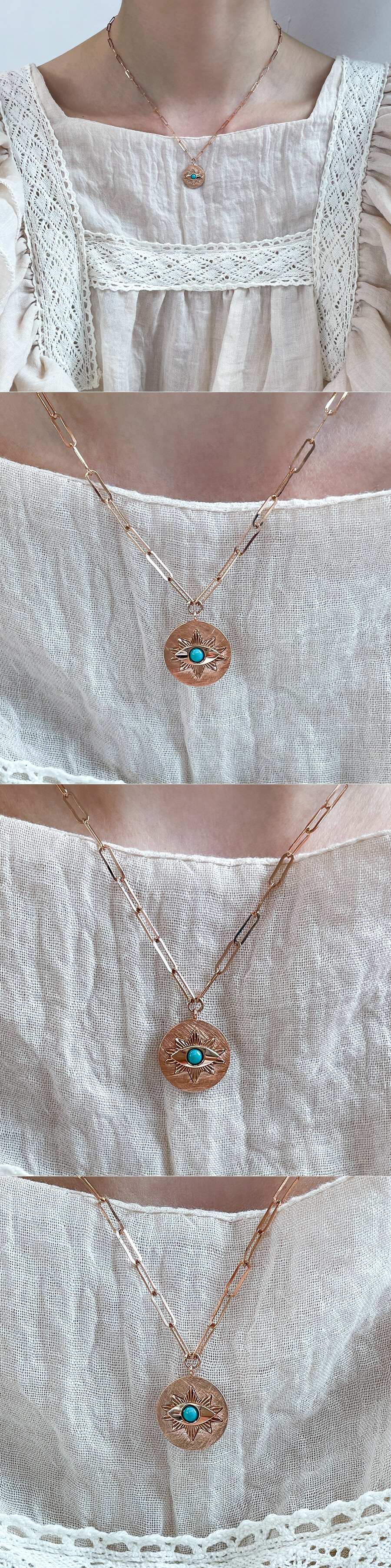태양의 눈을 모티브로 제작된 유니크하고 앤틱한 디자인의 코인 목걸이입니다. 태양의 중앙 부분에는 12월의 탄생석으로 알려진 캐보션 타입의 터쿼이즈가 세팅되었어요. 💙 또 코인의 바탕 부분에는 마치 도구로 긁어놓은듯한 무광 처리로 마감되어서 고급스러우면서도 앤틱한 느낌이 물~씬 풍기는 디자인랍니다. 전체적으로 클립 체인과 함께 레이어드 되어서 볼드한 중량감을 가지는 아이에요. (체인의 경우, 꼭 잠금 장식 부분이 아니더라도 클립 부분에 걸어서 초커 스타일의 목걸이로도 착용이 가능하니 참고해 주세요.) 멋스럽고 볼드한 느낌의 목걸이를 찾으시는 분들에게 추천해 드릴게요 :) 💖