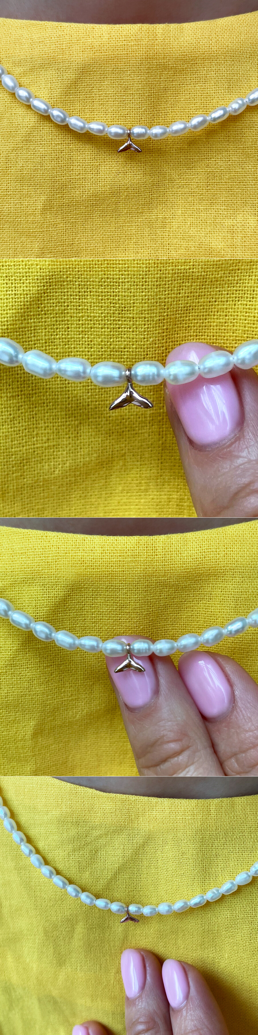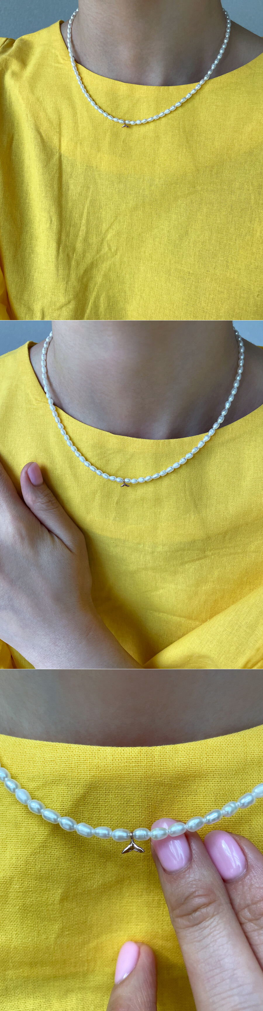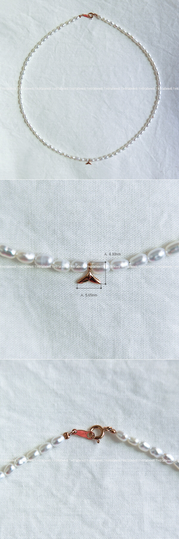 귀여운 미니 사이즈의 고래꼬리 팬던트 장식이 달린 담수진주 목걸이입니다. 진주는 화이트 바디에 핑크~그레이 오버톤이 맴도는 밥풀 모양의 못난이 담수진주에요. 캐주얼한 이미지라 어떤 옷차림에도 잘 어울려서 포인트 및 레이어드 목걸이로 활용하기에 너무 좋은 목걸이가 되어줄 것 같아요. 와이어로 꿰어놓은 목걸이라 라인이 동그랗게 딱 나오기 때문에 초커 스타일로 약간 짧게 착용하시는 것도 너무 예쁘구요, 보통 목걸이 기성 사이즈인 42CM 길이로 착용하셔도 너무너무 예쁘답니다. 촬영 이미지는 기본 40CM 길이의 초커스타일로 촬영된 사진이에요. 촬영하면서 다른 목걸이들과도 레이어드를 해보았는데 여기저기 다 잘 어울렸어요, 굿굿 :) 블링블링하면서 귀여운 이미지의 목걸이를 찾으시는 분들에게 적극 추천해 드릴게요. 💖 (사진상 모델 목둘레 약 31~32CM로 많이 얇은 편이니 참고해 주세요.)