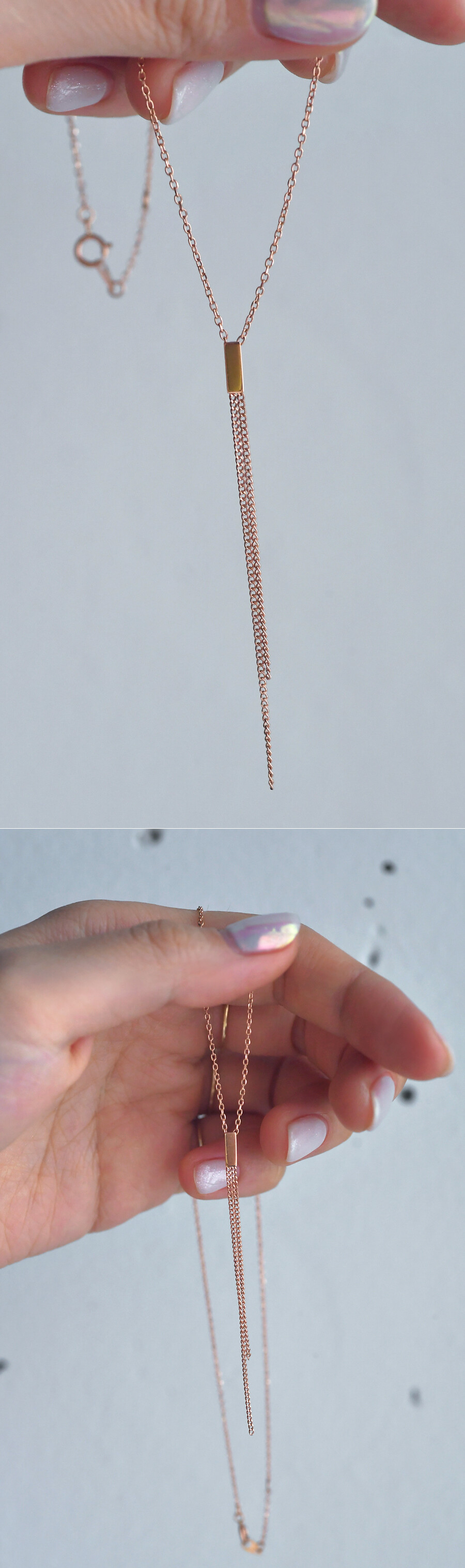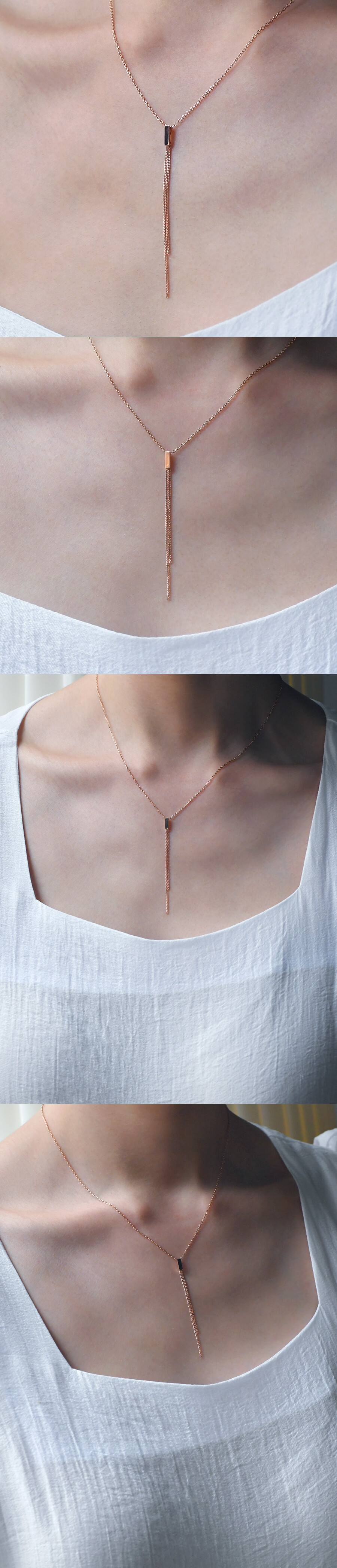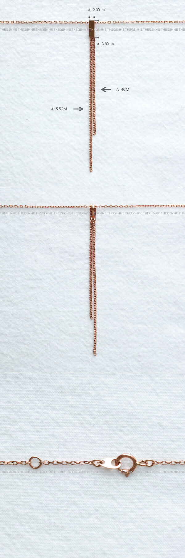 미니미한 사이즈의 태슬 목걸이입니다. 작은 미니바 장식에 각각 다른 모양과 다른 길이를 가진 두 개의 체인이 하늘하늘한 느낌으로 달려있어요. 자연스럽고 세련된 태슬 디자인의 체인 장식으로 여리여리한 느낌의 포인트 목걸이로 추천해 드려요! ♥