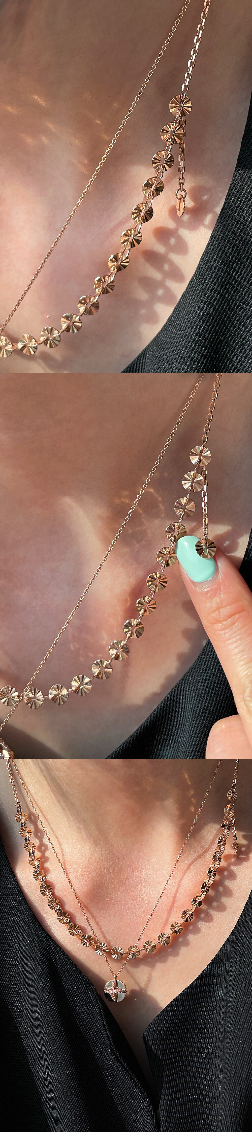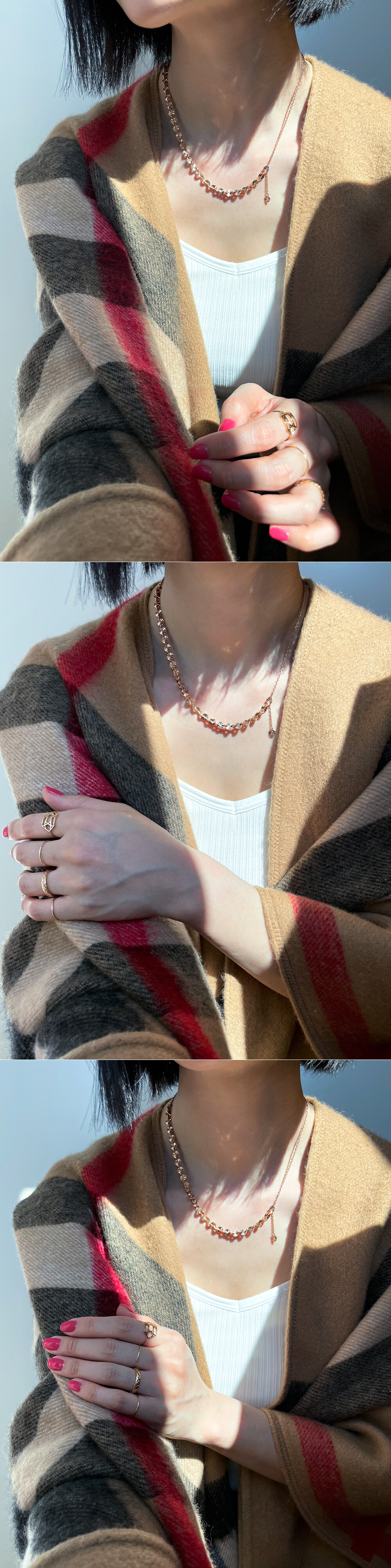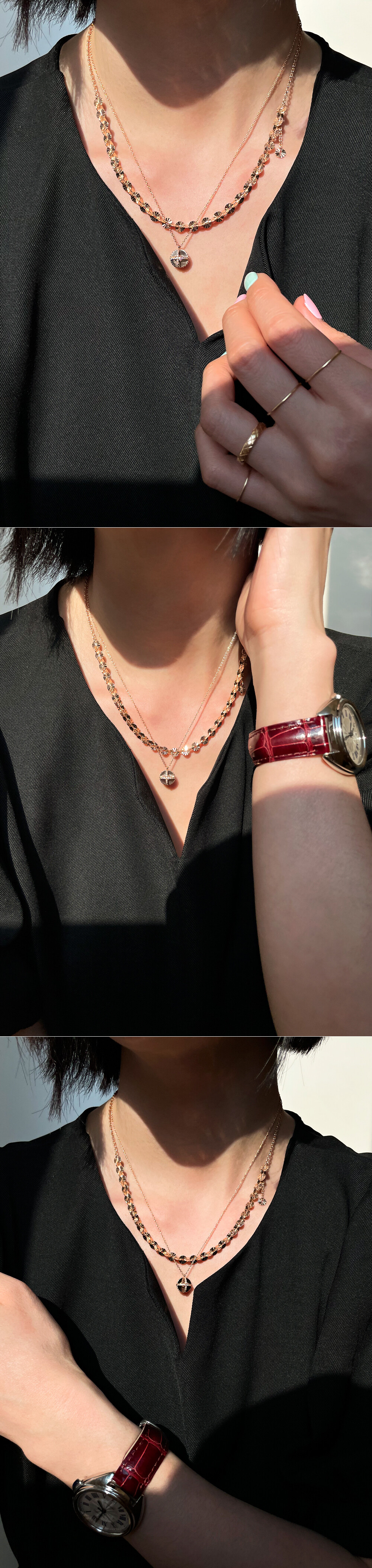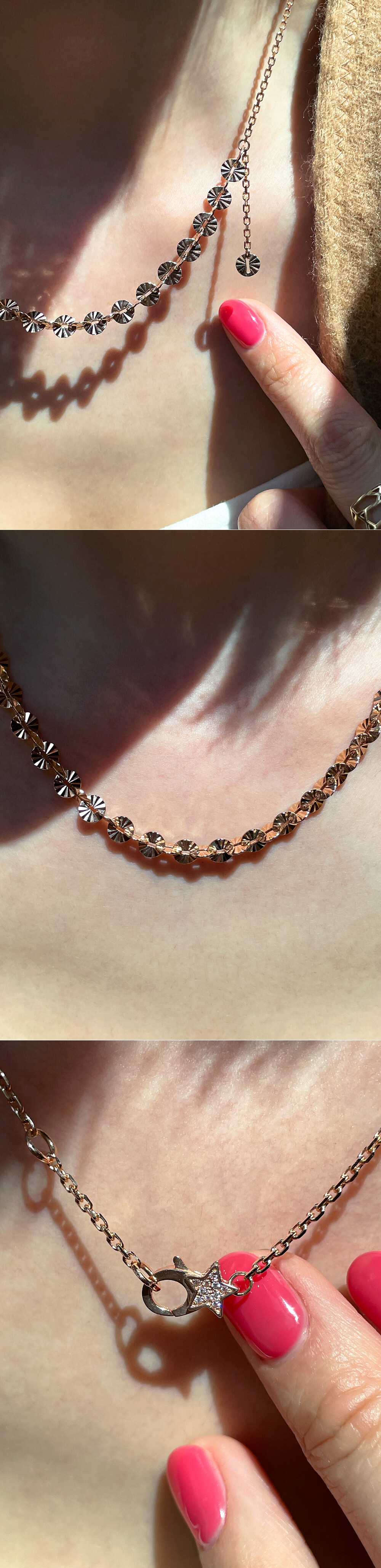 팅클팅클, ✨ 각도에 따라 반짝이는 빛이 유독 눈에 들어오는 디자인의 목걸이입니다. 동그랗고 플랫한 원형의 코인 디자인이 십자 형태로 볼륨감 있게 연결된 링크 목걸이에요. 사이드 부분에는 체인이 달린 드롭 스타일 팬던트가 포인트로 들어가 있구요, 잠금 장식 부분에는 깜찍한 별 모양 디자인이 들어간 붕어 장식이 있답니다! 붕어 장식은 기본 붕어 장식보다 2배 정도 사이즈가 더 큰 장식이에요. 🤩 전체적으로 유니크한 느낌이 강하죠? 중량감이 높아서 착용 시 묵직~한 느낌이 있어요. 볼륨감이 넘쳐서 존재감 확실한 목걸이 ... 볼드한 초커 스타일 목걸이로 착용하셔도 예쁠 것 같아요. 중앙 부분을 제외한 잠금 장식까지 연결된 체인은 각줄이구요, 약 7푼 정도 굵기의 체인입니다. 굵직굵직한 목걸이를 좋아하시는 분들에게 추천해 드릴게요, !🙌🏼💖