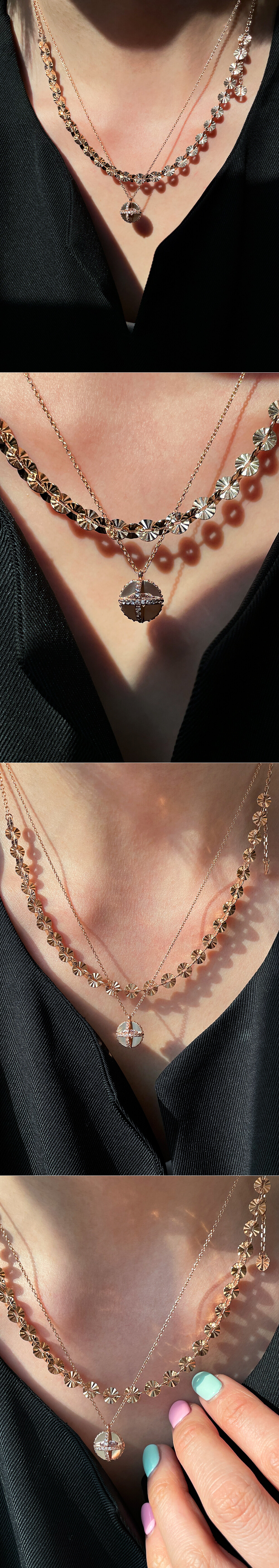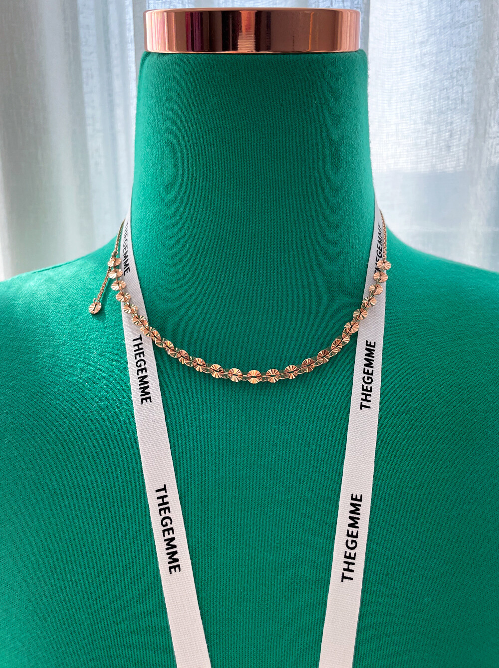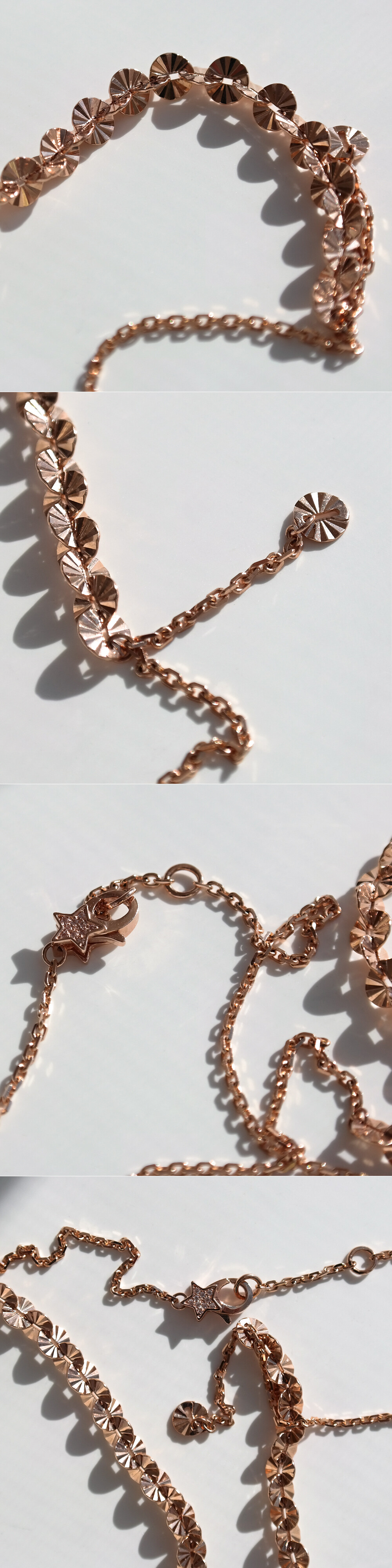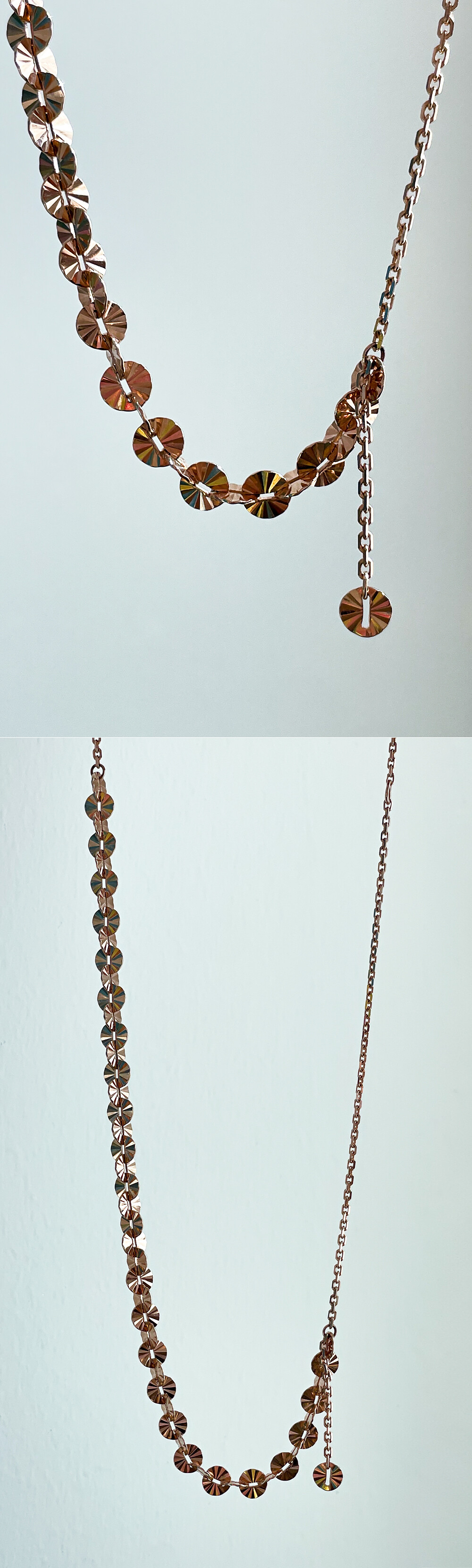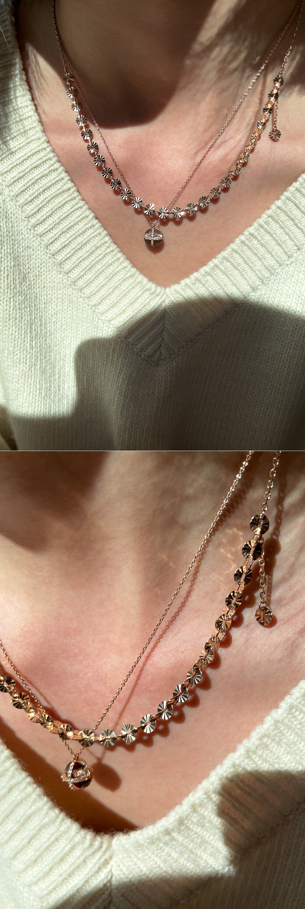 팅클팅클, ✨ 각도에 따라 반짝이는 빛이 유독 눈에 들어오는 디자인의 목걸이입니다. 동그랗고 플랫한 원형의 코인 디자인이 십자 형태로 볼륨감 있게 연결된 링크 목걸이에요. 사이드 부분에는 체인이 달린 드롭 스타일 팬던트가 포인트로 들어가 있구요, 잠금 장식 부분에는 깜찍한 별 모양 디자인이 들어간 붕어 장식이 있답니다! 붕어 장식은 기본 붕어 장식보다 2배 정도 사이즈가 더 큰 장식이에요. 🤩 전체적으로 유니크한 느낌이 강하죠? 중량감이 높아서 착용 시 묵직~한 느낌이 있어요. 볼륨감이 넘쳐서 존재감 확실한 목걸이 ... 볼드한 초커 스타일 목걸이로 착용하셔도 예쁠 것 같아요. 중앙 부분을 제외한 잠금 장식까지 연결된 체인은 각줄이구요, 약 7푼 정도 굵기의 체인입니다. 굵직굵직한 목걸이를 좋아하시는 분들에게 추천해 드릴게요, !🙌🏼💖